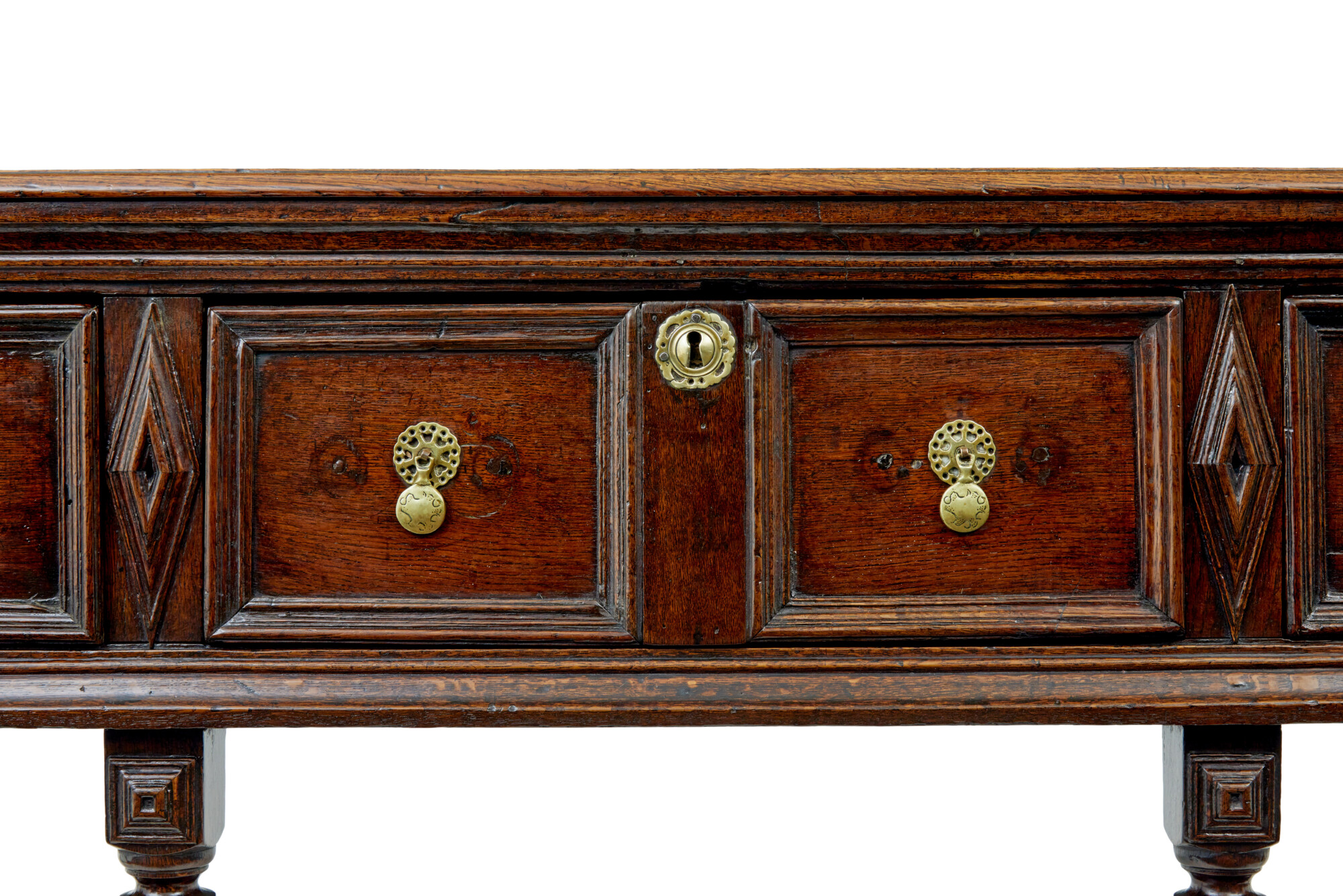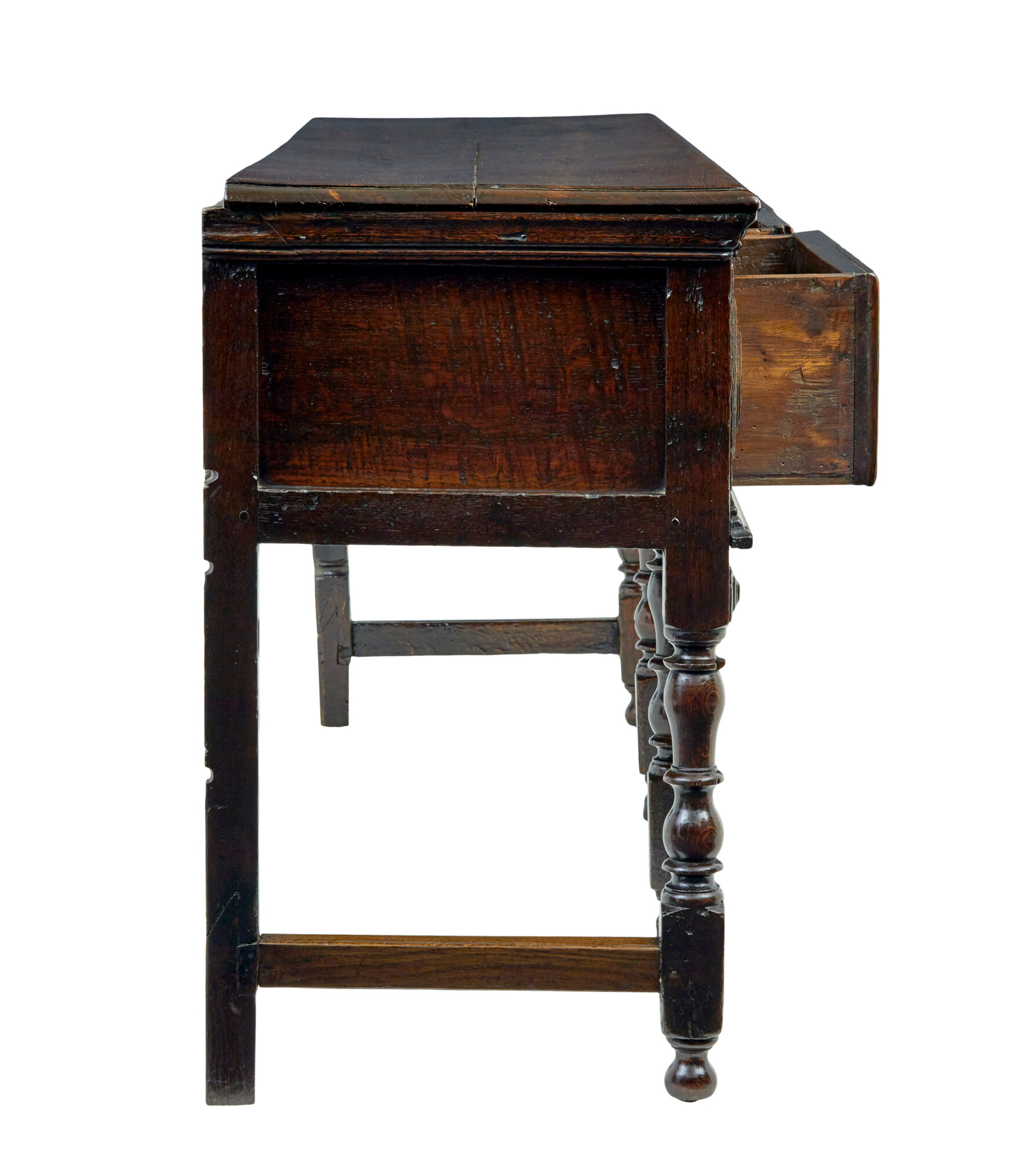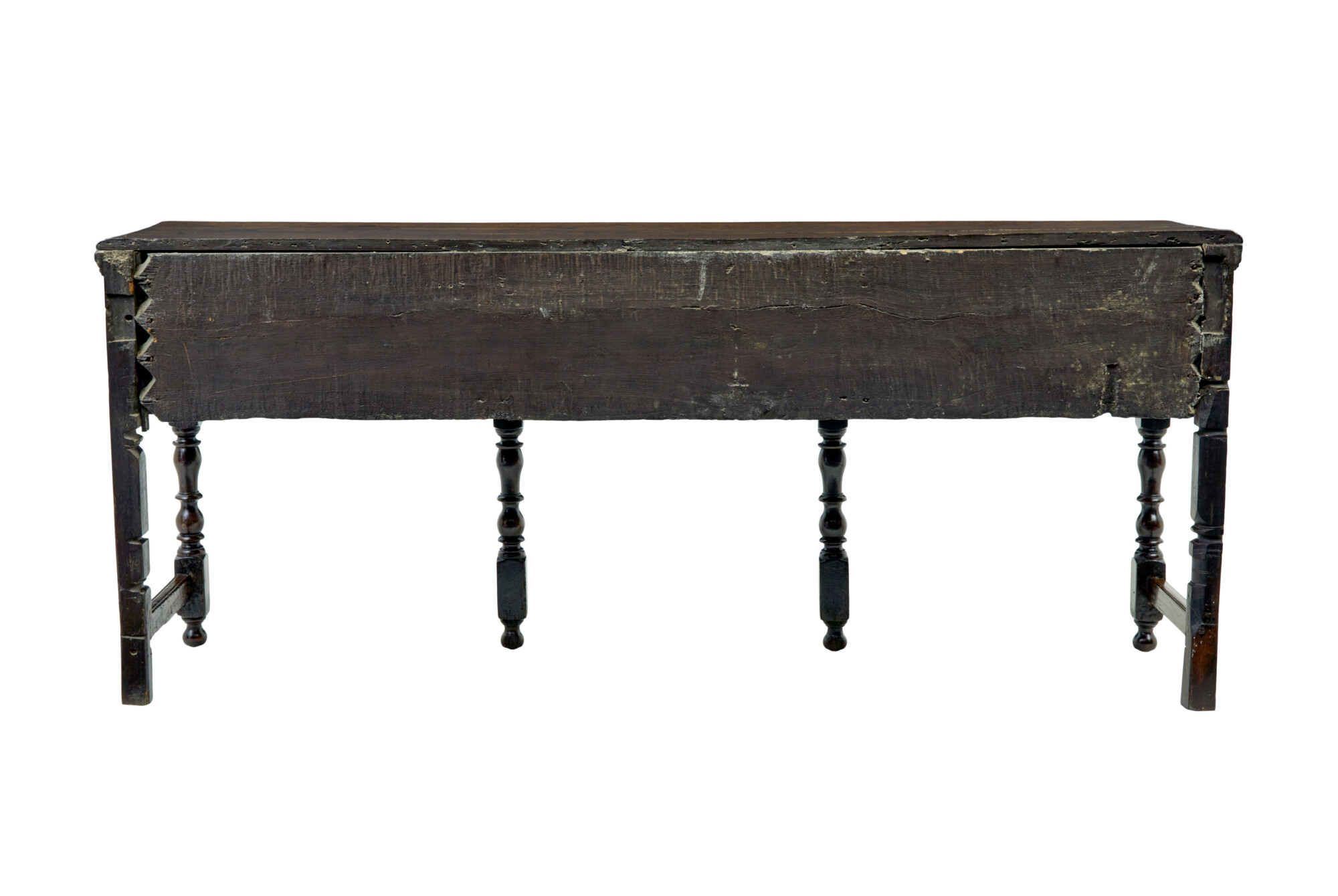 2 PLANK TOP WITH MOULDED EDGE, FITTED WITH 3 DEEP DRAWERS BELOW THE TOP SURFACE, COMPLETE WITH BRASS HARDWARE, WHICH WOULD HAVE BEEN A 19TH CENTURY ALTERATION. STANDING ON 6 TURNED LEGS, WITH THE SIDE LEGS BEING SUPPORTED BY A LOW STRETCHER. GOOD COLOUR AND PATINA.