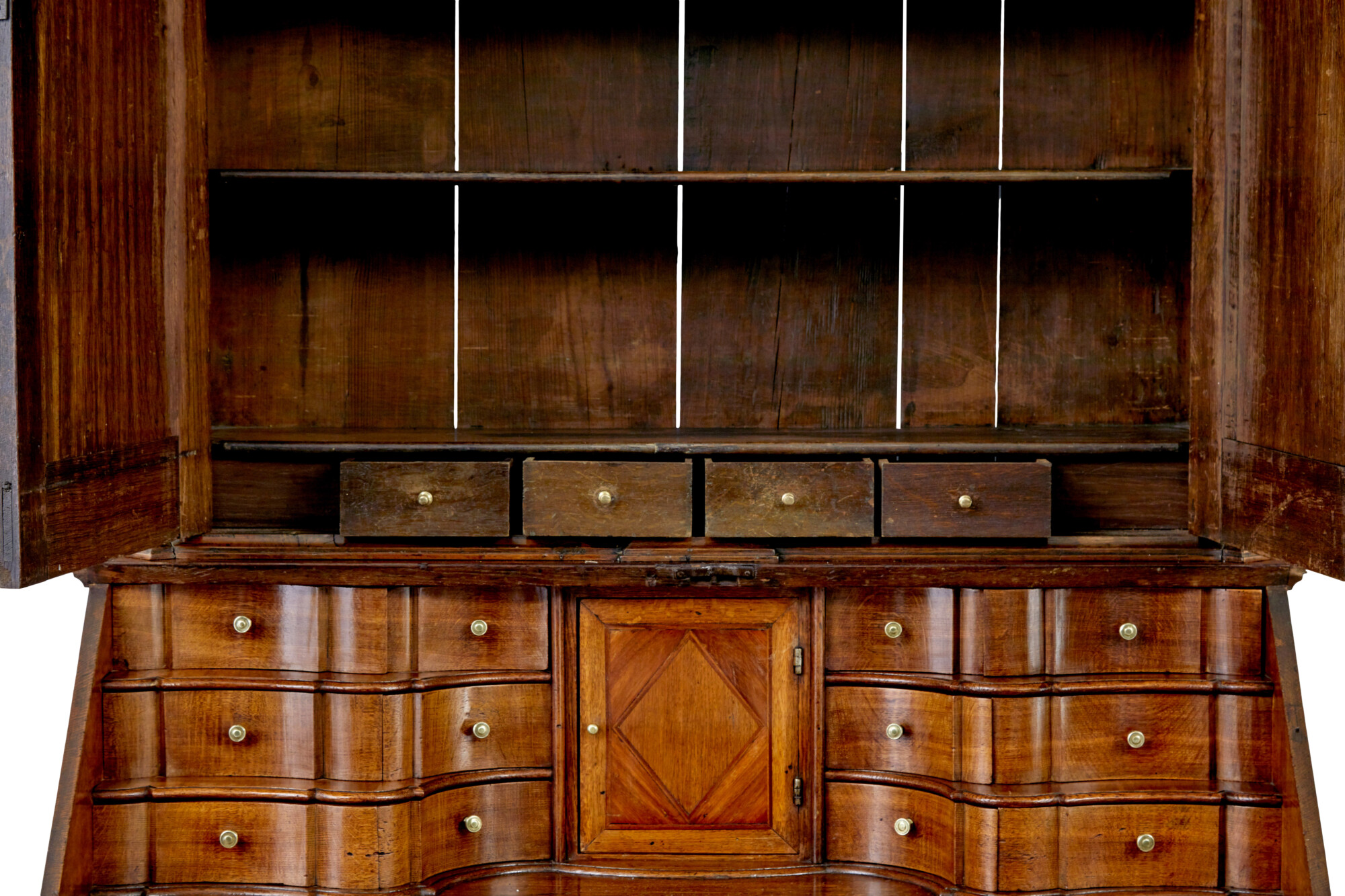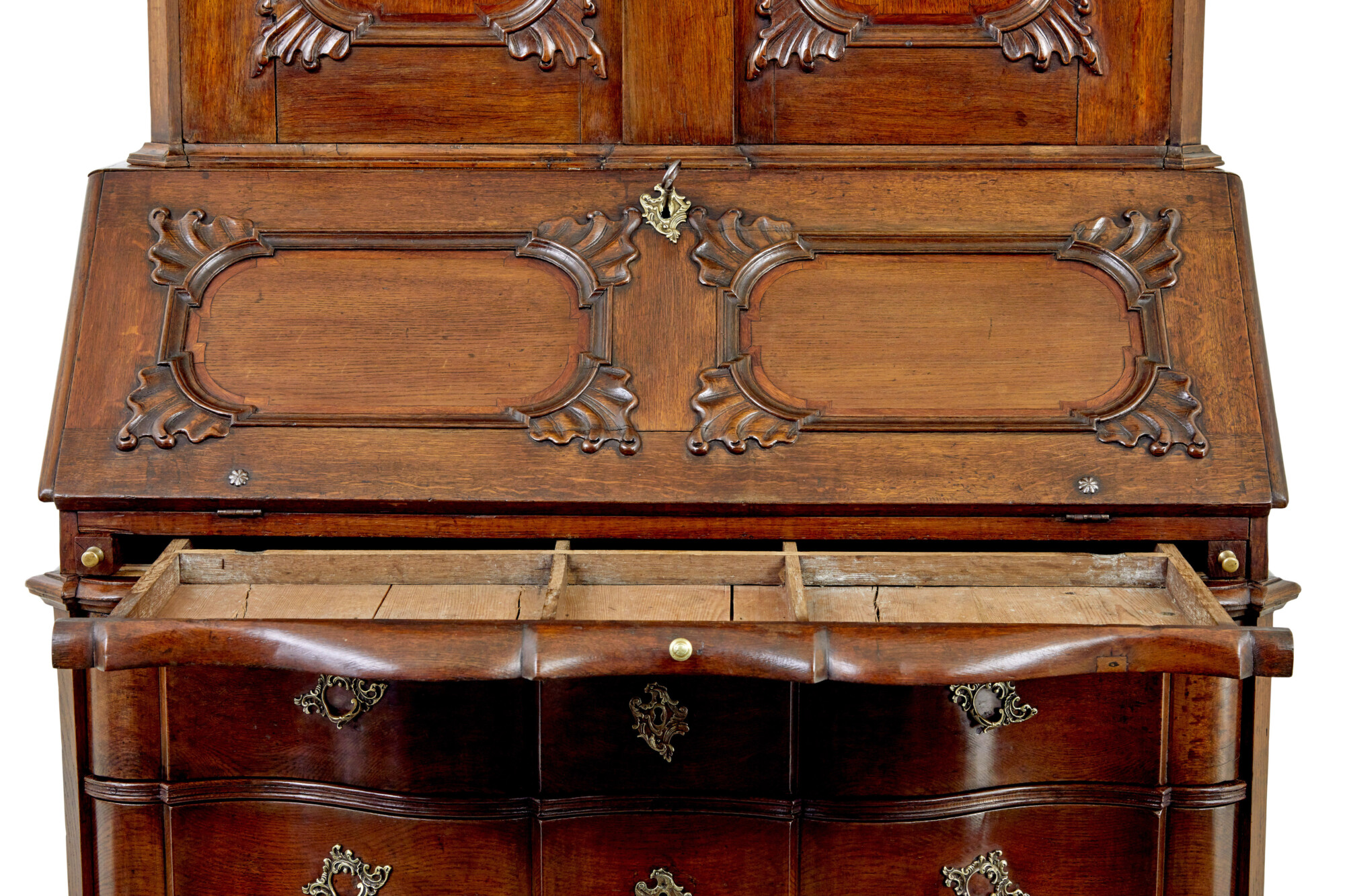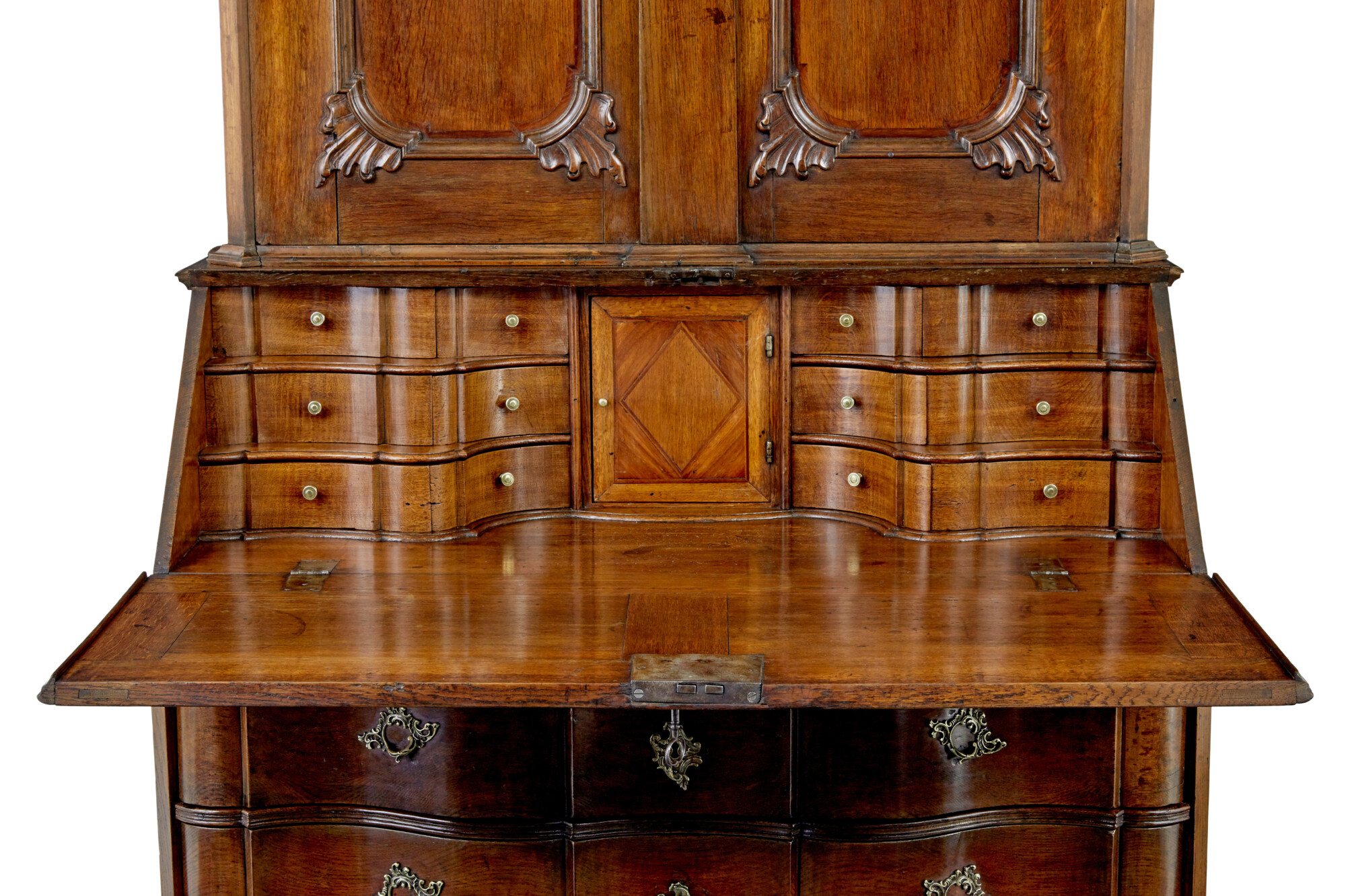 TOP SECTION WITH SHAPED CORNICE, BELOW WHICH THE CARVED DOUBLE DOORS OPEN TO 5 SHELVES AND 4 FITTED DRAWERS. FALL FRONT WITH MATCHING CARVINGS OPENS TO REVEAL A FULLY FITTED INTERIOR. SHAPED INTERIOR WITH CENTRAL TABERNACLE CONTAINING 8 FITTED DRAWERS FLANKED EITHER SIDE BY 6 SHAPED DRAWERS.