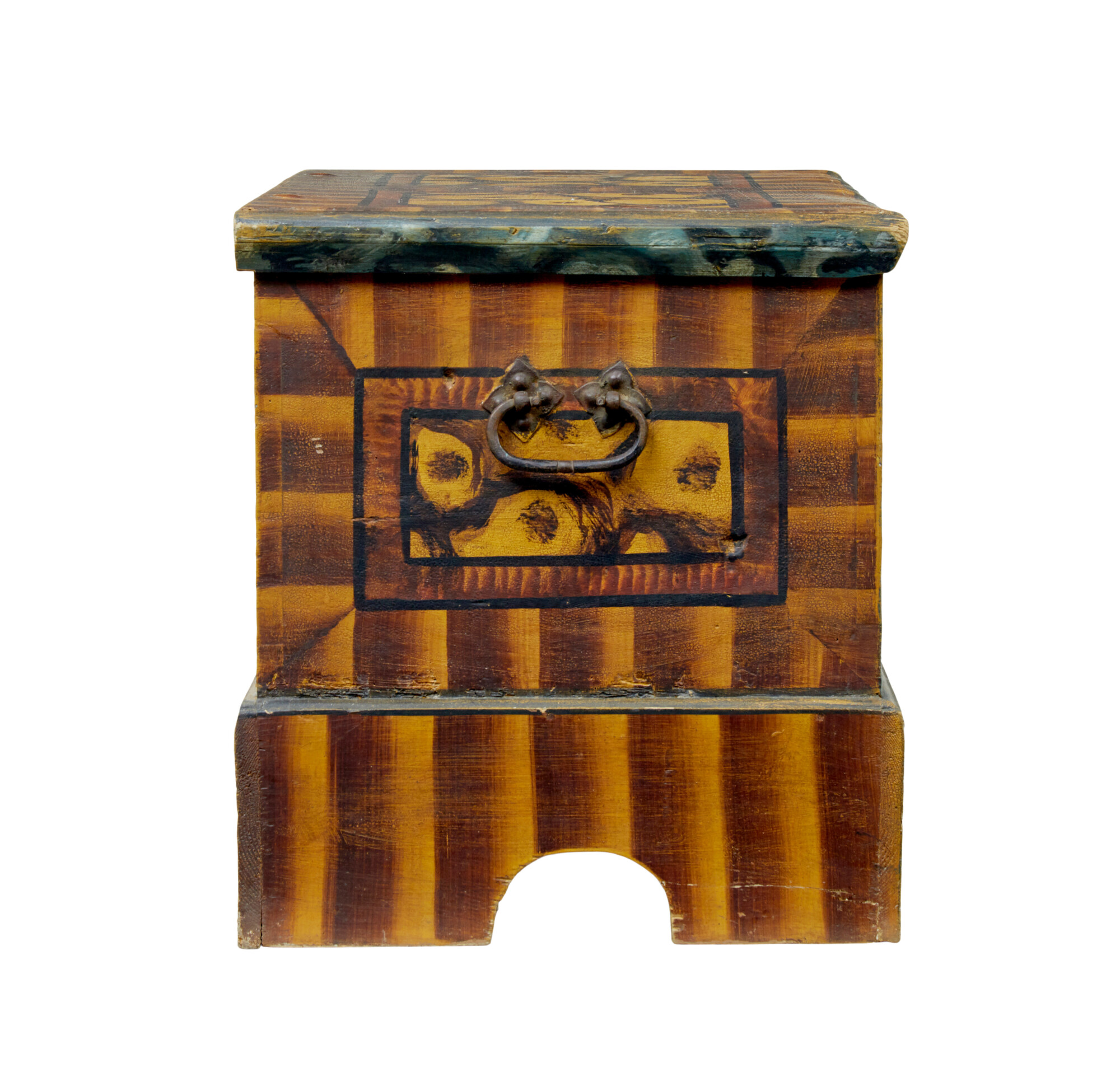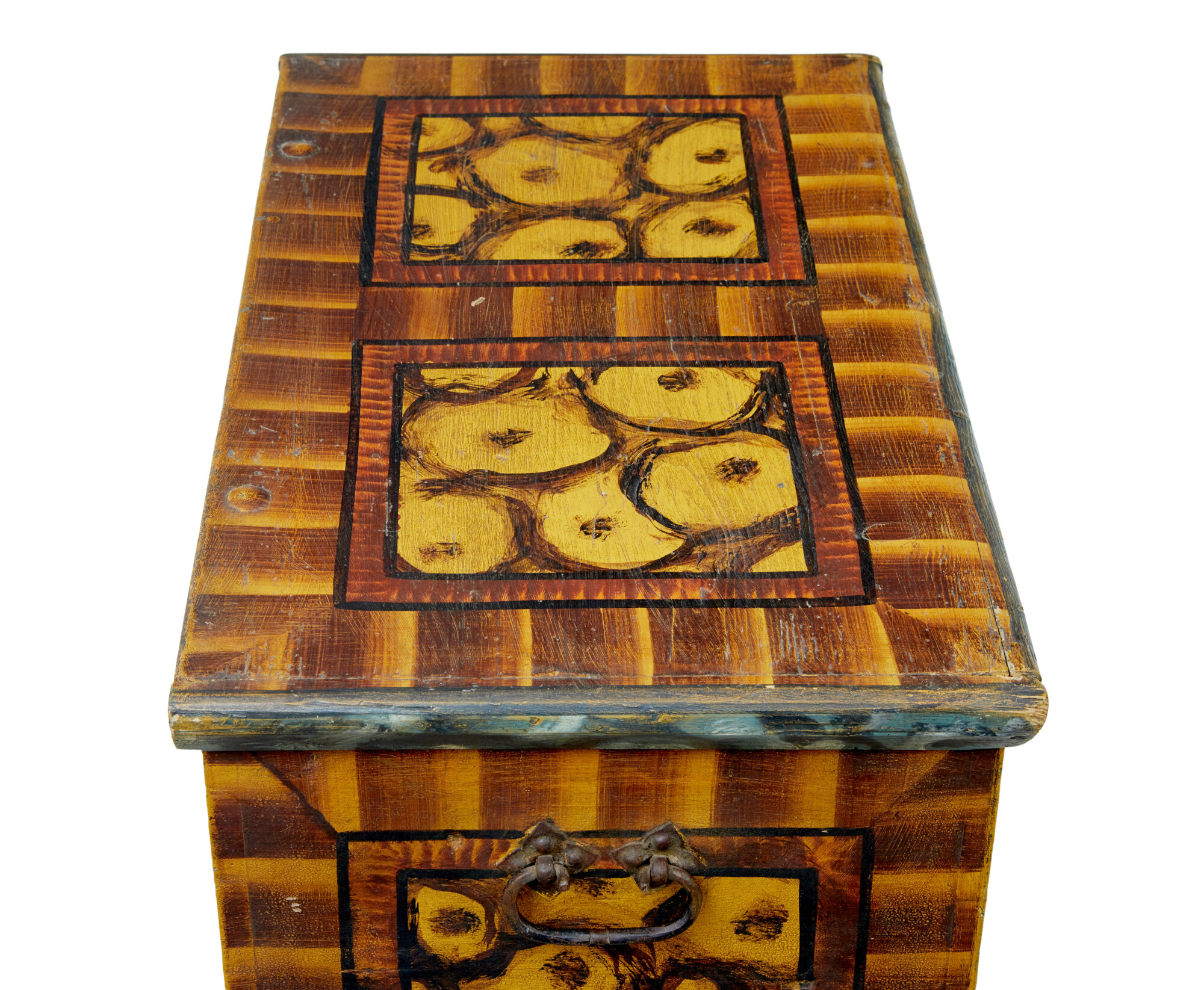 HERE WE HAVE A MARRIAGE CHEST WHICH IS LIKELY TO BE FROM SWITZERLAND. USING A MUCH EARLIER PINE CHEST THIS PIECE HAD ADDED FEET AND THEN HAND PAINTED.