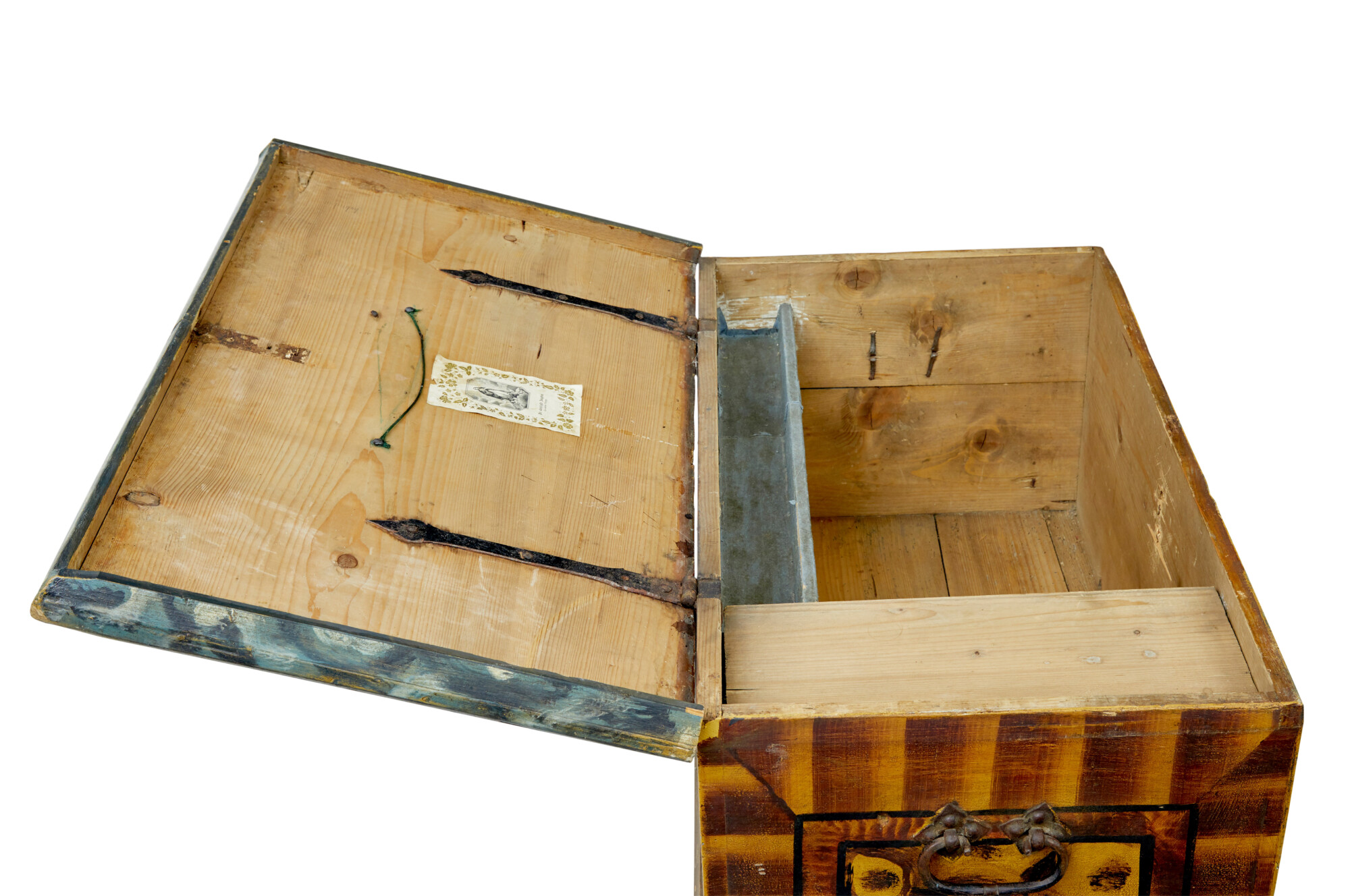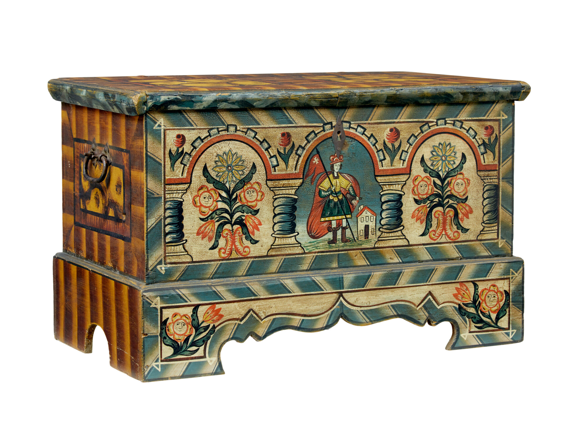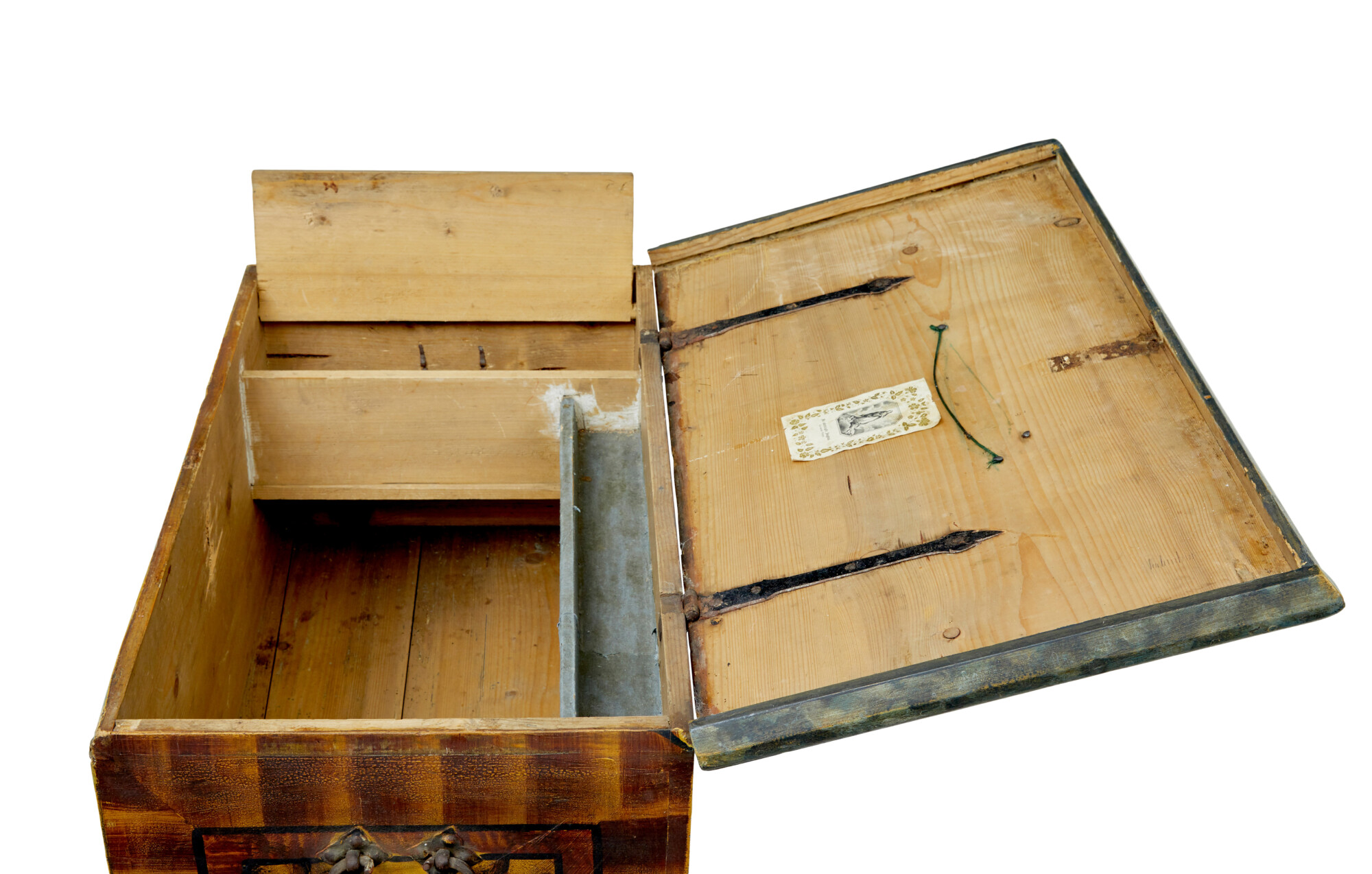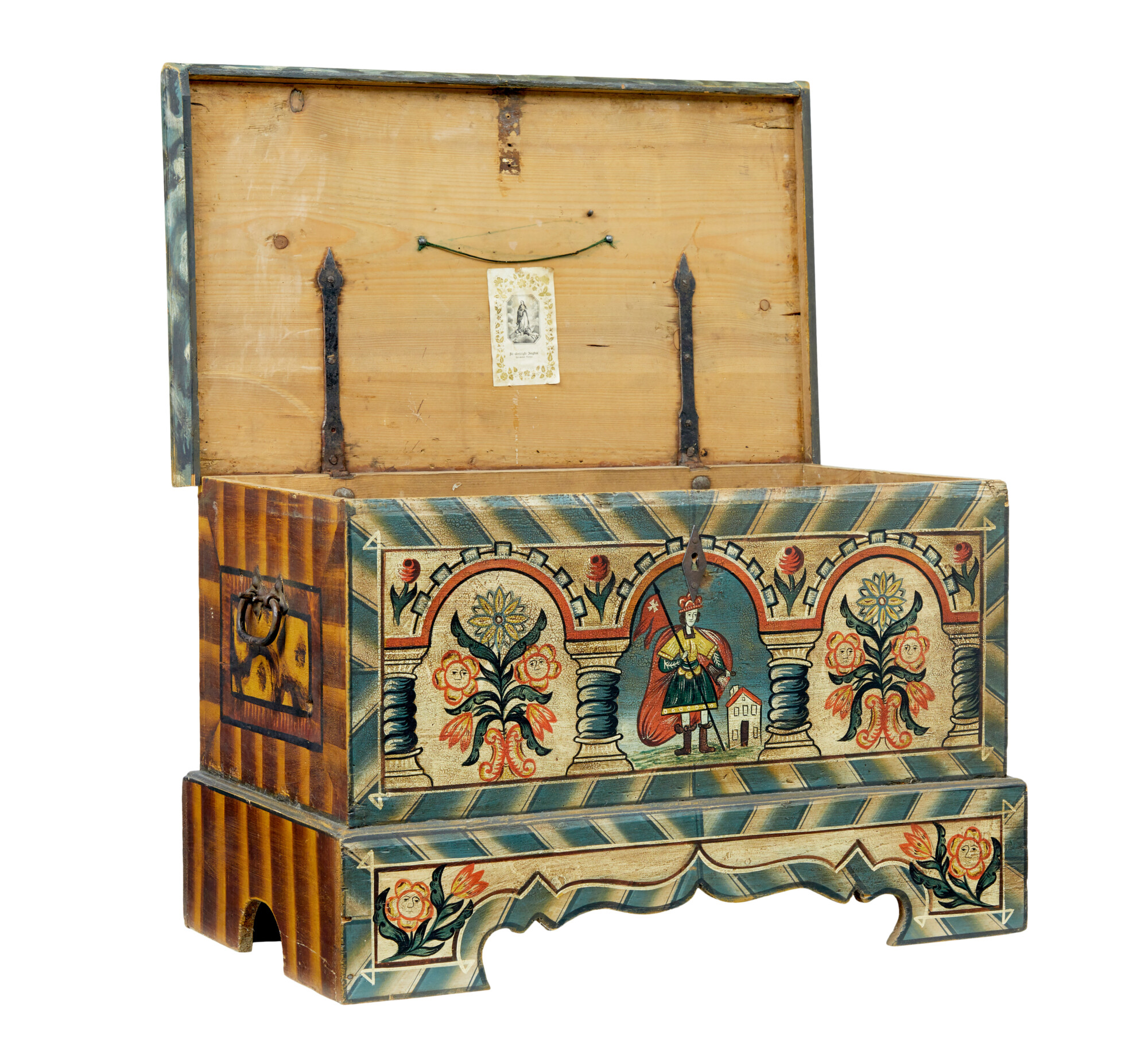 CENTRAL PAINTED FIGURE HOLDING A SWISS FLAG, FLANKED EITHER SIDE BY SUNFLOWERS WITH FACES AND ROSES. SIDES PAINTED IN AN ORANGE AND BROWN SCHEME AND ORIGINAL CARRYING HANDLES. LID TOP WITH SAME COLOURS AS THE SIDES, OPENS TO REVEAL A PARTIALLY FITTED INTERIOR OF A CANDLE BOX AND TRAY. ‘BLESSED VIRGIN’ PRINT STILL IN PLACE ON THE LID.