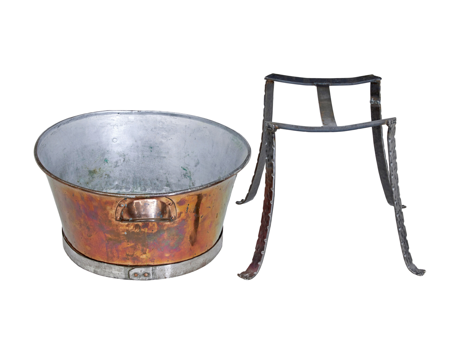 COPPER PAIL ON LATER HAND MADE STEEL STAND. IDEAL FOR USE AS A FIRESIDE KINDLING OR LOG BIN.
