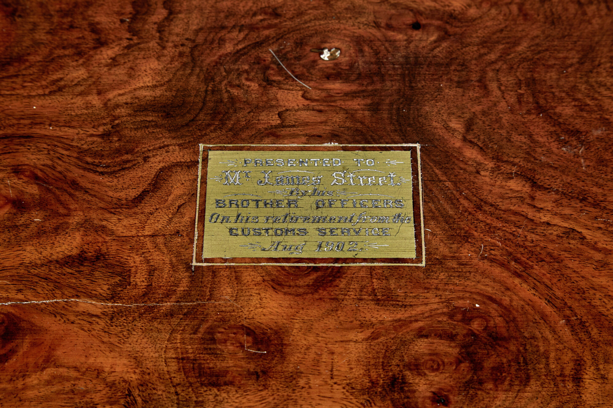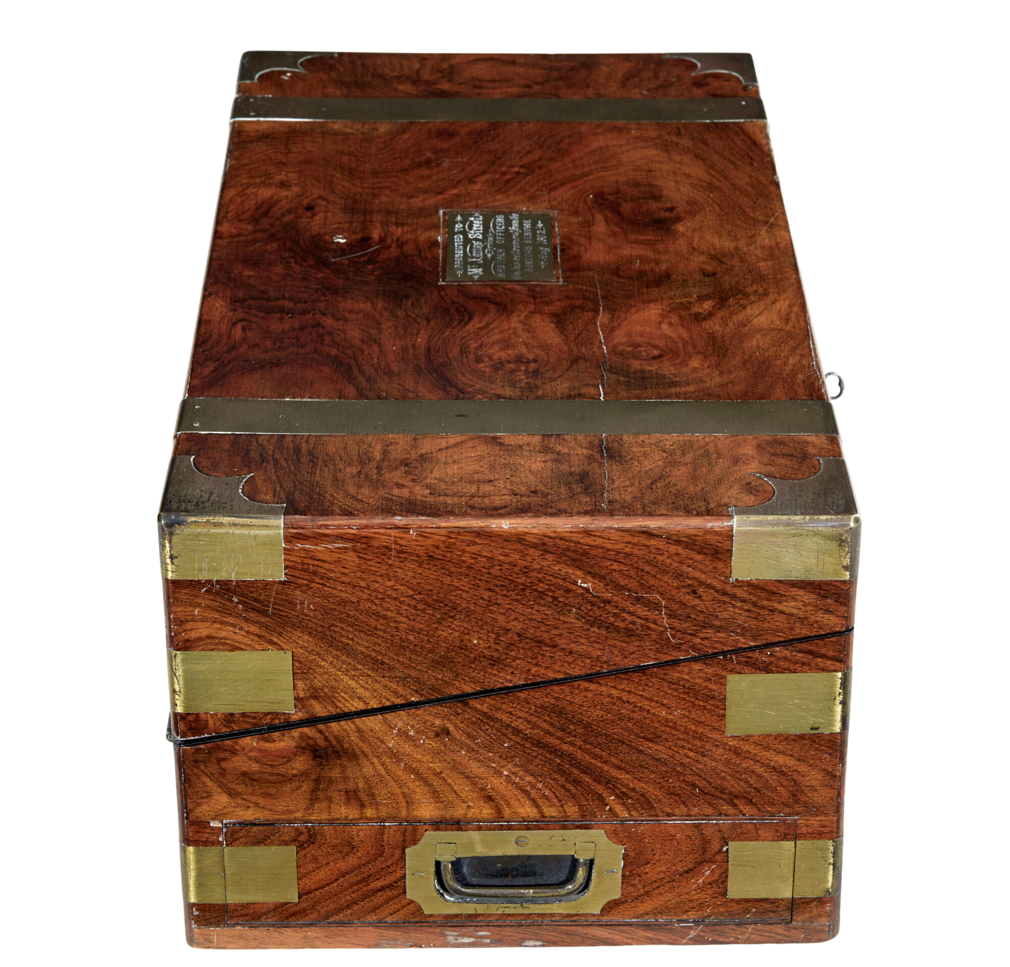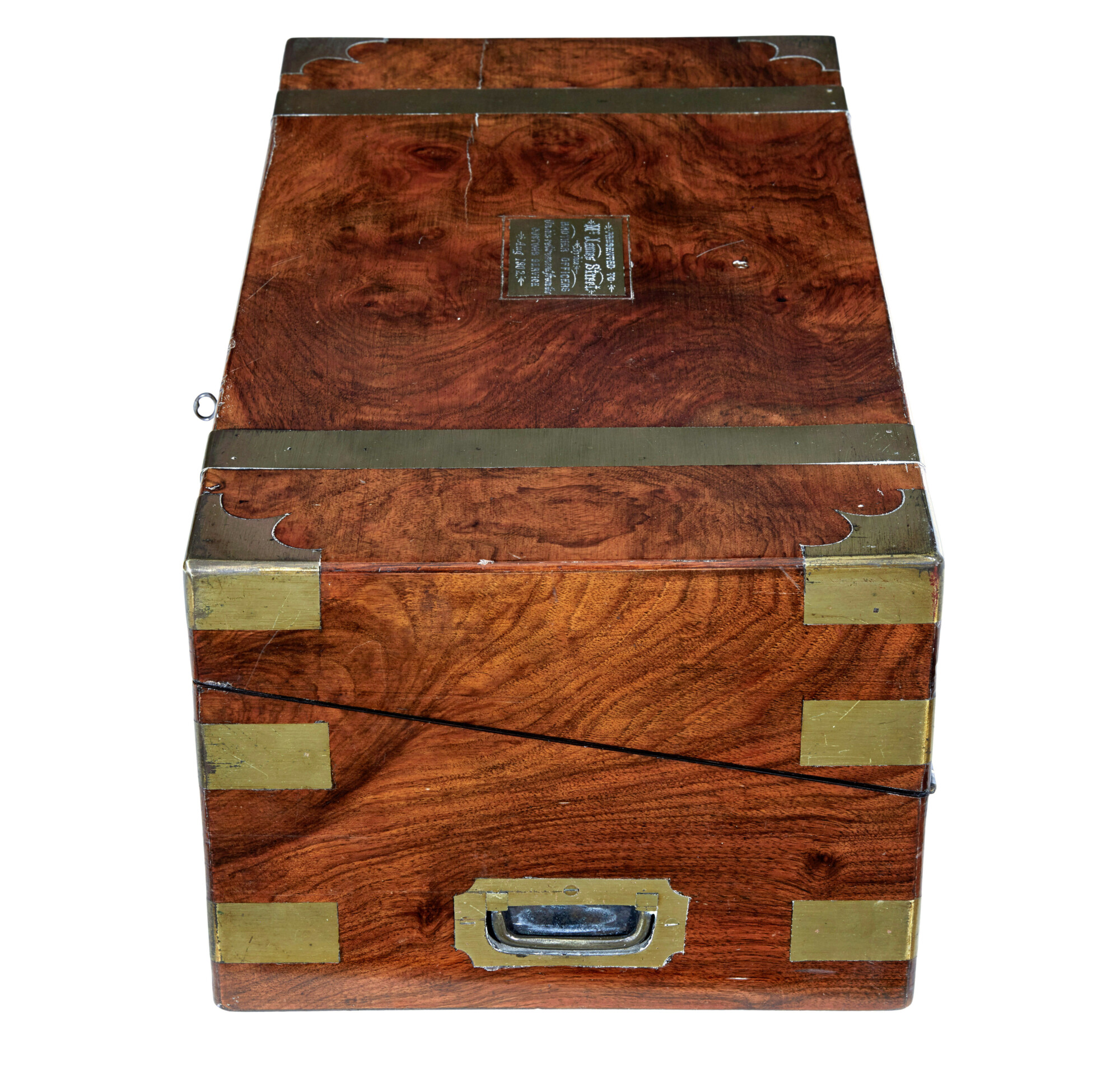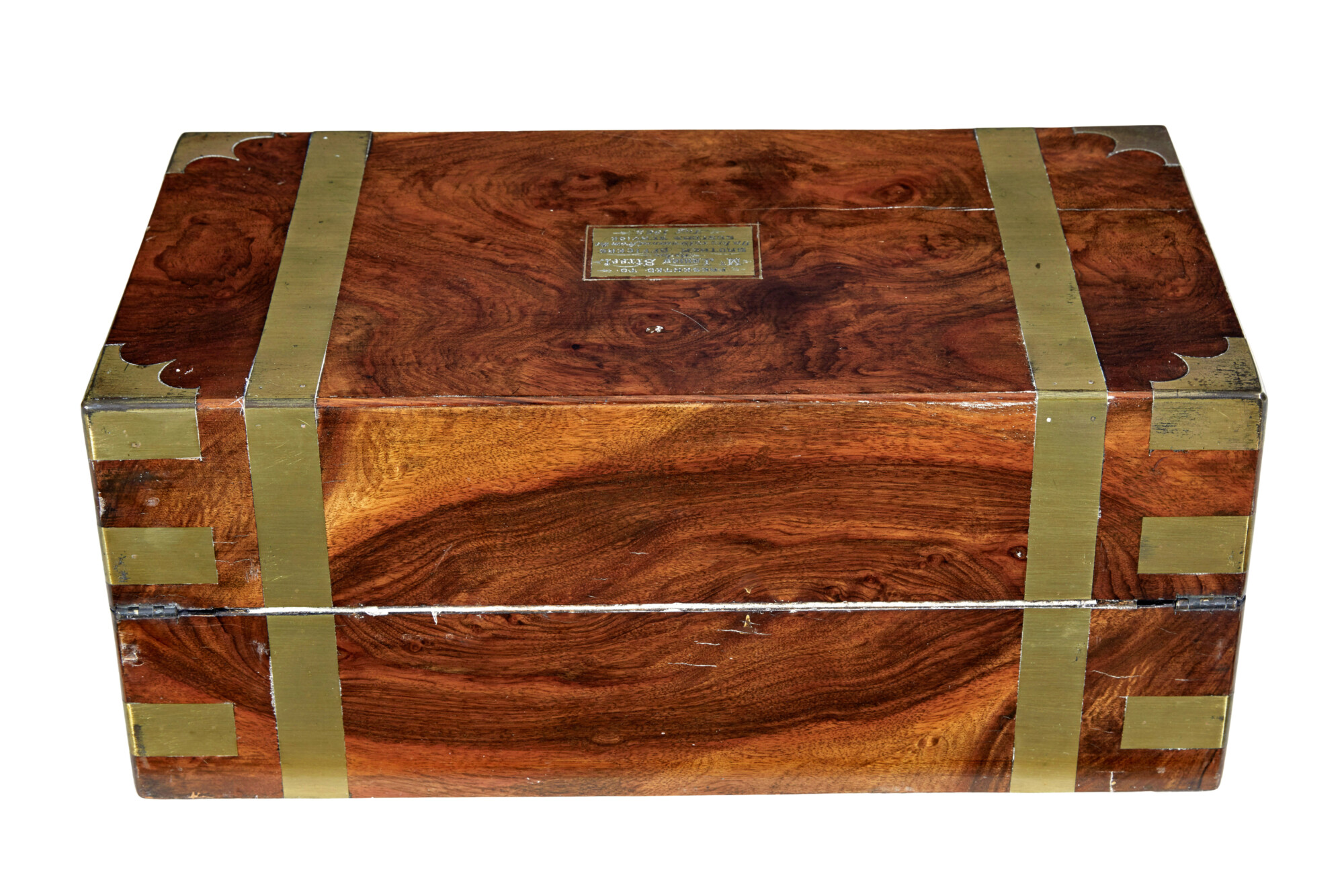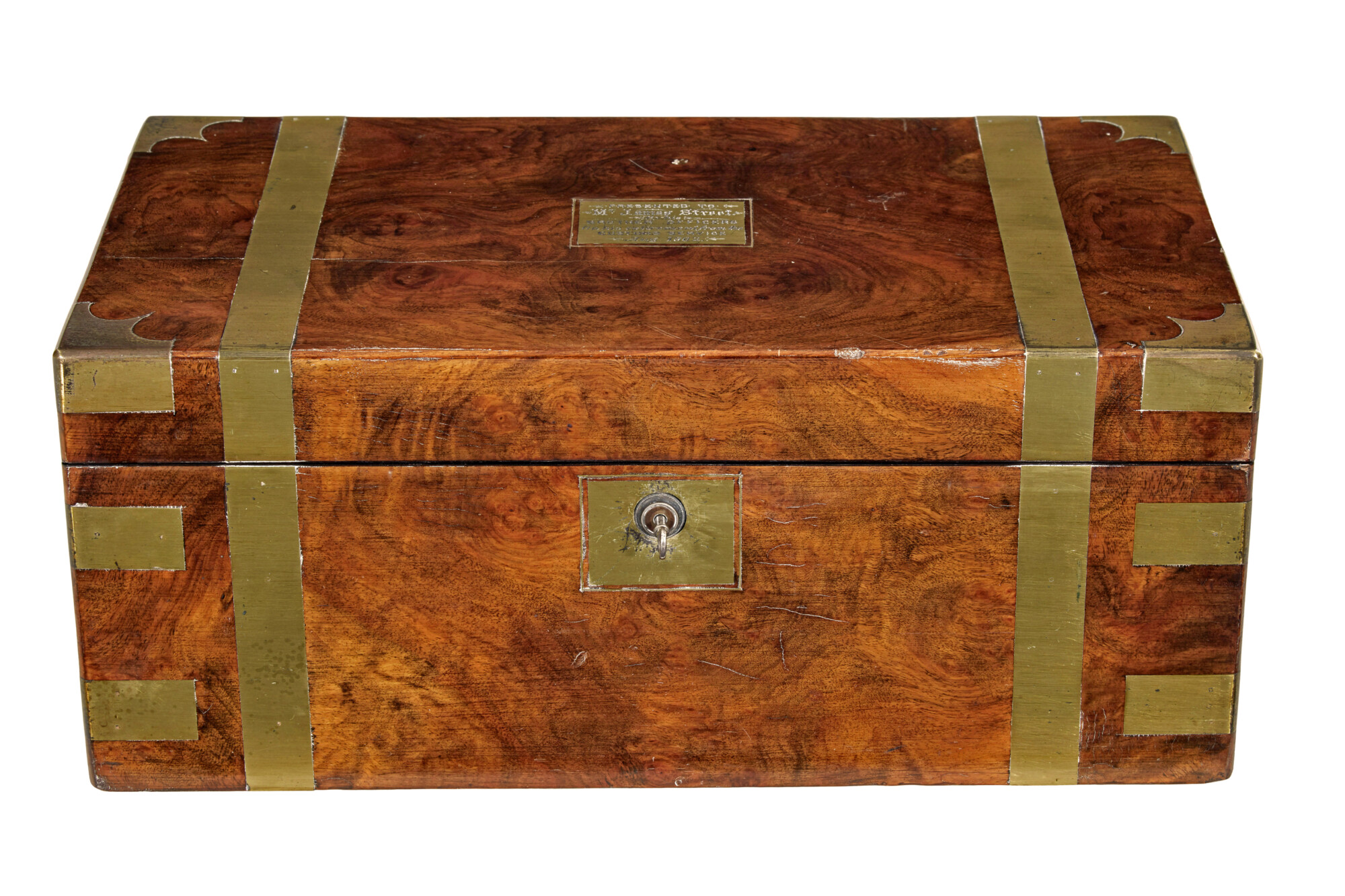 GOOD QUALITY BRASS BOUND BOX SLOPE MADE IN MAHOGANY. INSCRIBED BRASS PLAQUE SHOWS THAT THIS WAS PRESENTED TO A MR JAMES STREET IN 1902 FOR HIS SERVICE IN THE CUSTOMS SERVICE.