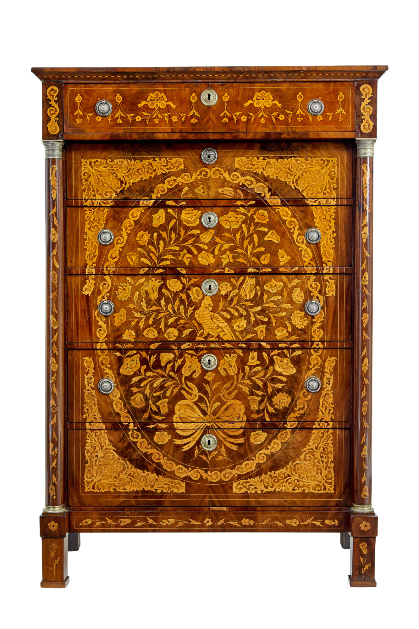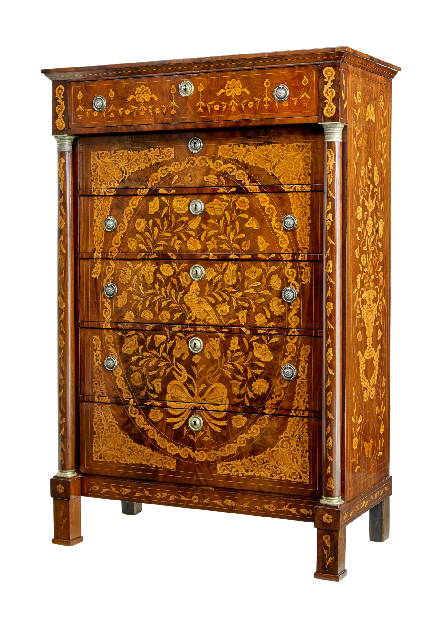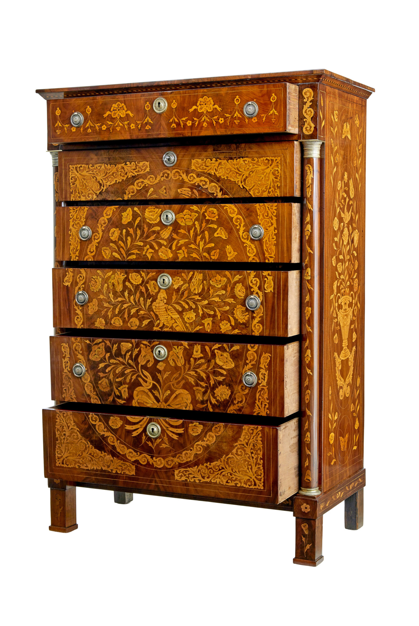 EARLY 19TH CENTURY INLAID FRENCH MAHOGANY 6-DRAWER CHEST WITH INLAID TURNED COLUMNS. PROFUSELY INLAID ON ALL SURFACES WITH FOLIAGE, BIRDS AND BUTTERFLIES. LATER HANDLES, AS THIS WOULD HAVE ALWAYS OPENED ON THE KEY.