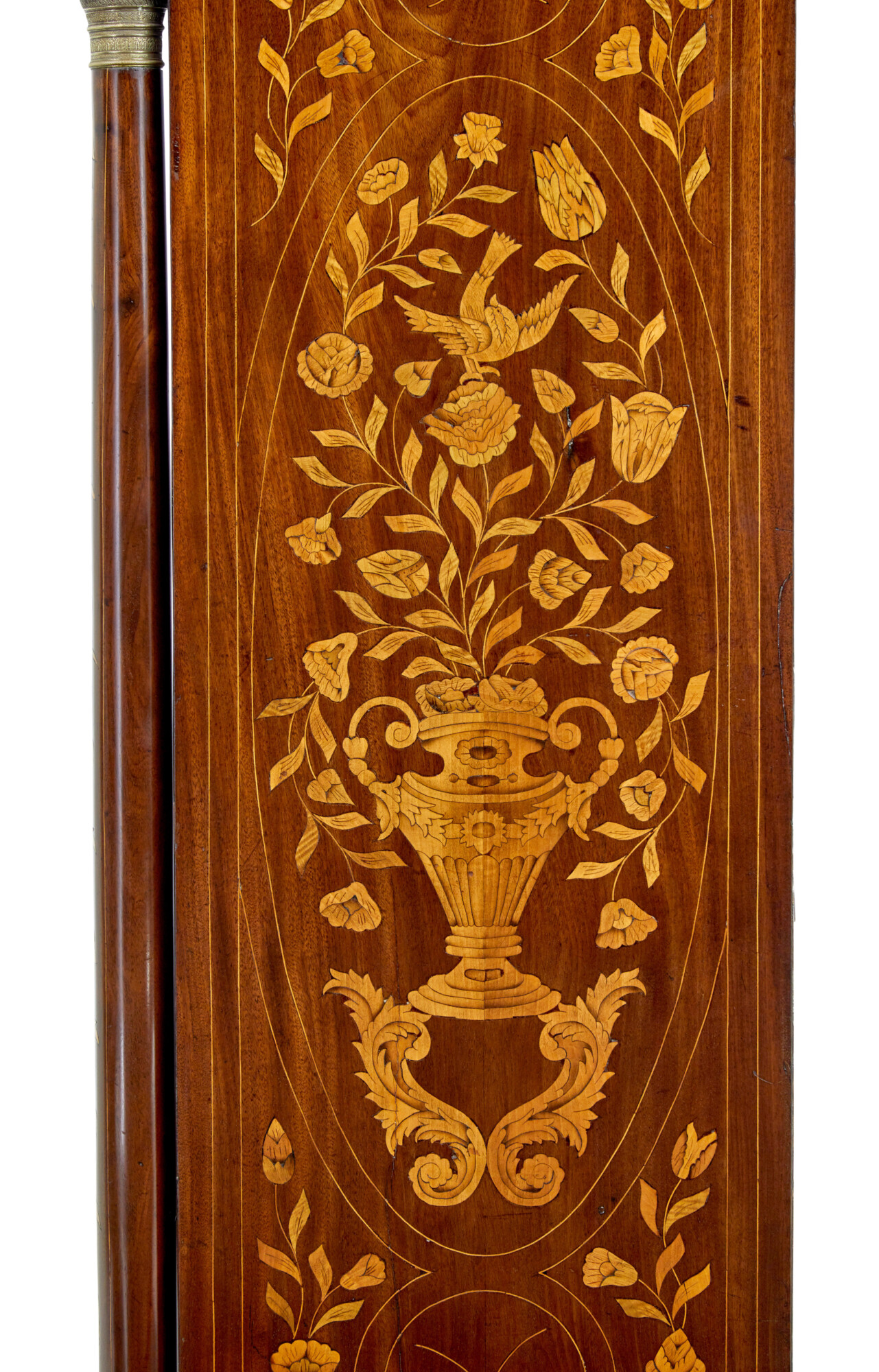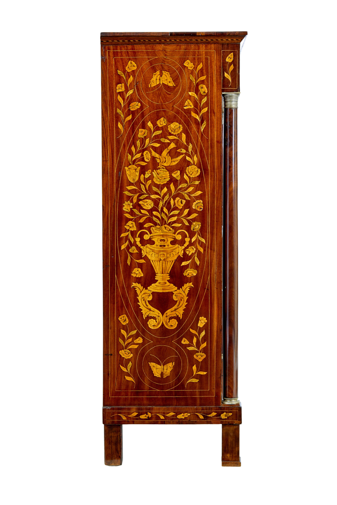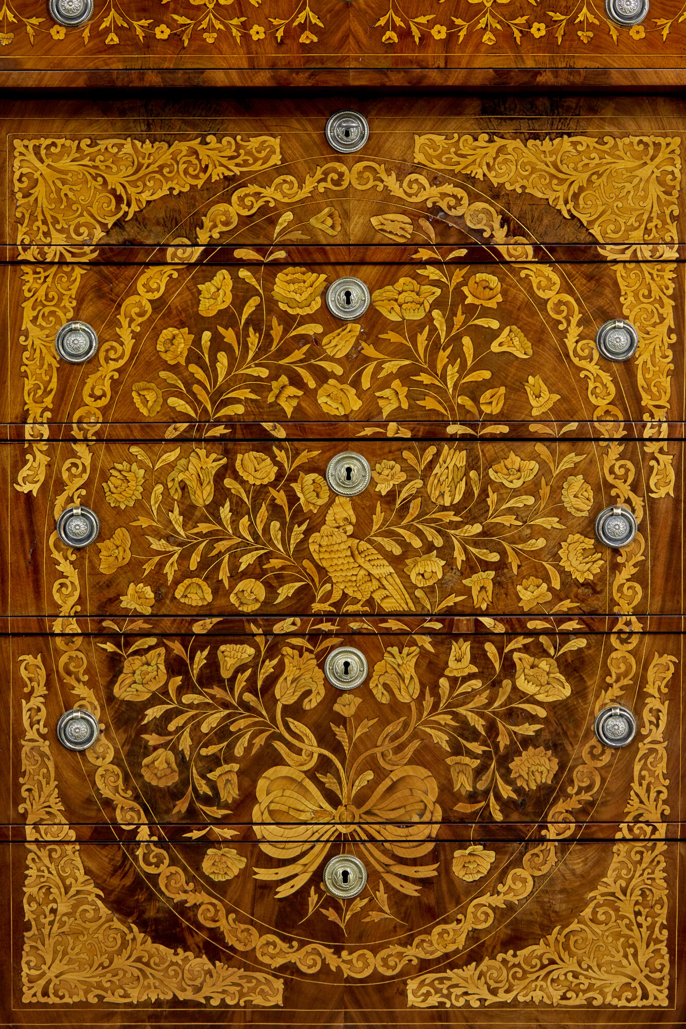 EARLY 19TH CENTURY INLAID FRENCH MAHOGANY 6-DRAWER CHEST WITH INLAID TURNED COLUMNS. PROFUSELY INLAID ON ALL SURFACES WITH FOLIAGE, BIRDS AND BUTTERFLIES. LATER HANDLES, AS THIS WOULD HAVE ALWAYS OPENED ON THE KEY.
