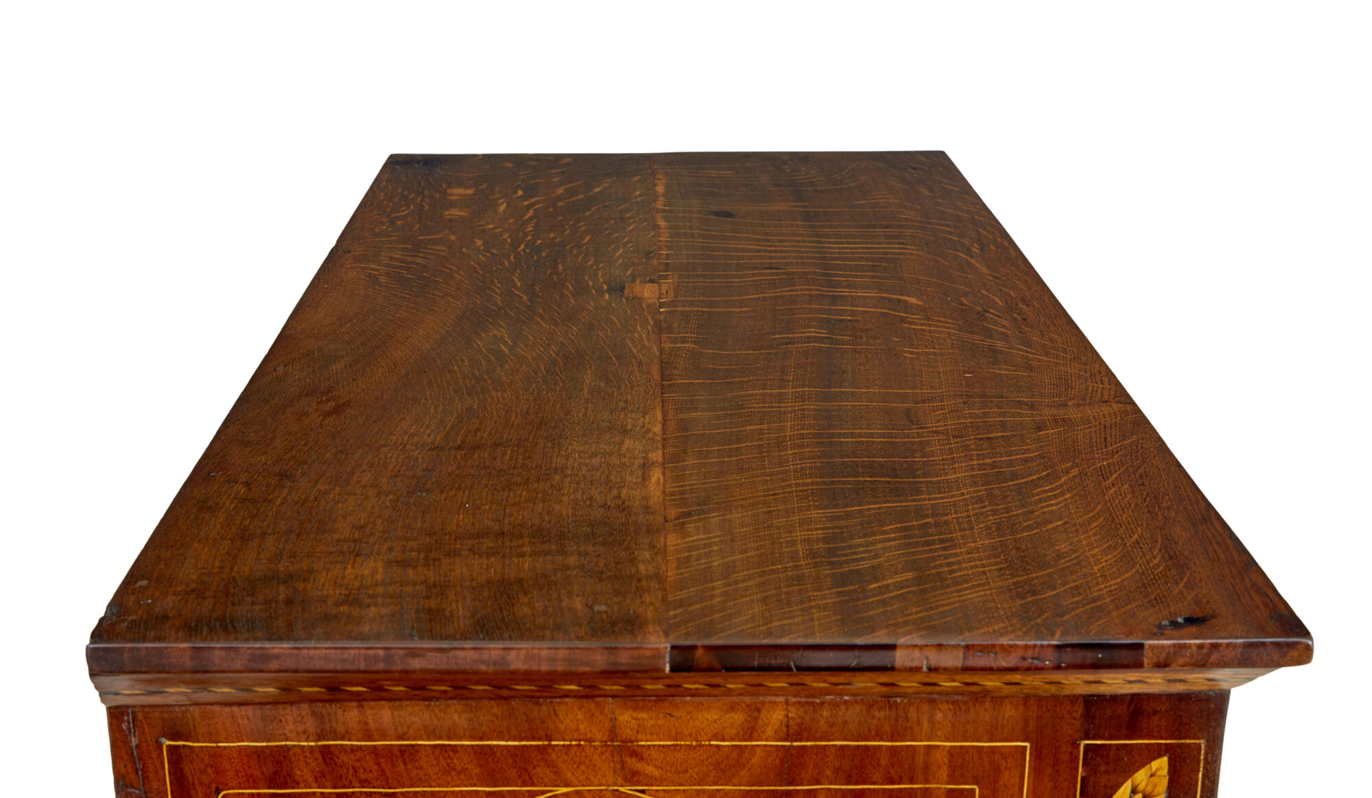 TOP OVER-SAILING DRAWER WITH SALT AND PEPPER INLAID CORNICE. BEAUTIFULLY MATCHED INLAID DRAWER FRONTS, FURTHER FULL LENGTH INLAY TO BOTH SIDES. STANDING ON 4 BLOCK FEET.