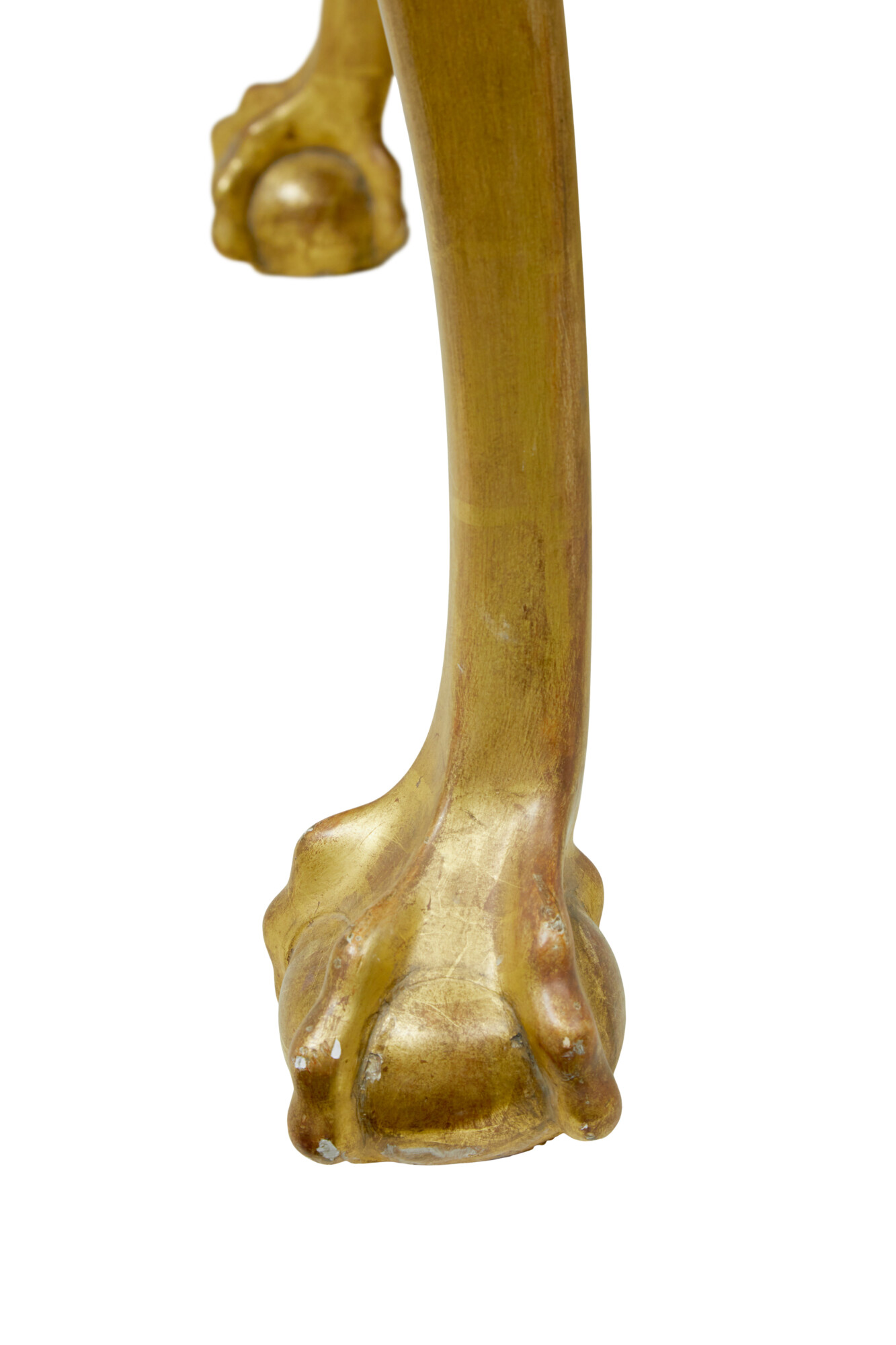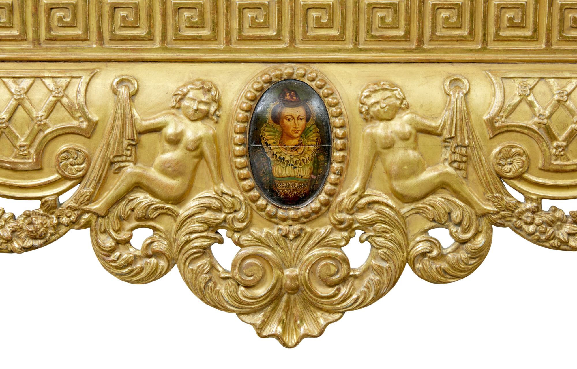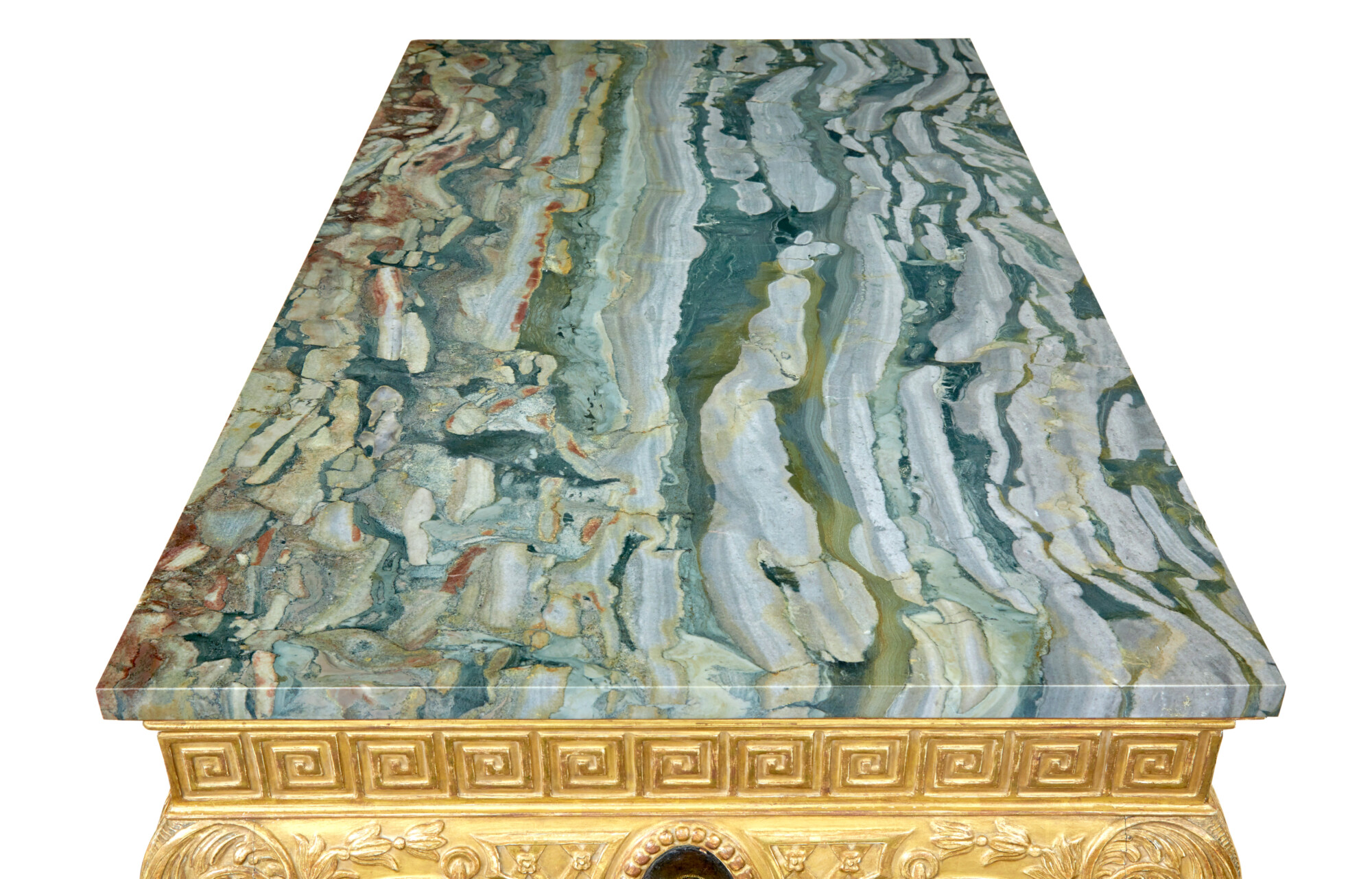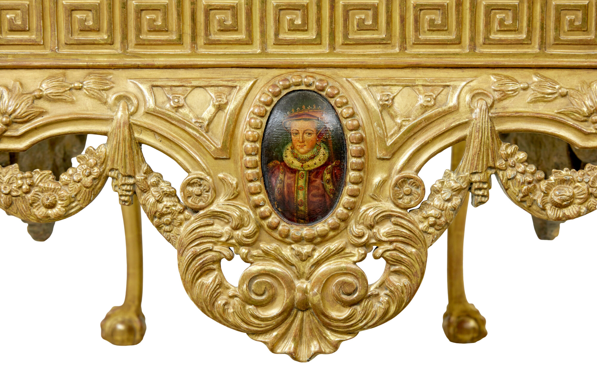 DEEP LAYERED MARBLE TOP SURFACE WITH GREYS, GREENS, BROWNS AND REDS SITS ON THE MAIN BODY OF THE TABLE FRAME. DEEP GREEK KEY CARVED APRON ABOVE A SERPENTINE FLORAL AND SWAG, GILT GESSO FINISH. HAND PAINTED MINIATURE PORTRAITS ON EACH SIDE FLANKED EITHER SIDE BY CHERUB LIKE FIGURES ON THE LONG SIDES. STANDING ON CABRIOLE LEGS, TERMINATING WITH A BALL AND CLAW FOOT. BEAUTIFUL GILDING, WITH VERY MINOR LOSSES.