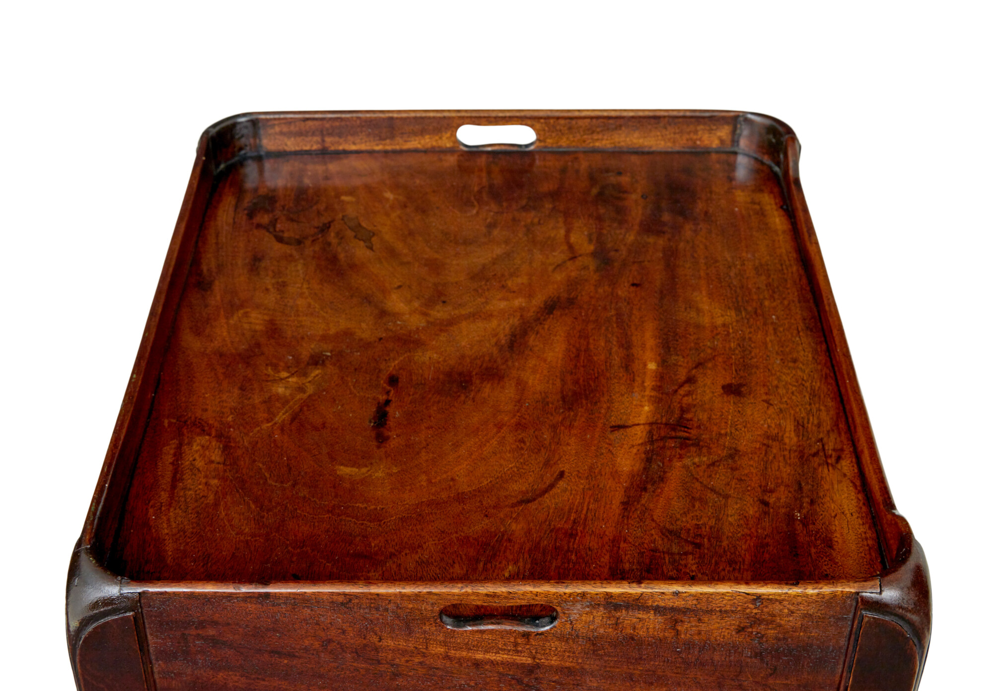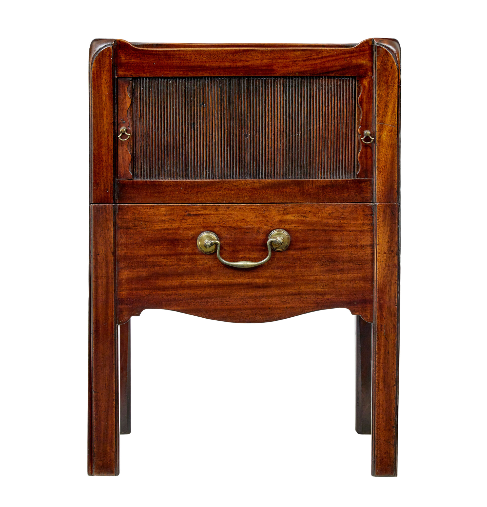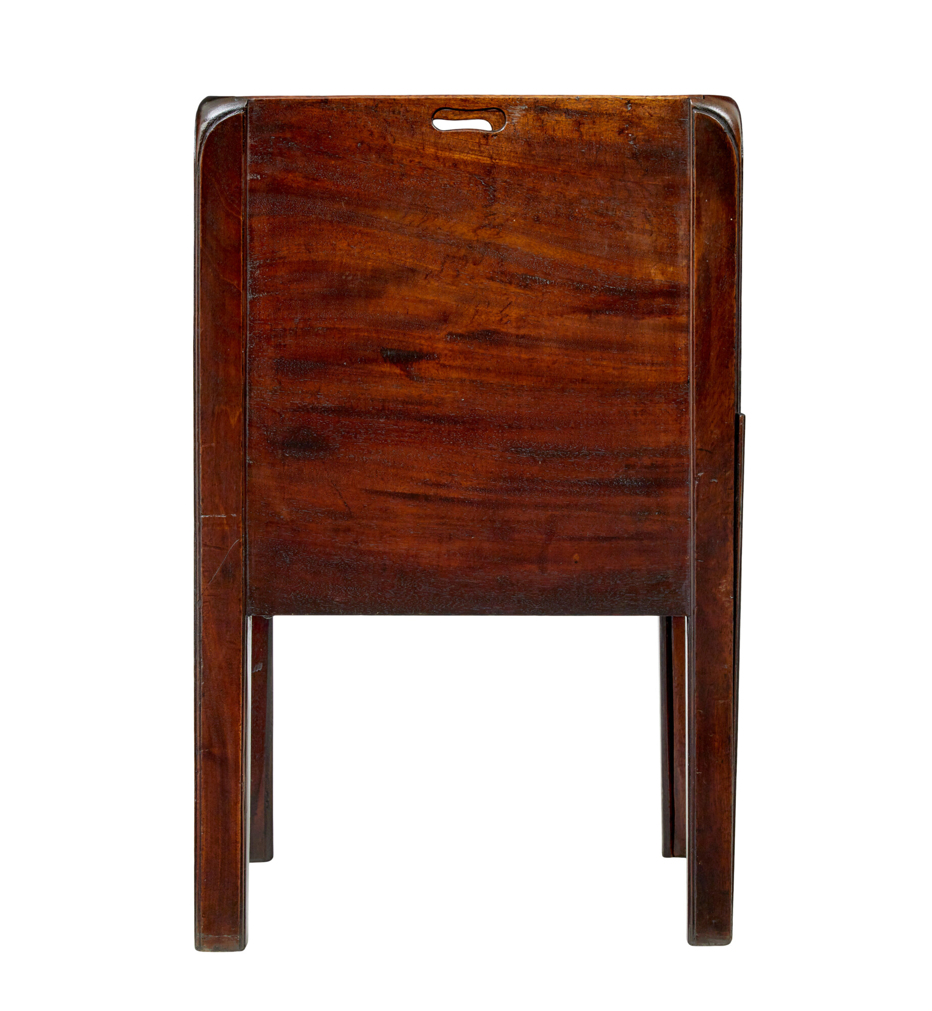 SHAPED TRAY TOP WITH PIERCED CARRYING HANDLES. BELOW THE TOP SURFACE IS A TAMBOUR DOOR WHICH OPENS UP FOR STORAGE SPACE. THE PULL OUT DRAWER WHICH WOULD HAVE HOUSED THE CHAMBER POT HAS SINCE BEEN COVERED OVER TO PROVIDE FURTHER STORAGE. RAISED ON SQUARE CHAMFERED LEGS.