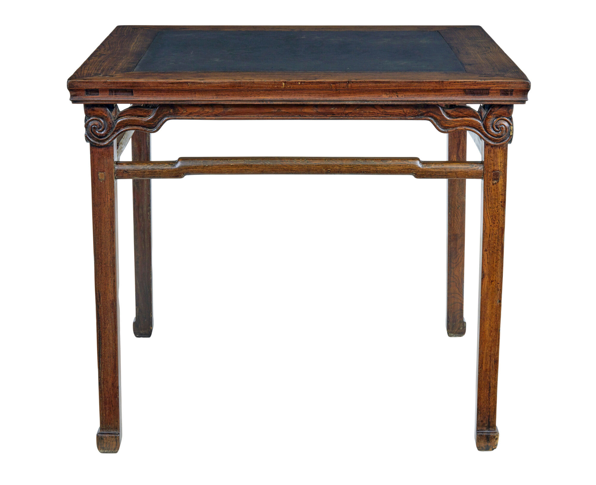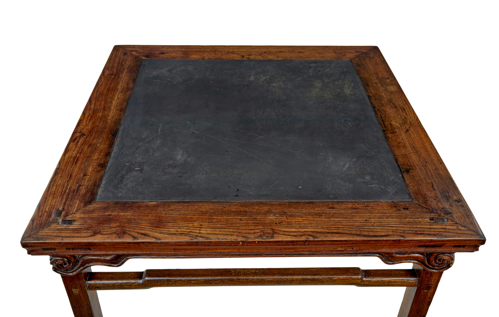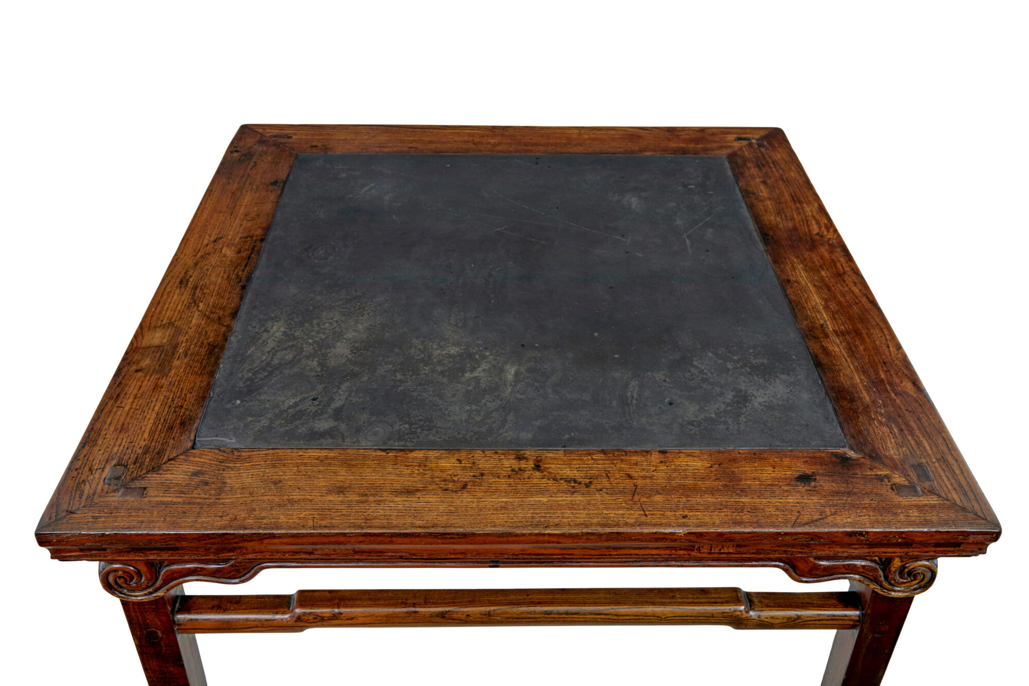 GOOD QUALITY HARD WOOD CHINESE TABLE WITH A DARK GREY MARBLE PANEL INSET INTO THE TOP. MARBLE HAS A GREAT PATINA AND NATURAL FINISH TO THE SURFACE. SQUARE TOP WITH CARVED SCROLLS UNDERNEATH AND FURTHER SHAPED STRETCHERS THAT LINK TO THE LEGS.