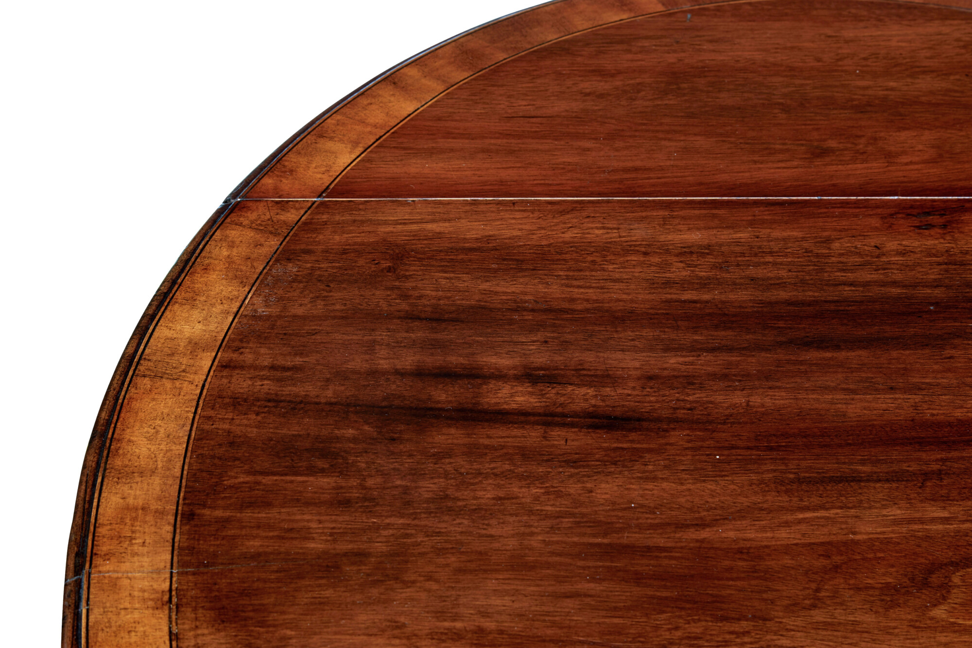 DROP LEAVES OPEN TO FORM A NEAR CIRCULAR TOP, MAHOGANY TOP CROSS BANDED AND WITH EBONY STRINGING.