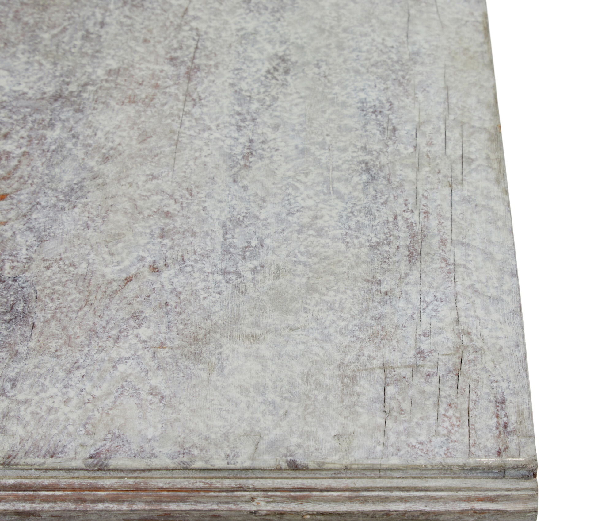 RECTANGULAR TOP WITH CANTED CORNERS, FURTHER EMBELLISHED WITH A STEPPED MOULDED EDGE AROUND THE TOP SURFACE. SHALLOW TOP DRAWER WITH INSET FIELDED PANELS, WITH A FURTHER 2 DEEP DRAWERS BELOW. SCRAPED BACK PAINT WITH LATER PAINT APPLIED OVER THE TOP, WHICH HAS NOW BECOME FADED, EVEN WEARING BACK TO THE BARE PINE GRAIN IN PLACES. EACH STANDING ON 4 SHORT TAPERED LEGS.