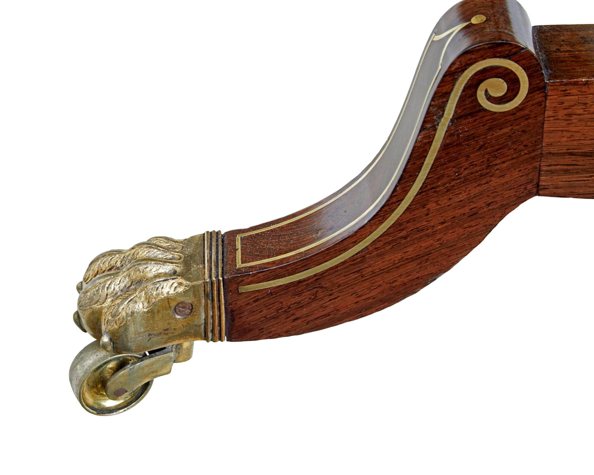 RECTANGULAR TOP WITH ROUNDED EDGE WITH BRASS STRINGING DETAIL. STRAIGHT SUPPORTS WITH INLAID BRASS, AND 1ST CLASS FLEUR DE LYS MOTIFS TO BOTH SIDES OF THE SCROLLING LEGS. STANDING ON CAST PAW FEET AND CASTORS.