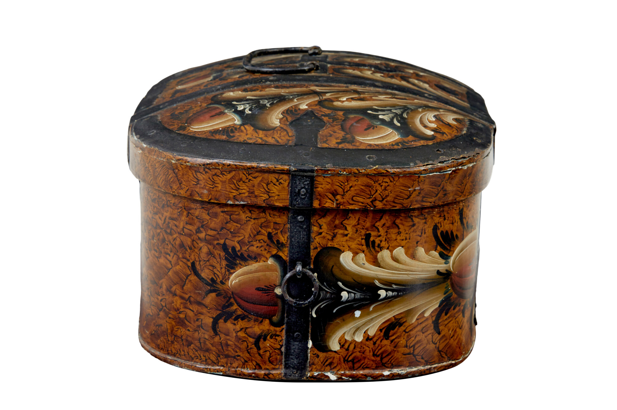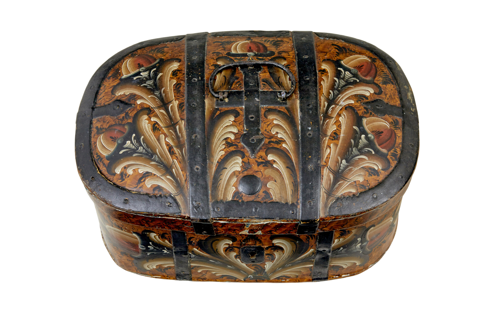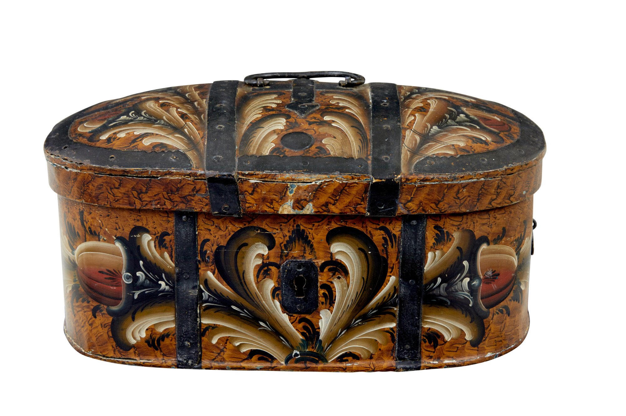 OVAL SHAPED WITH A SLIGHT DOMED LID, DECORATED WITH BLACK PAINTED STRAPWORK, RING HANDLES TO THE SIDES AND A CARRYING HANDLE TO THE TOP. HAND PAINTED IN THE TRADITIONAL KURBIT MANNER WITH A BASE BROWN COLOUR SCHEME. LOCK HAS BEEN REMOVED. INTERIOR HAS BEEN LATER PAINTED A CREAMY WHITE.