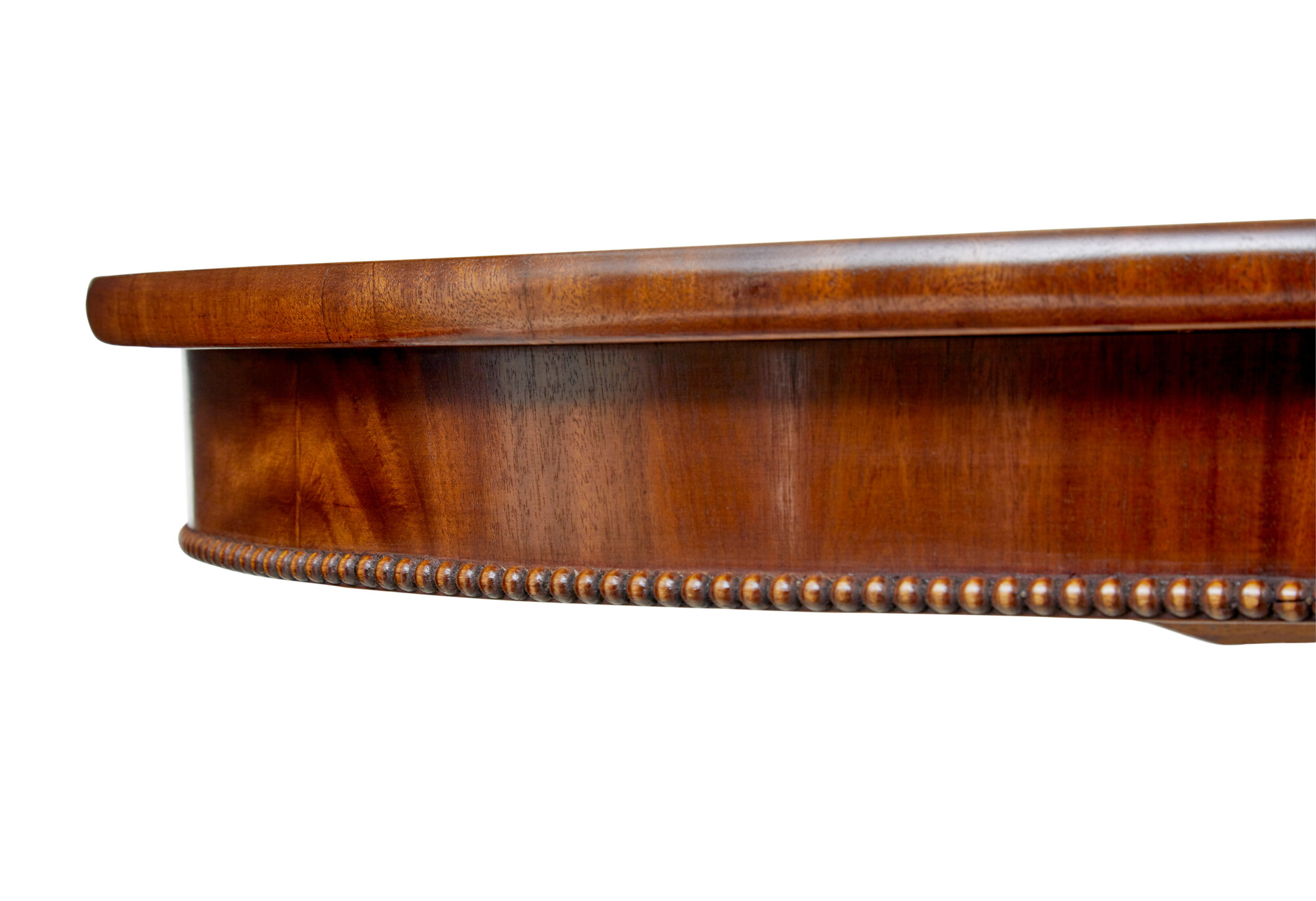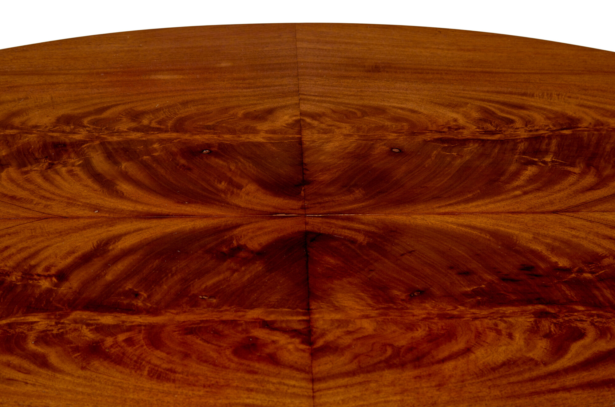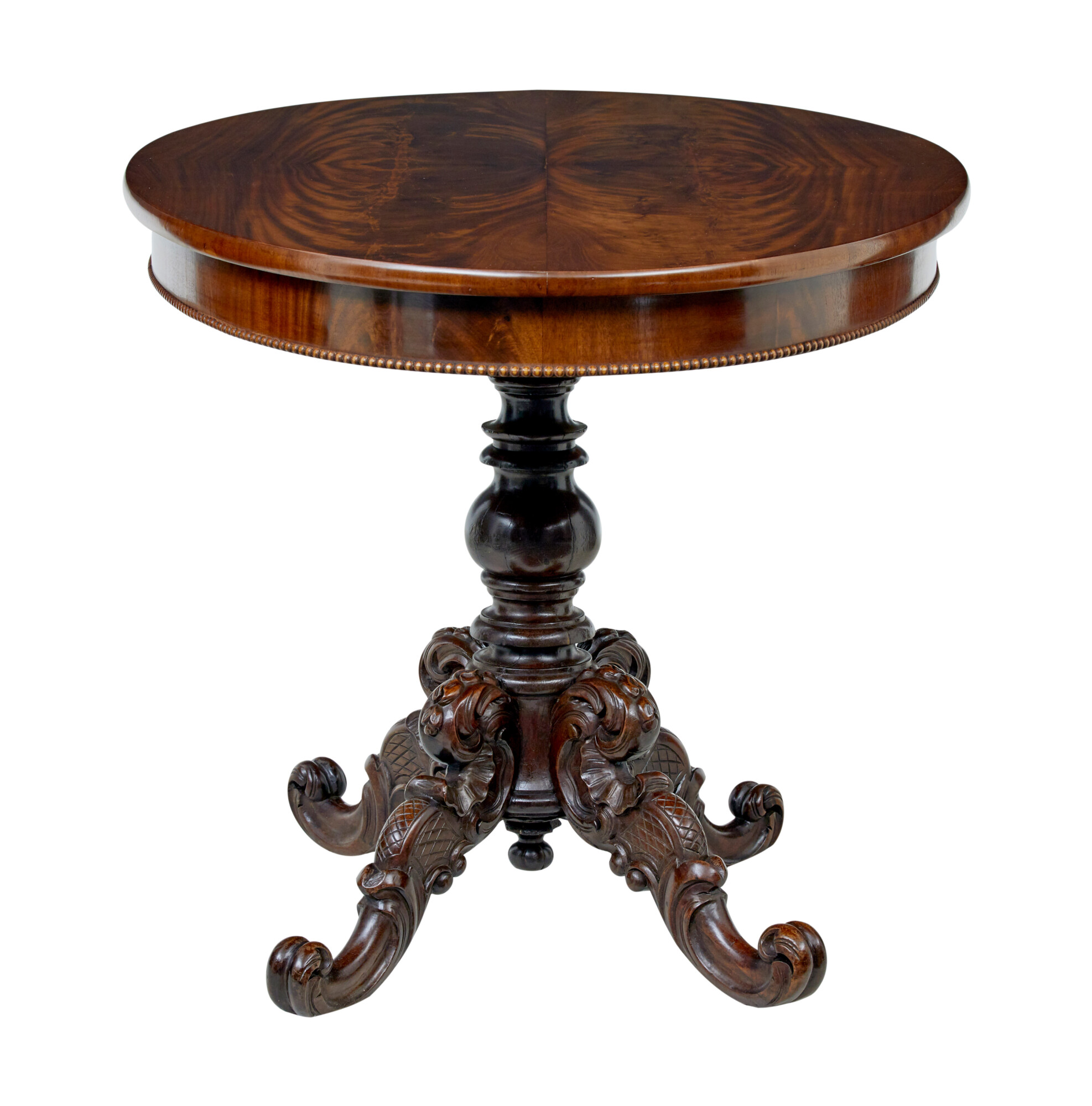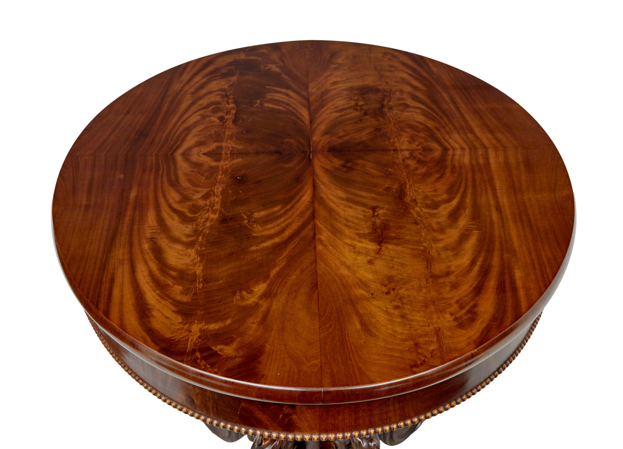 BEAUTIFUL QUALITY SWEDISH CENTER TABLE, QUARTER VENEERED FLAME MAHOGANY TOP SURFACE SLIGHTLY OVER-SAILS THE SHALLOW APRON AND BEADED BORDER, SUPPORTED BY A TURNED STEM AND STANDING ON 4 PROFUSELY CARVED SCROLLING LEGS, WHICH ARE DECORATED WITH ACANTHUS LEAVES AND CARVING.