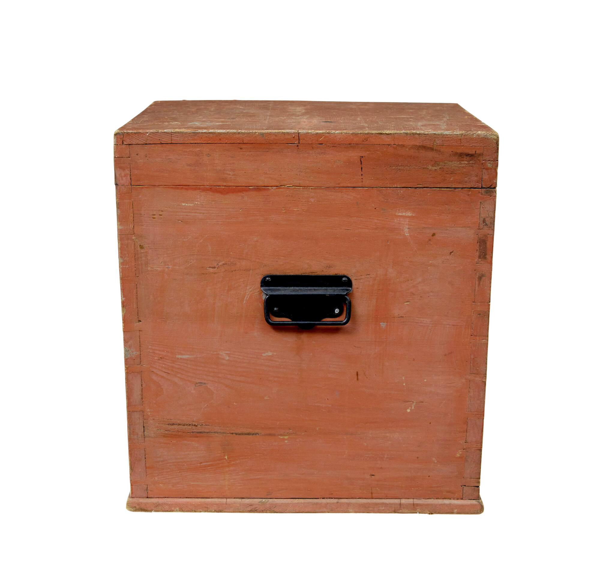 PRACTICAL PIECE OF EVERYDAY SWEDISH FURNITURE. SHAPED CHEST, PAINTED INTO A BROWN/ORANGE SCHEME. BLACK PAINTED SIDE CARRYING HANDLES AND HINGES. NO WORKING LOCK OR KEY.