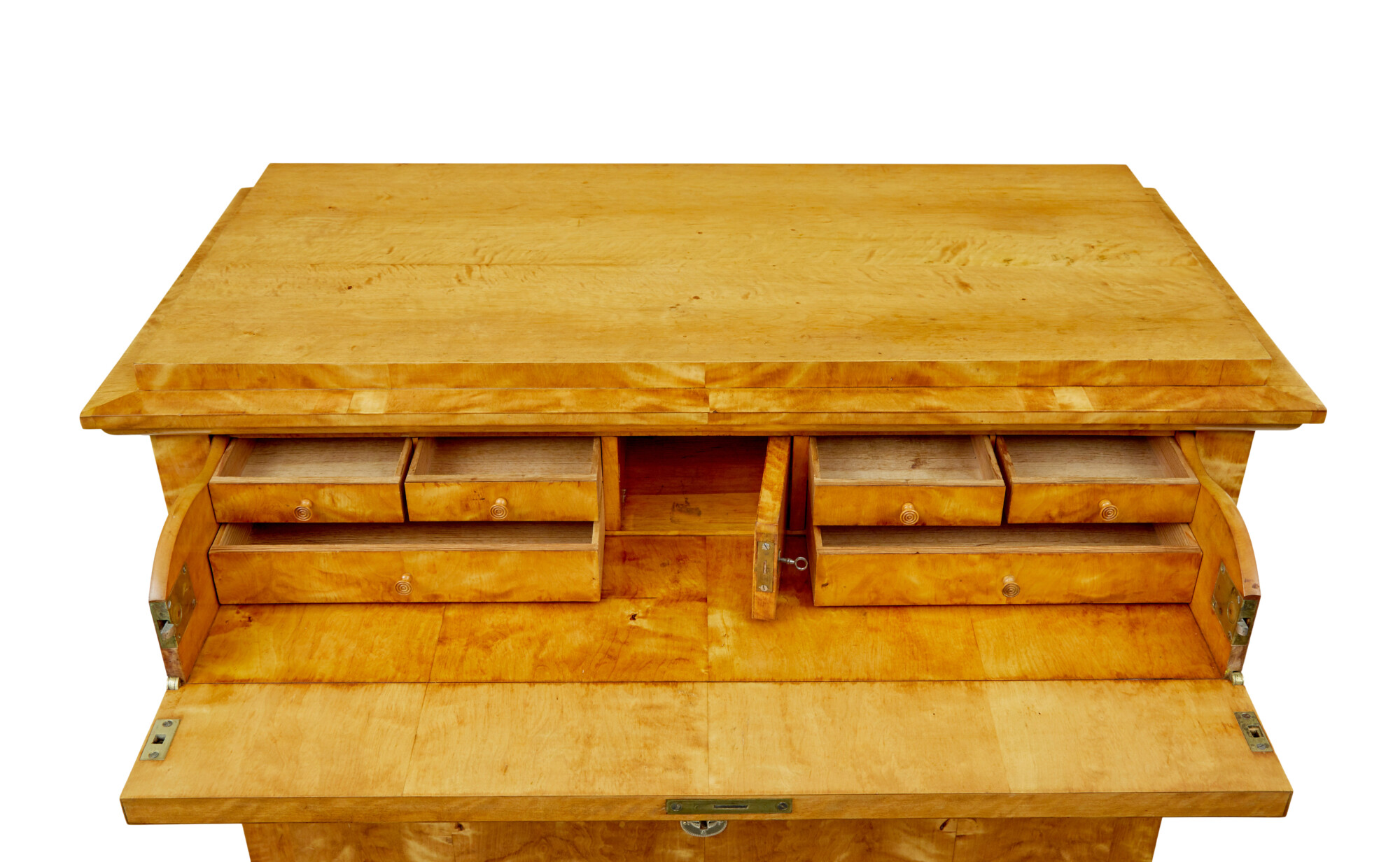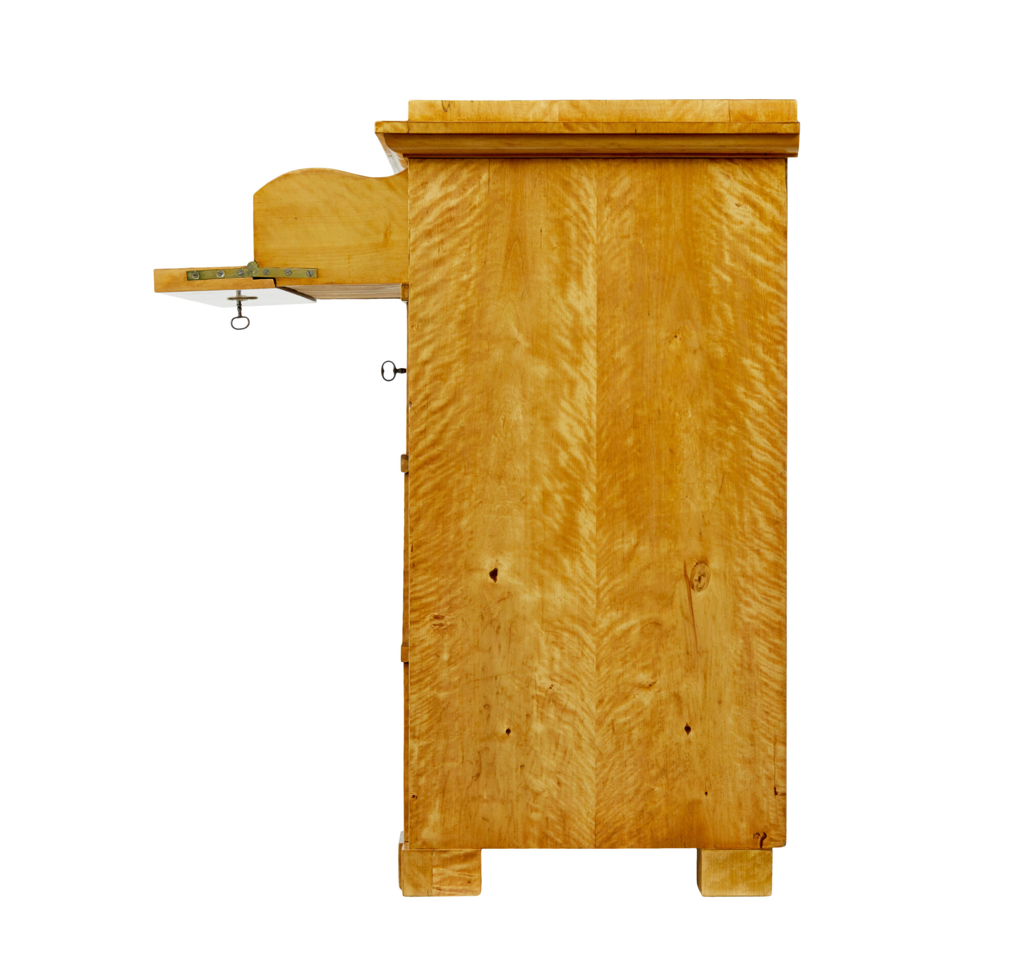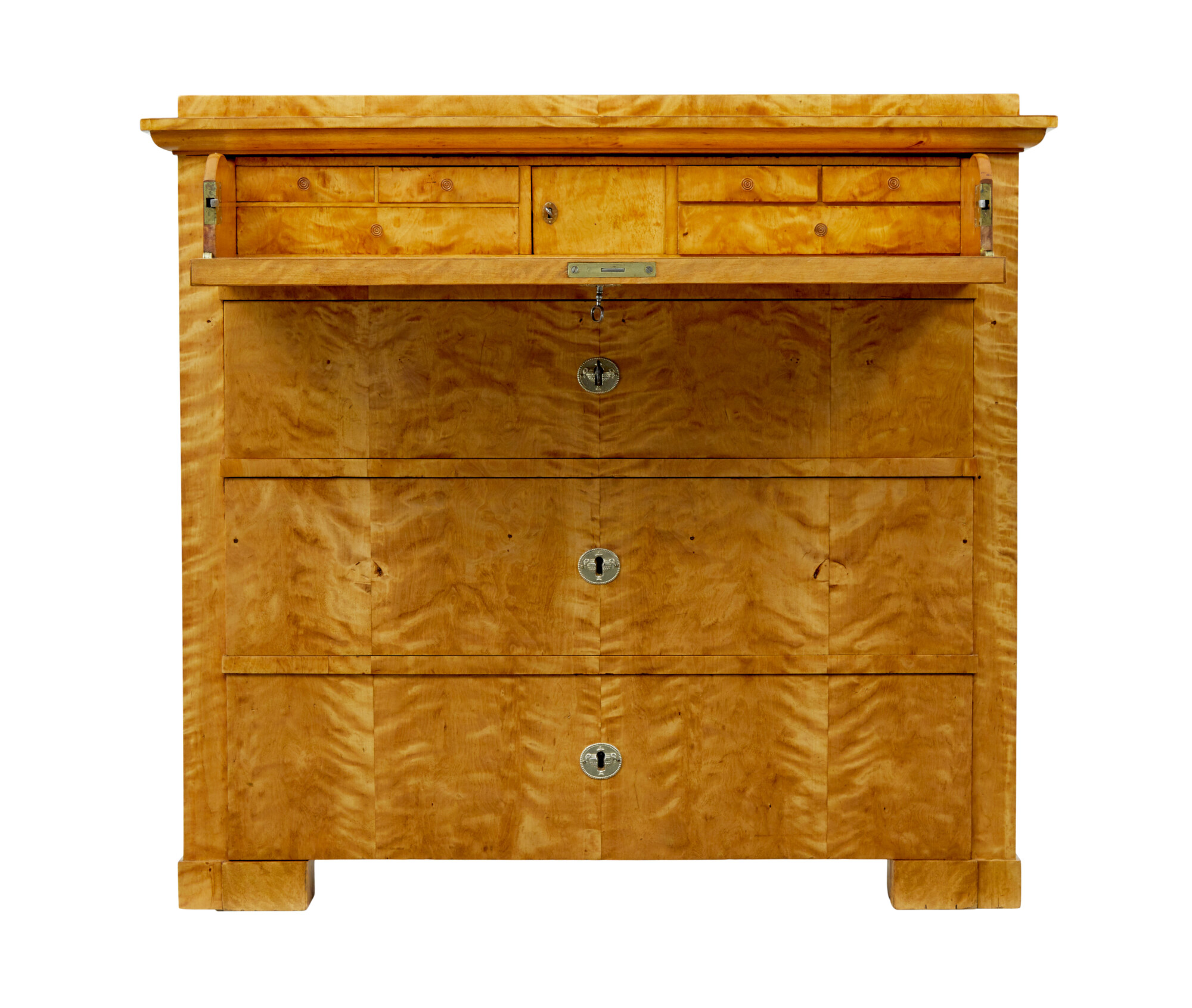 RECTANGULAR TOP WITH ELEGANT STEPPED CORNICE, VENEERED IN A TIGER BIRCH WHICH IS CUT TO HIGHLIGHT THE GRAIN. TOP DRAWER PARTIALLY PULLS OUT AND THE DRAWER FRONT DROPS DOWN TO FORM A WRITING SURFACE, THE REST OF THE DRAWER INTERIOR IS FULLY FITTED WITH 2 BANKS OF 3 DRAWERS FLANKING A CENTRAL LOCKABLE TABERNACLE. 3 FURTHER DRAWERS VENEERED IN STRIKING MATCHED TIGER BIRCH. ALL RAISED ON BLOCK FEET.