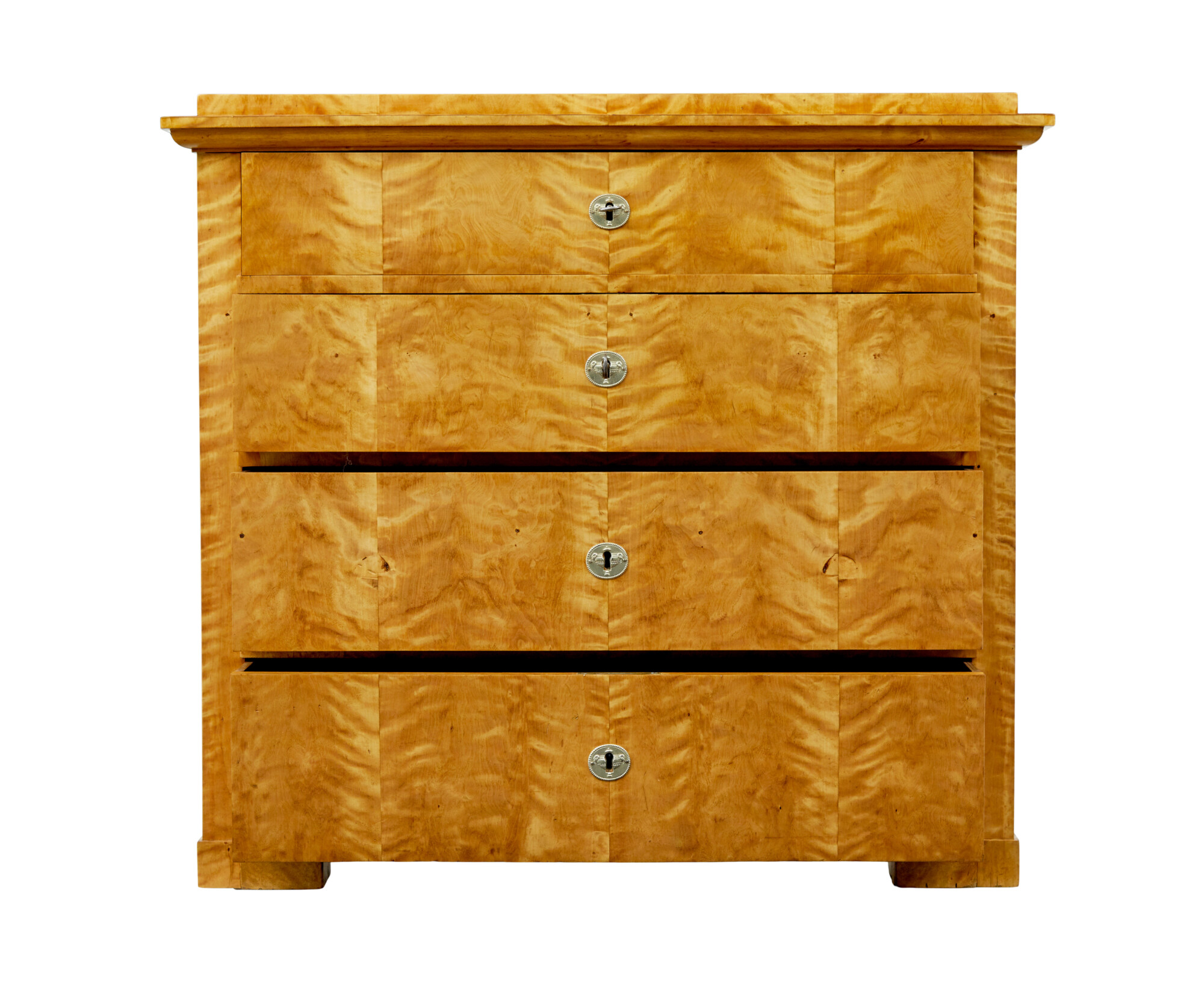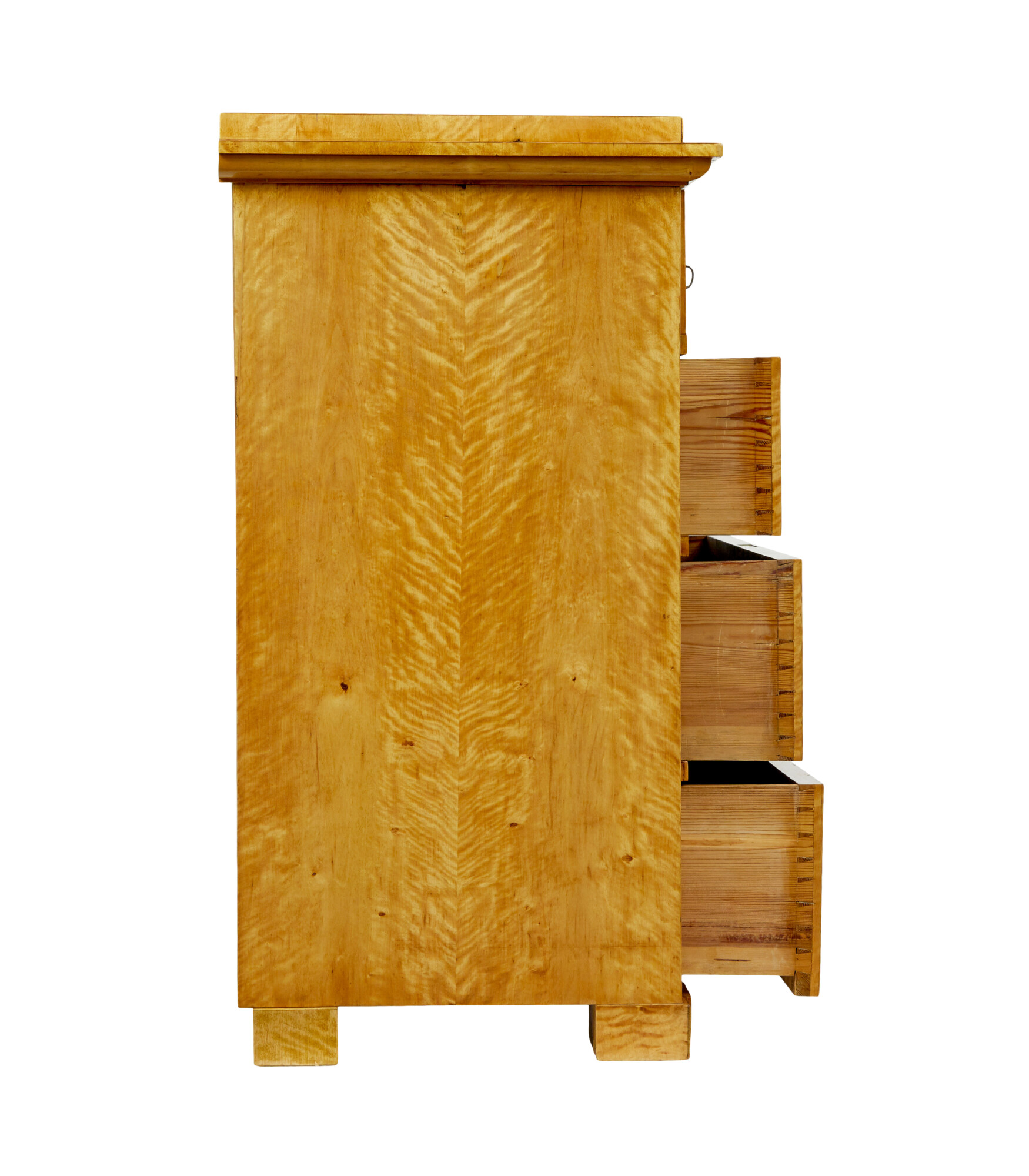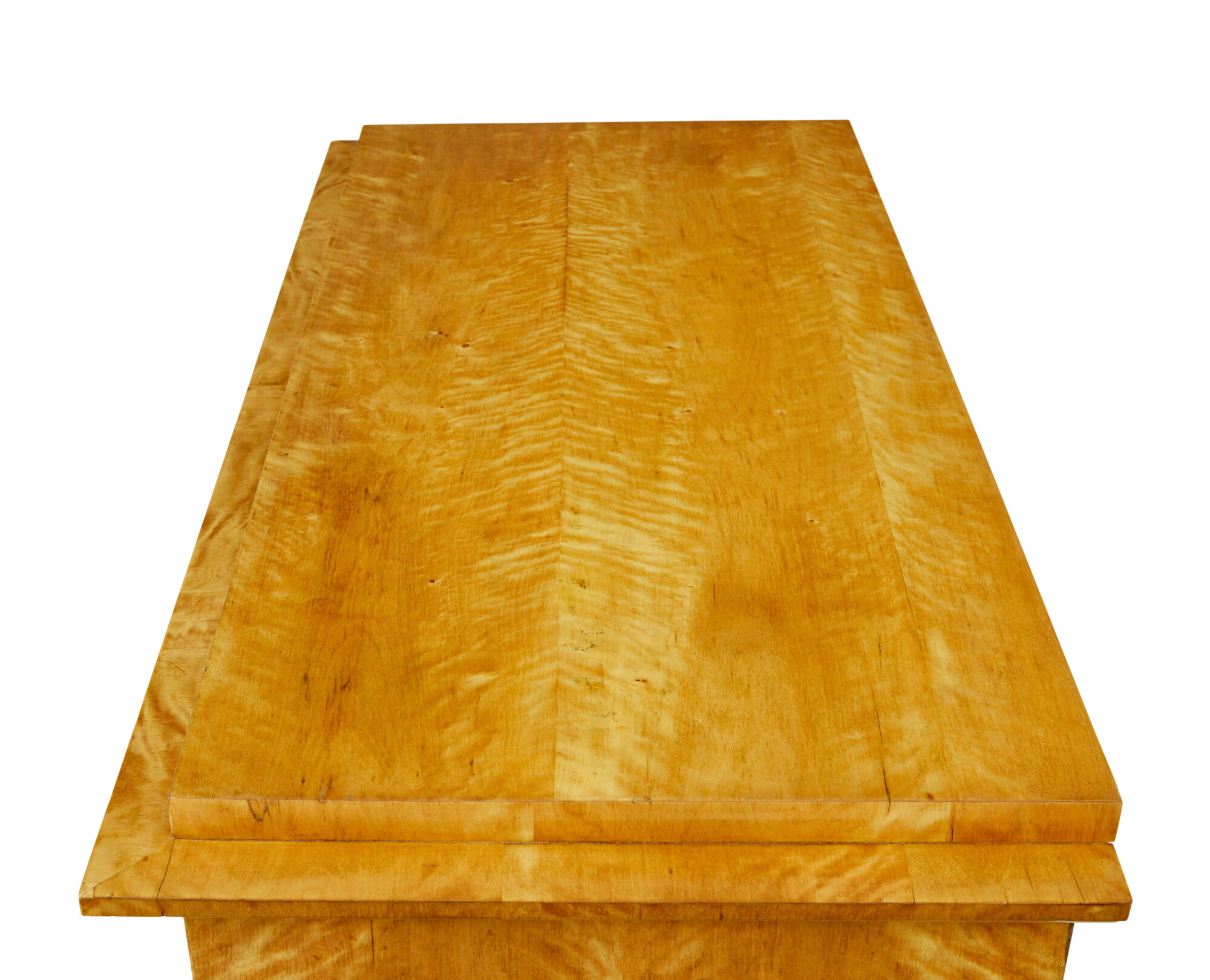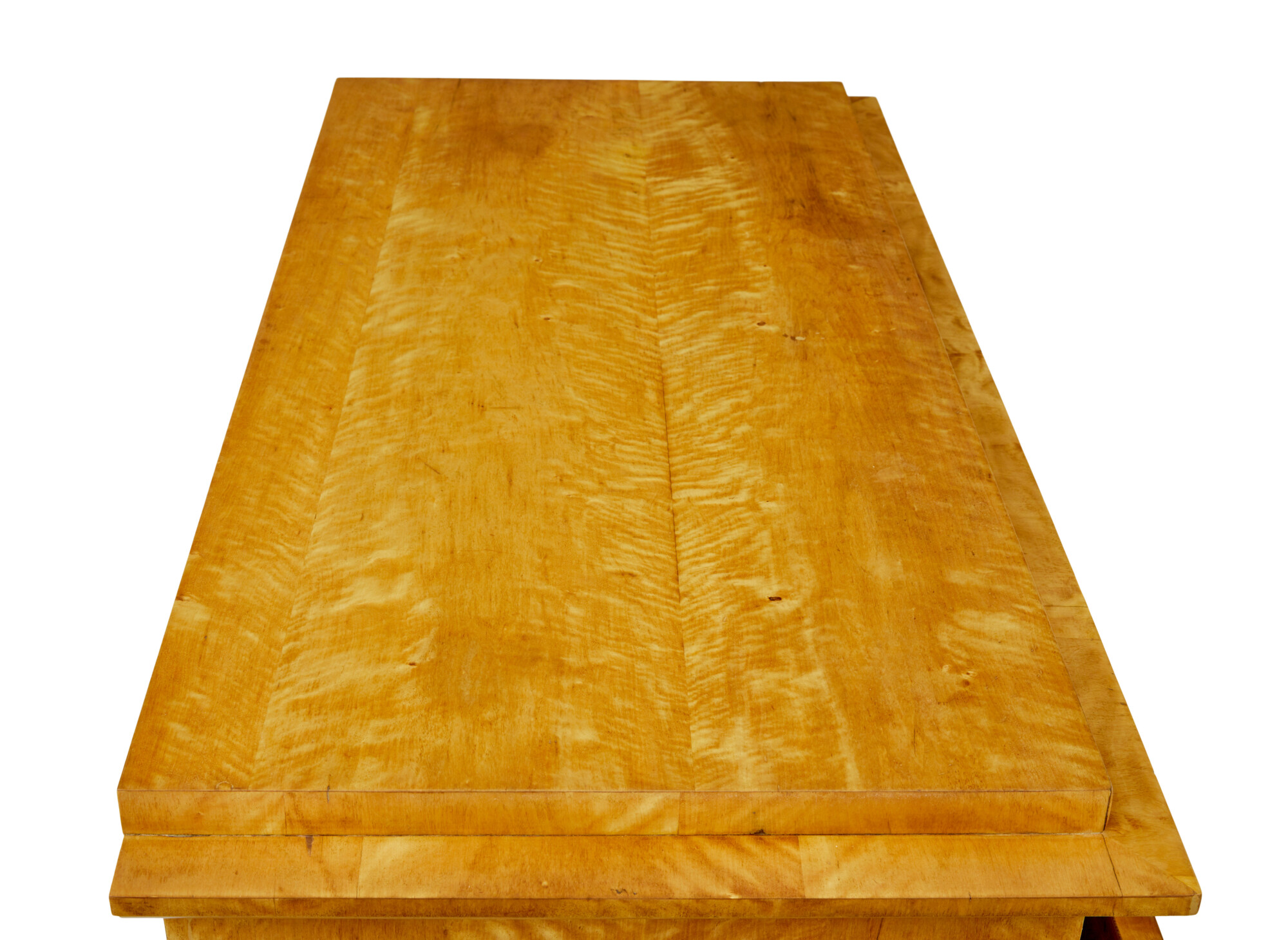 RECTANGULAR TOP WITH ELEGANT STEPPED CORNICE, VENEERED IN A TIGER BIRCH WHICH IS CUT TO HIGHLIGHT THE GRAIN. TOP DRAWER PARTIALLY PULLS OUT AND THE DRAWER FRONT DROPS DOWN TO FORM A WRITING SURFACE, THE REST OF THE DRAWER INTERIOR IS FULLY FITTED WITH 2 BANKS OF 3 DRAWERS FLANKING A CENTRAL LOCKABLE TABERNACLE. 3 FURTHER DRAWERS VENEERED IN STRIKING MATCHED TIGER BIRCH. ALL RAISED ON BLOCK FEET.