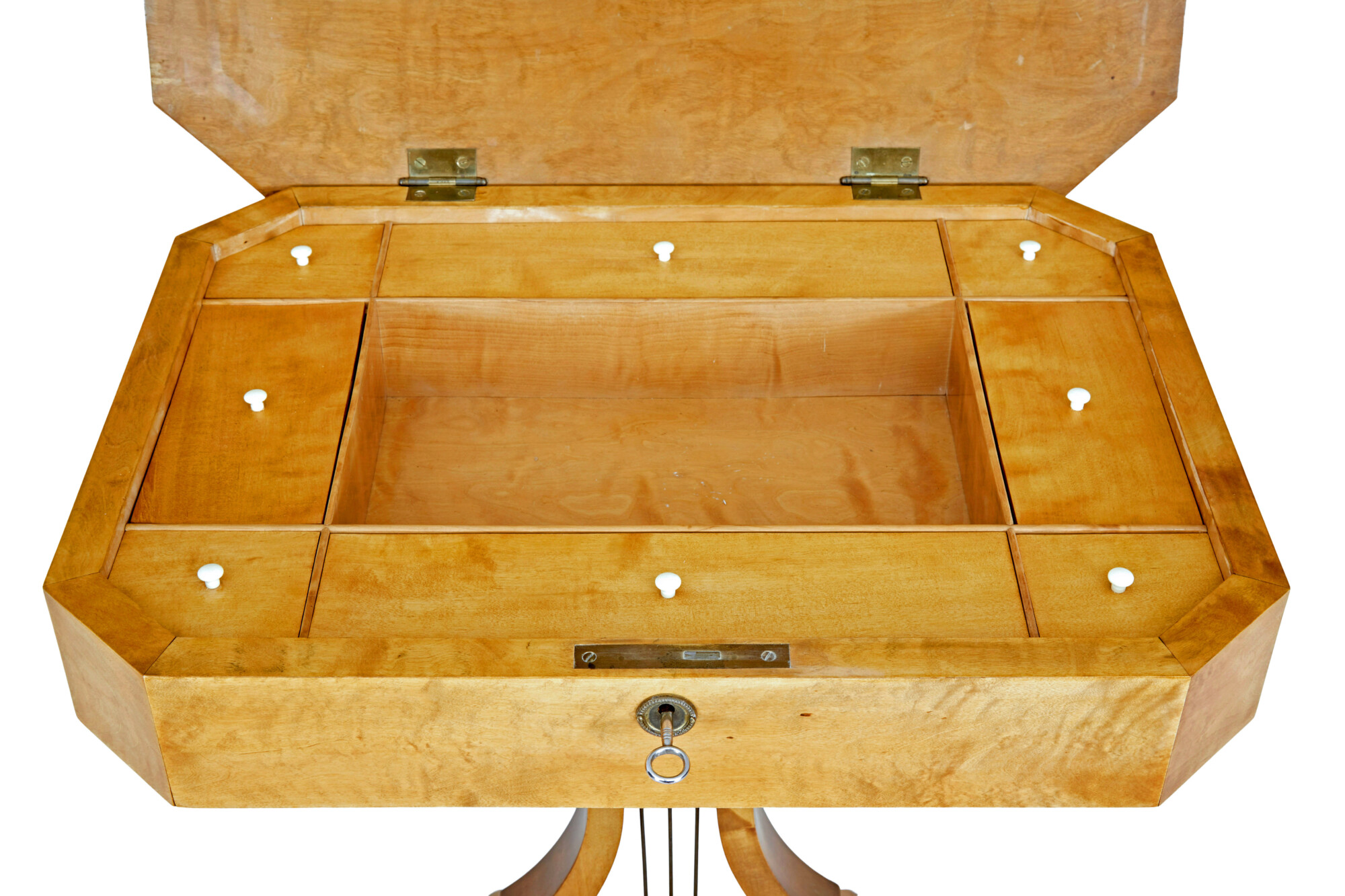 RECTANGULAR TOP WITH CANTED CORNERS. HINGED LID OPENS TO REVEAL A FITTED INTERIOR OF COMPARTMENTS ARRANGED AROUND A CENTRAL POT. TOP IS SUPPORTED BY A LYRE SHAPED STAND WITH DECORATIVE BRASS STRINGS. STANDING ON A QUADRIFORM BASE AND SHAPED FEET.