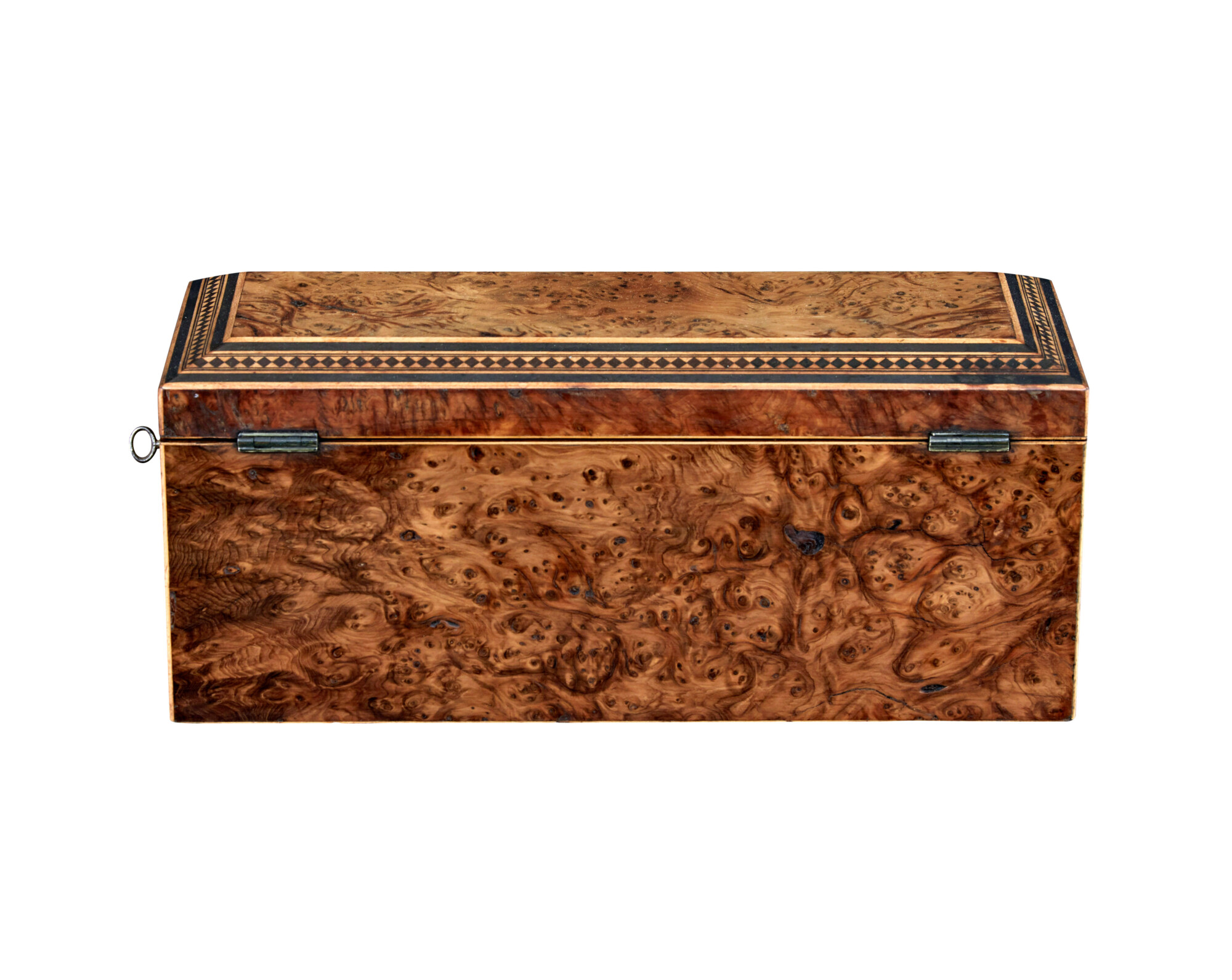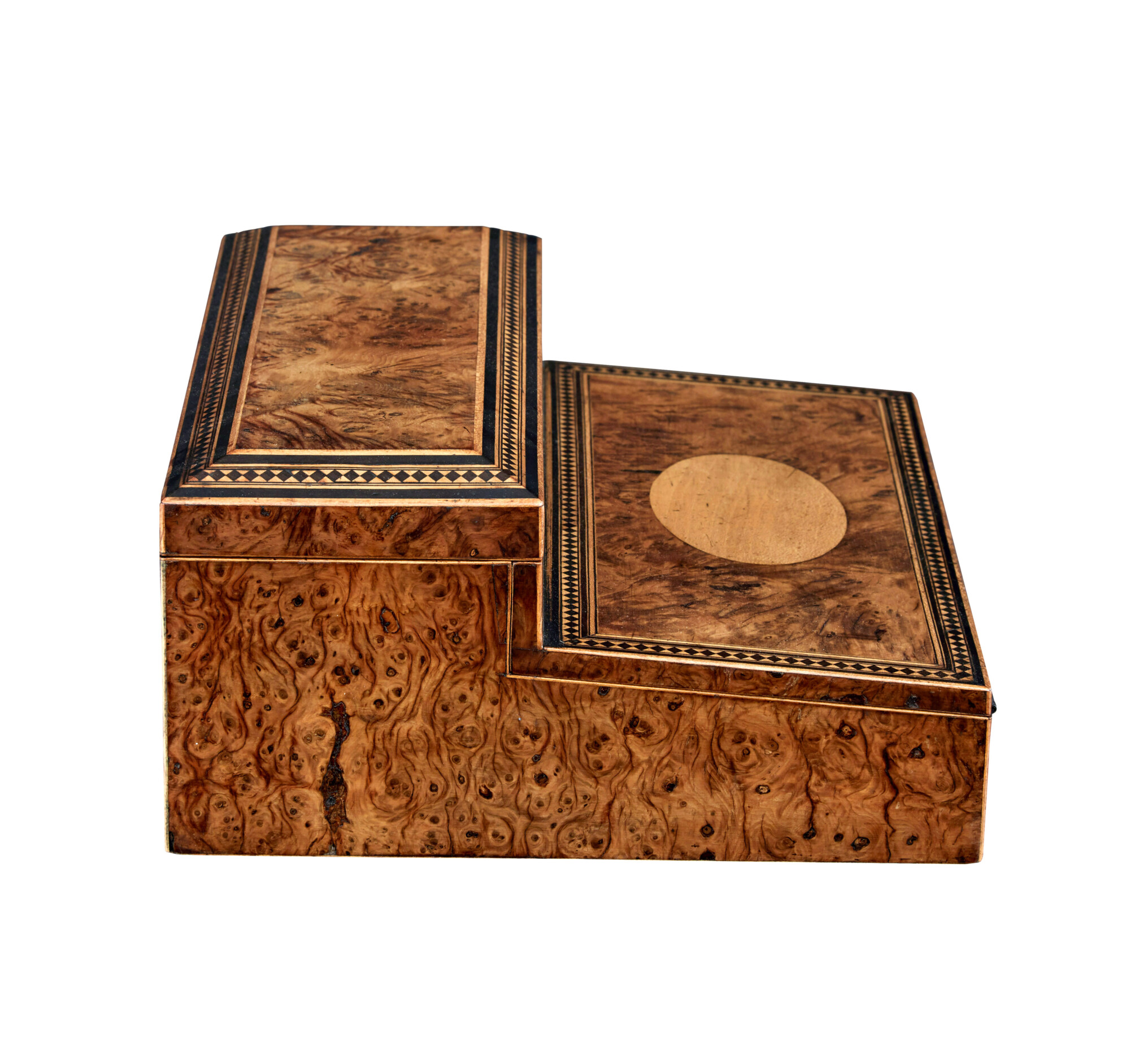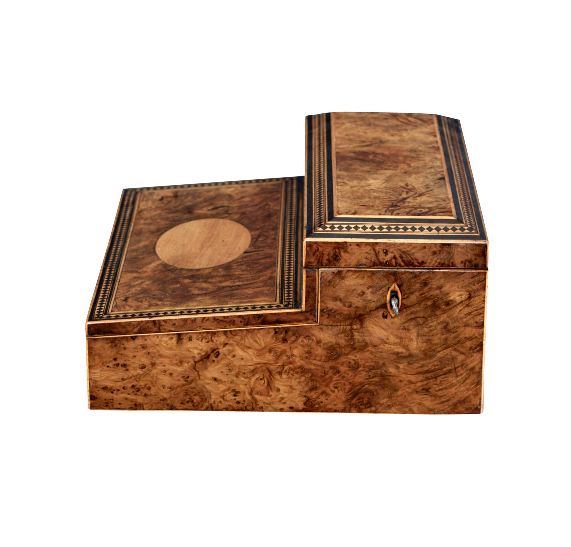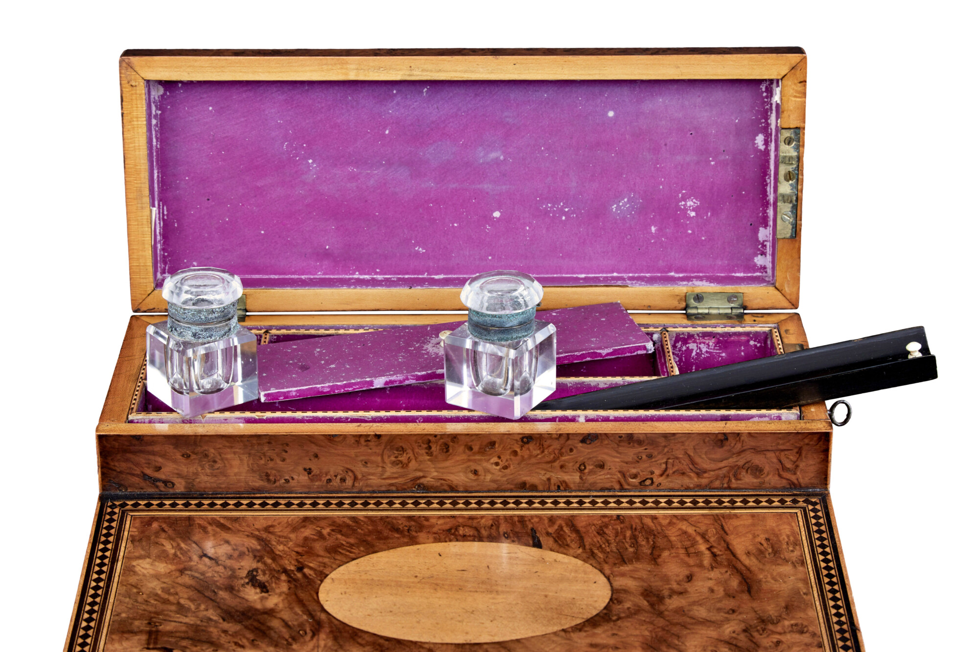 FINE QUALITY ENGLISH MADE VICTORIAN WRITING SLOPE. EXTERIOR OF RICH BURR WALNUT WITH TUNBRIDGE WARE INLAY DECORATION. TOP LID OPENS TO REVEAL A COMPARTMENT AND PEN TRAY FLANKED EITHER SIDE BY INK WELLS. WRITING SLOPE OPENS TO A RICH BLUE VELVET WRITING SURFACE, WHICH FOLDS BACK ON ITSELF TO REVEAL A WELL AND 2 SECRET DRAWERS.