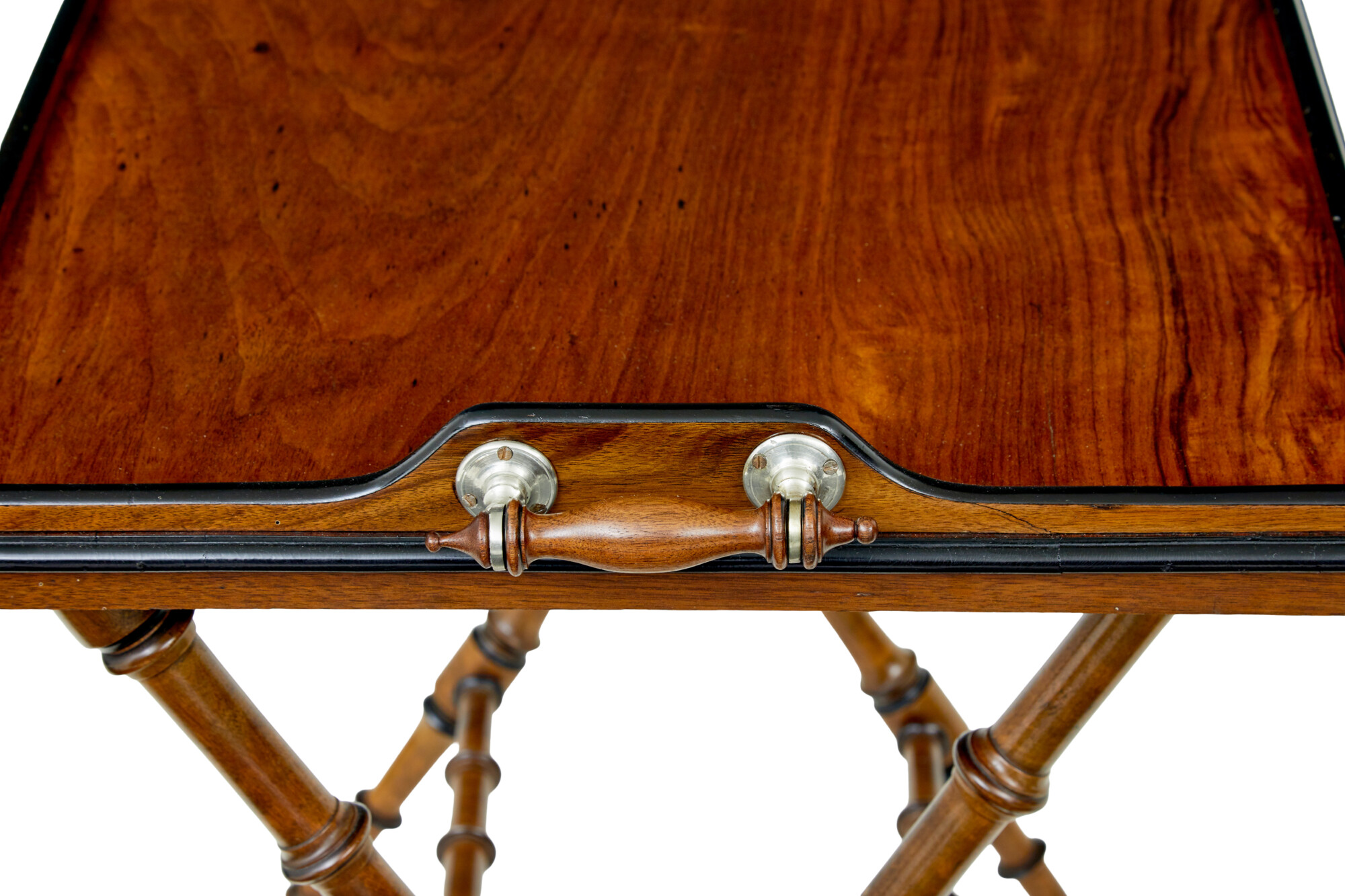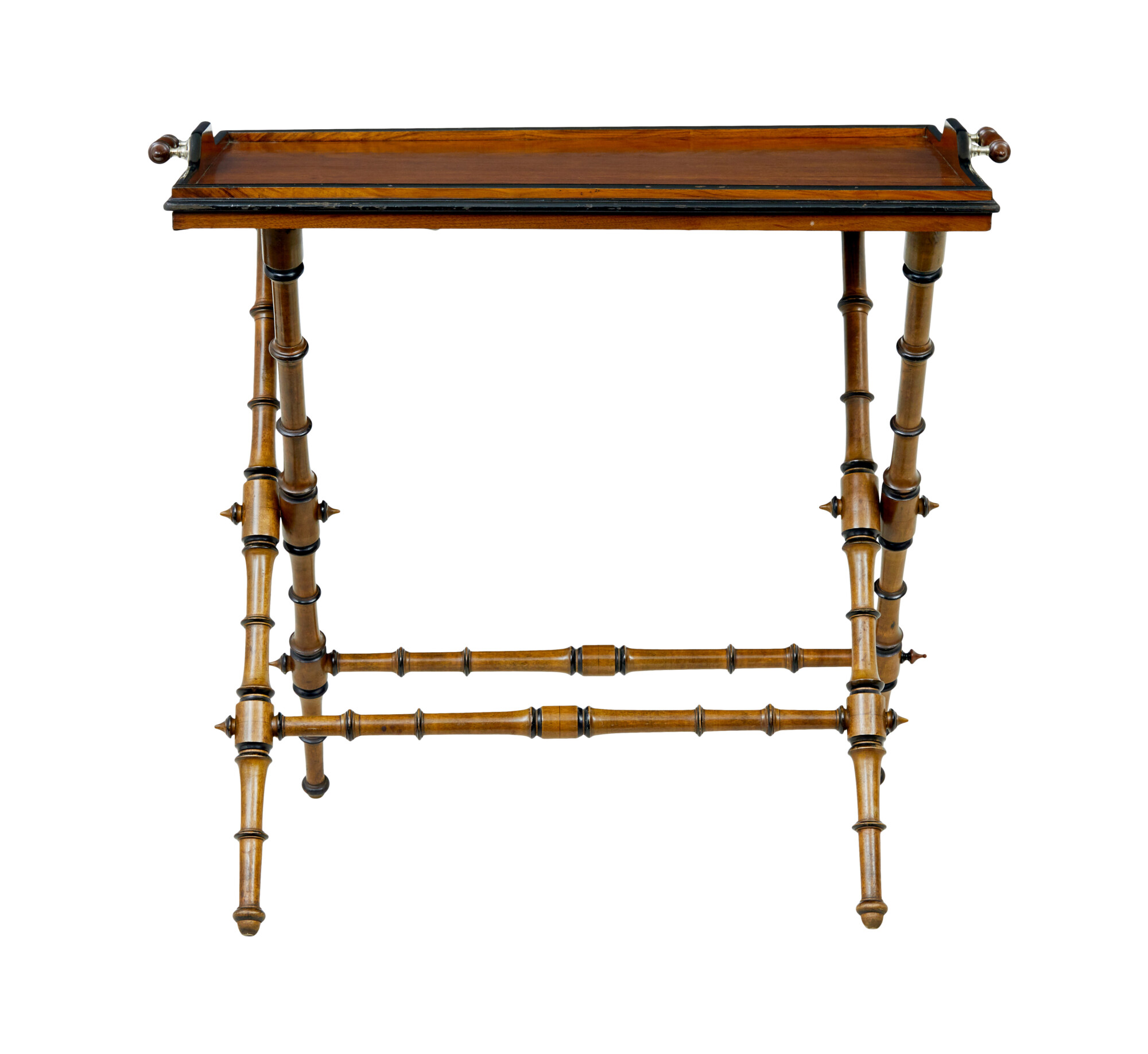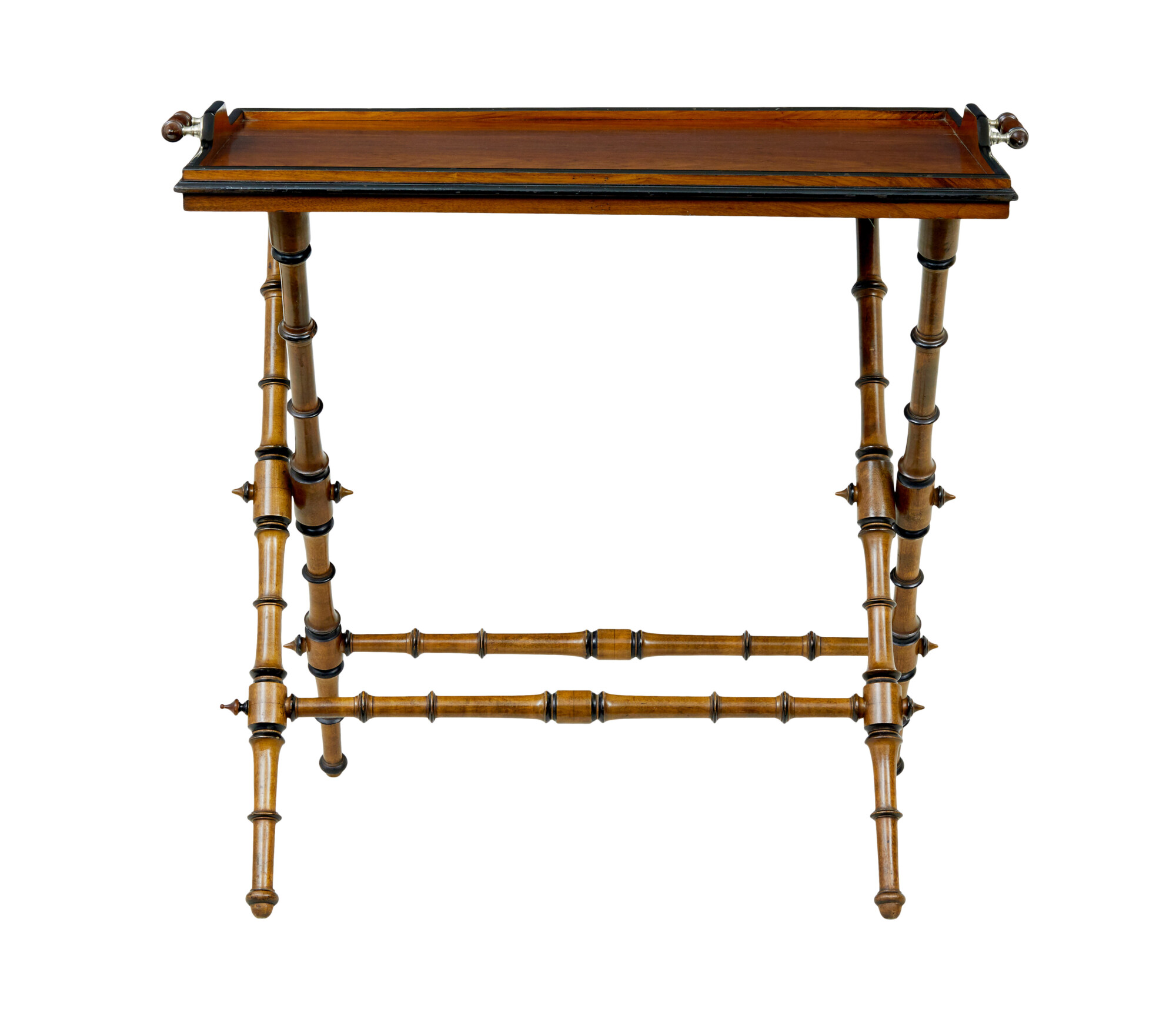 1 PIECE WALNUT TOP WITH GALLERY EDGE AND EBONISED MOULDING, DECORATIVE BRASS HANDLE MOUNTS AND TURNED HANDLES, LOCATES ONTO A SCISSOR SHAPED BASE WITH SUPERB QUALITY TURNING AND EBONISED DETAILING.