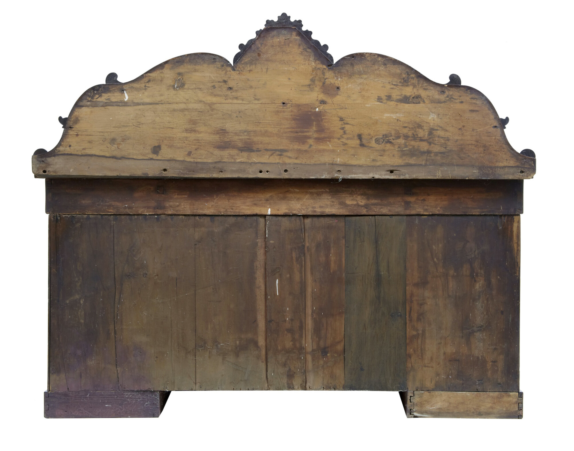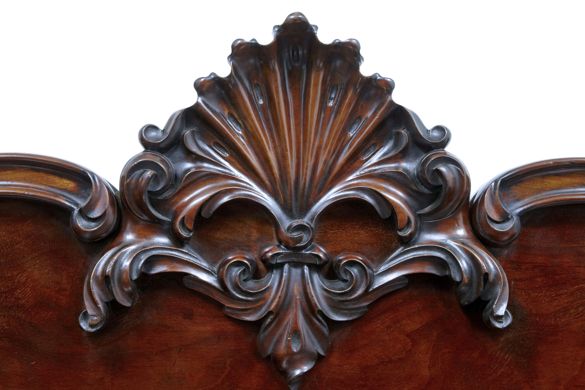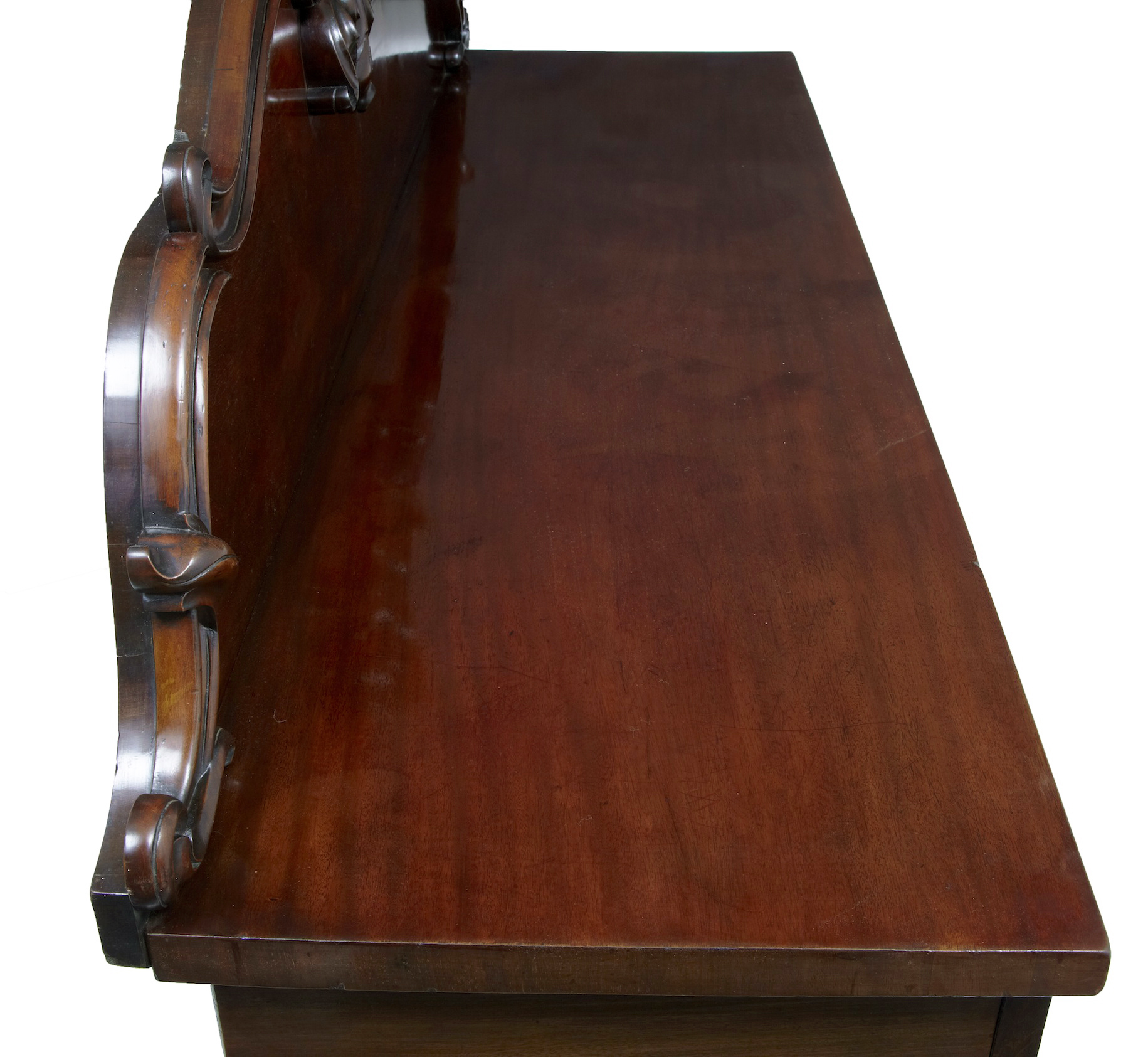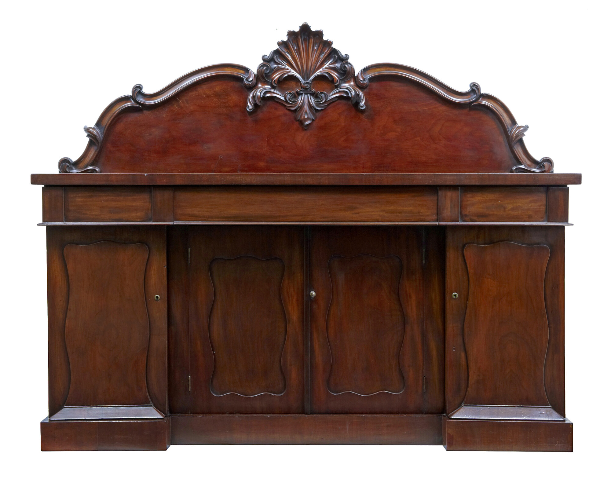 GOOD QUALITY MAHOGANY SIDEBOARD CIRCA 1835. LOVELY RICH COLOR. MAIN FEATURE IS THE DEEPLY CARVED STYLIZED FLORAL/SHELL CENTRAL CARVING. 2 PARTS. 3 DRAWERS ABOVE A DOUBLE DOOR CUPBOARD CONTAINING A SINGLE DRAWER, FLANKED EITHER SIDE BY A SINGLE DOOR CUPBOARD CONTAINING 1 SHELF.