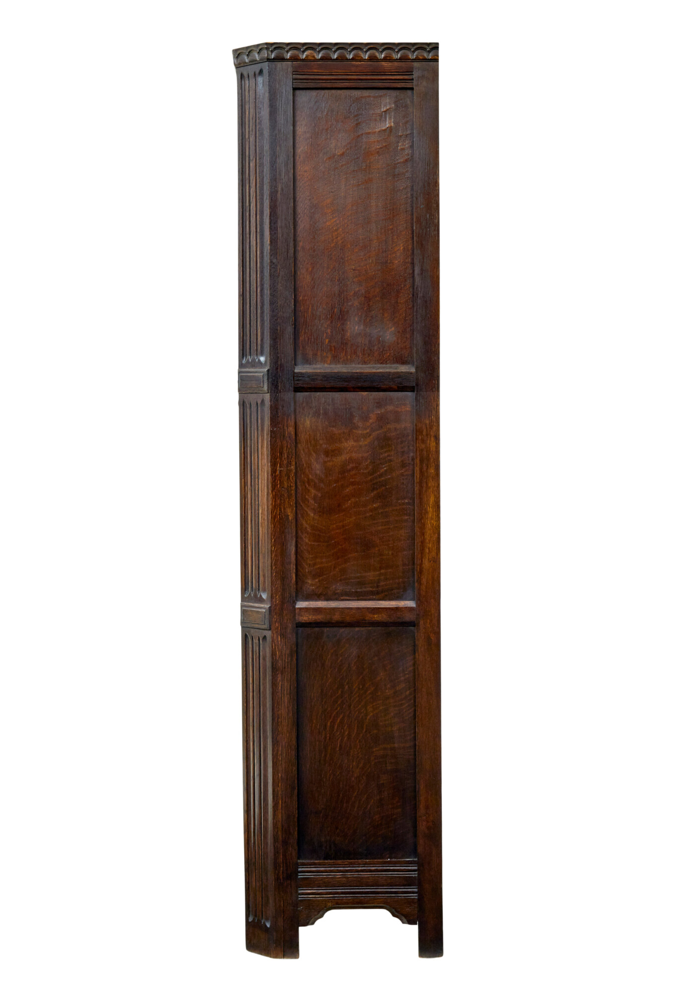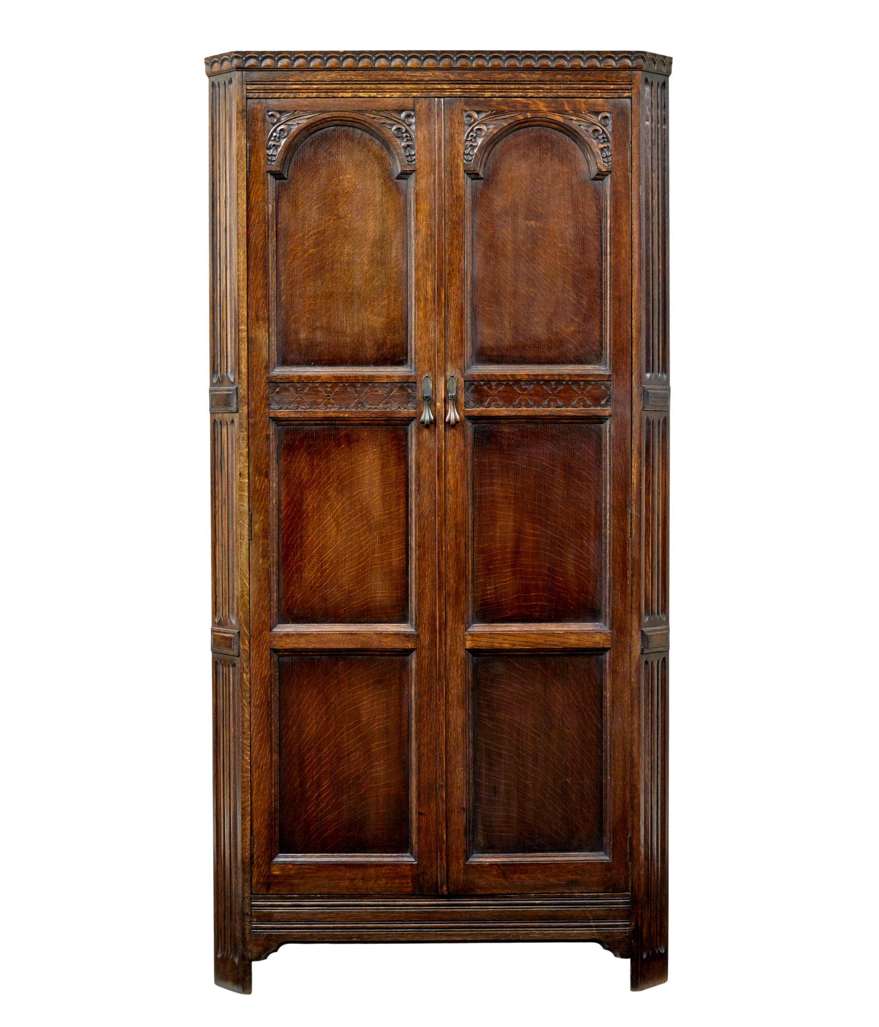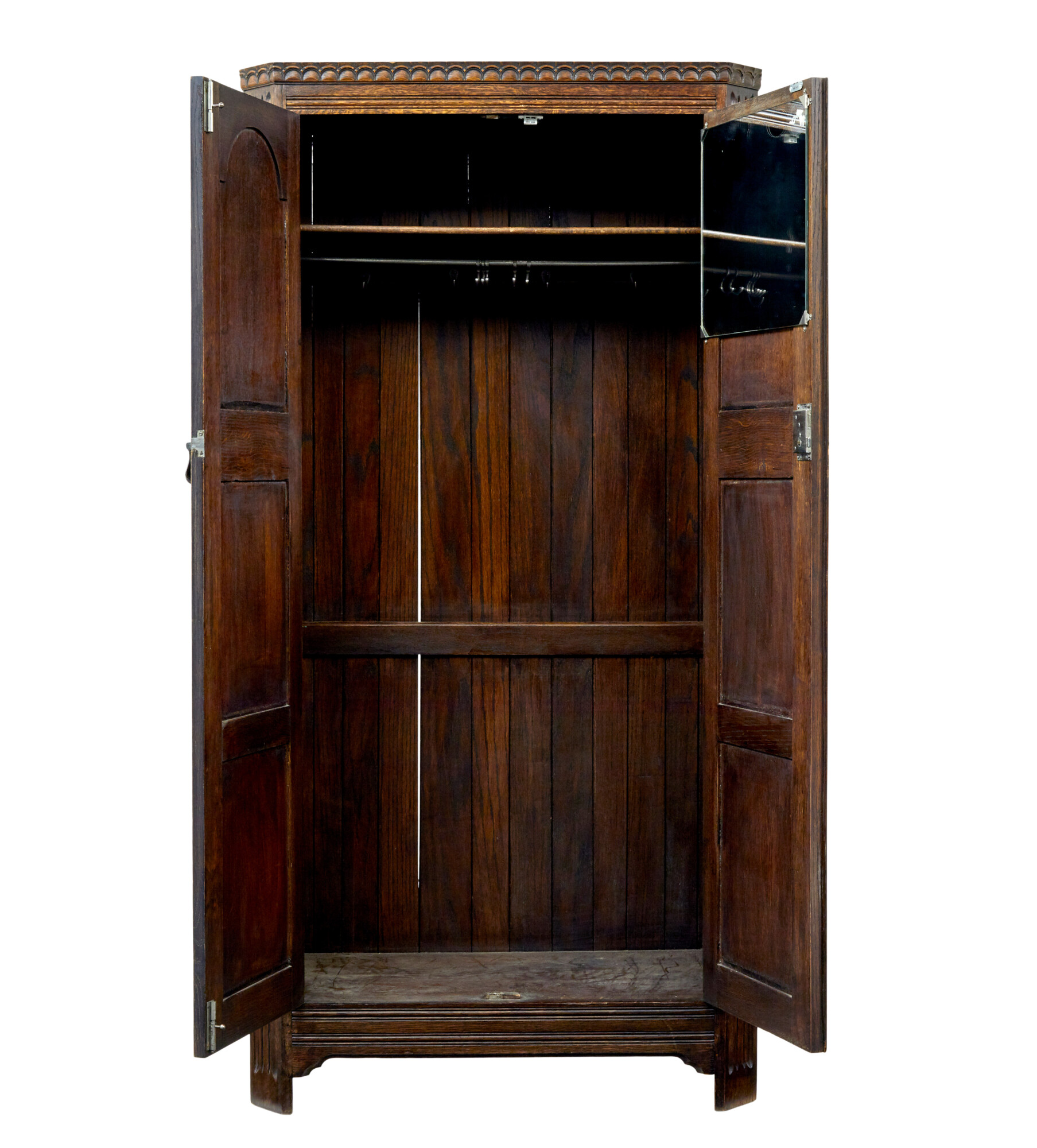 SINGLE PIECE, DECORATED WITH FIELDED PANELS AND CARVING TO THE DOORS AND SHALLOW CORNICE. CANTED CORNERS WITH FLUTING AND APPLIED MOLDING. DOUBLE DOORS OPEN TO AN INTERIOR OF A TOP SHELF, CLOTHES RAIL AND A MIRROR FITTED TO THE INSIDE OF THE DOOR.