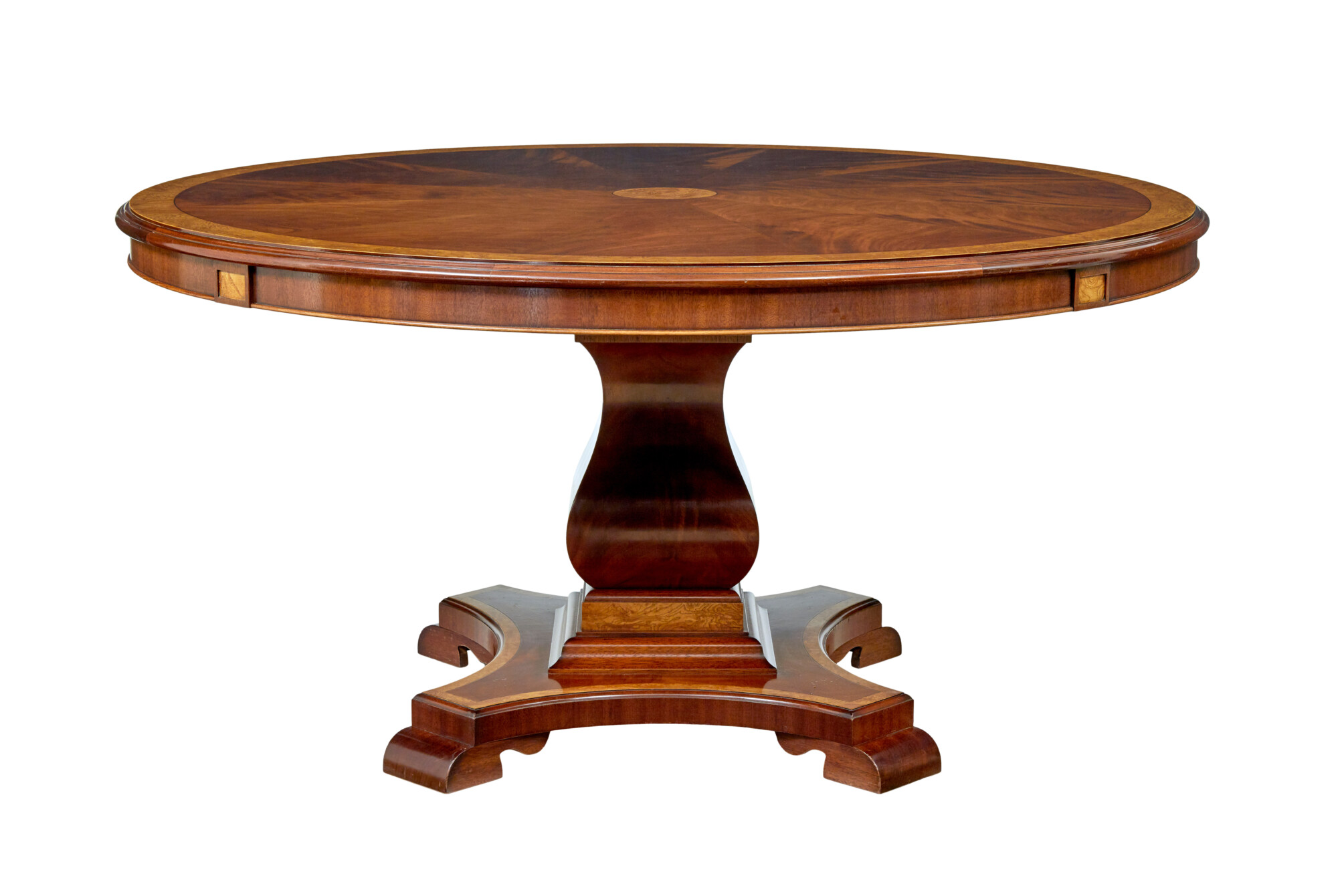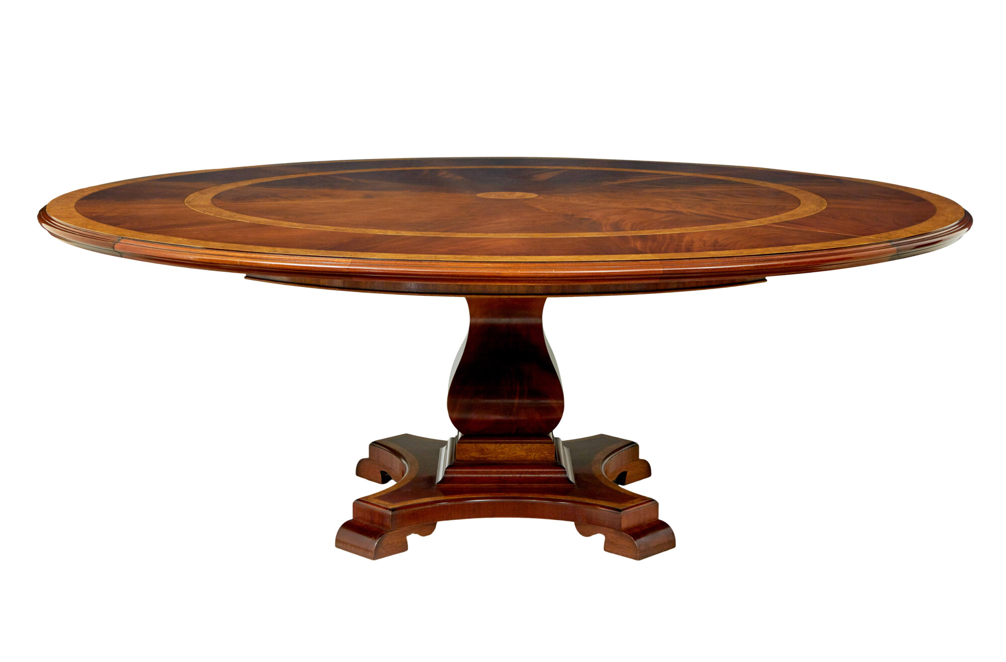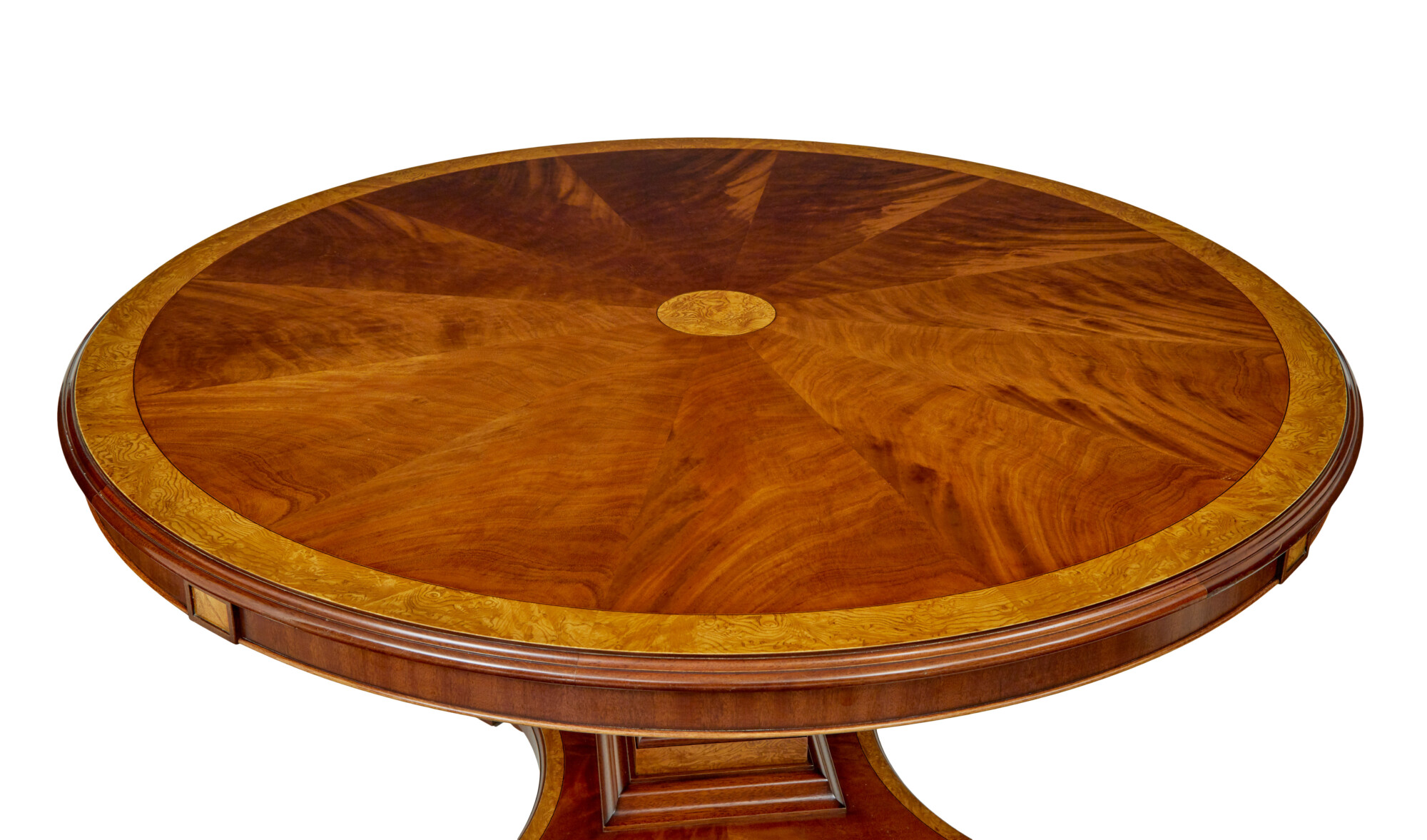 VENEERED IN FLAME MAHOGANY AND BURR OAK. CENTRAL BURR OAK CIRCLE WITH ARRANGED SEGMENTED FLAME MAHOGANY VENEERS FANNING OUT TO A FURTHER BURR OAK CROSS BANDED BORDER. WITHOUT THE 4 LEAVES THE TABLE IS 5 FOOT IN DIAMETER, WHEN THE LEAVES ARE IN PLACE THIS EXTENDS IT TO 7 FOOT, PROVIDING COMFORTABLE SEATING FOR 10. THE LEAVES ARE MADE IN THE SAME WOOD AND ACT TO MAKE THE TABLE LOOK AS ONE.