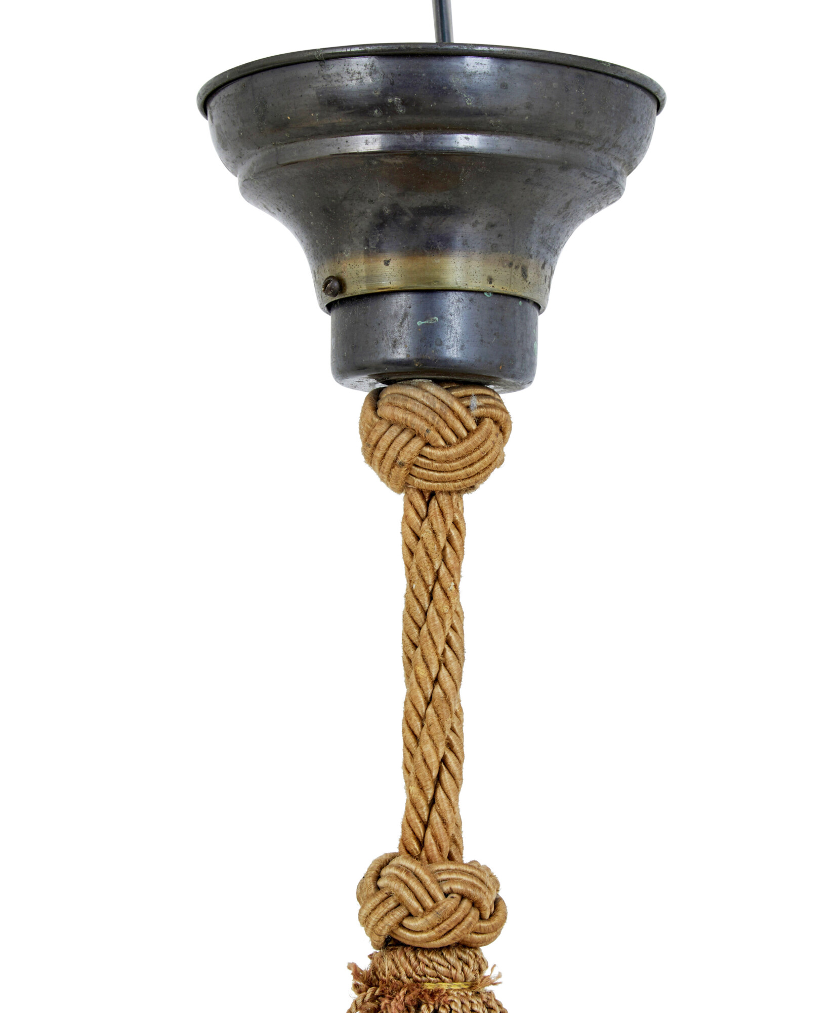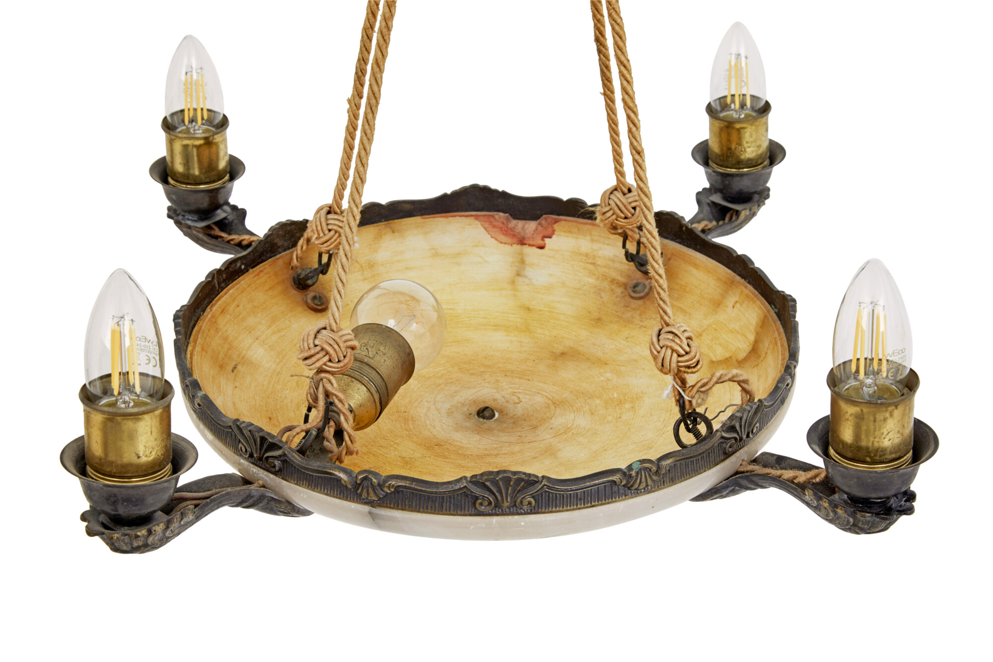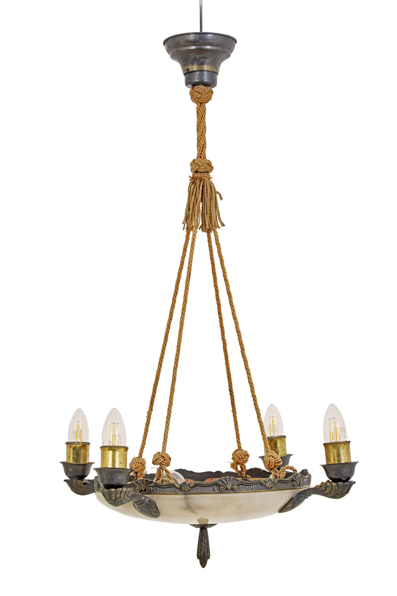 GOOD QUALITY ART DECO PERIOD LIGHT. FITTED WITH 4 CAST ARMS EACH WITH A BULB HOLDER AND A FURTHER BULB HOLDER IN THE DISH. SUSPENDED BY 4 ROPES UP TO A CENTRAL BRONZED CEILING ROSE.