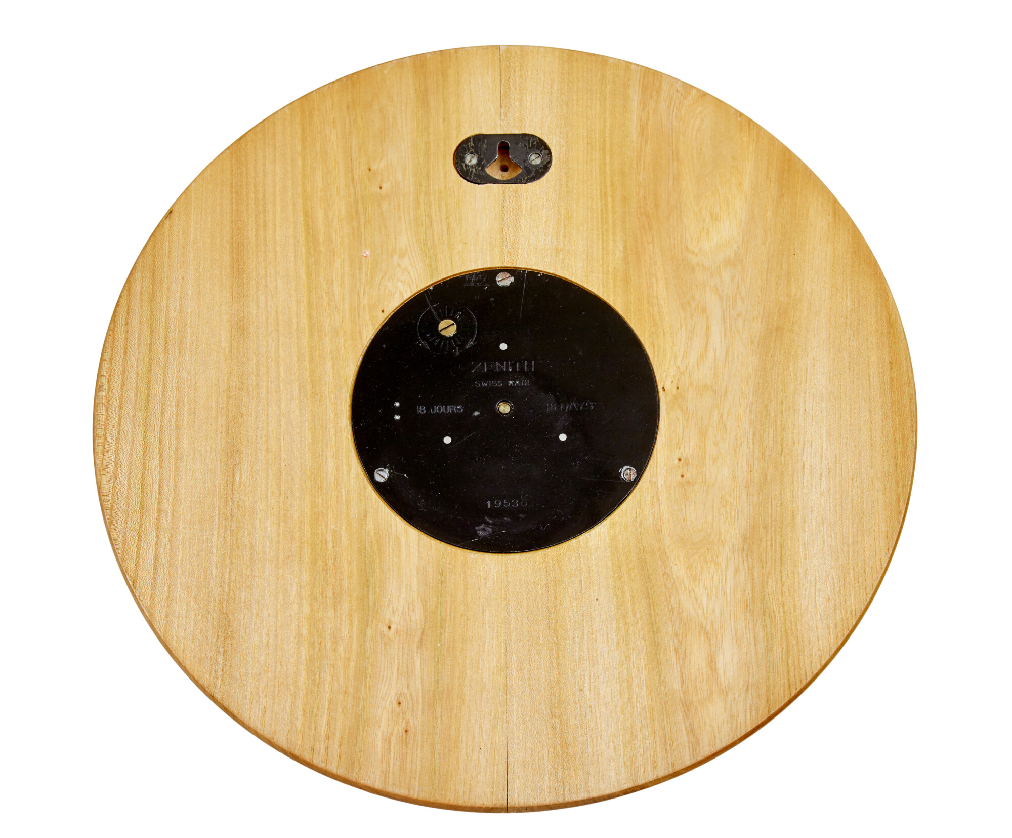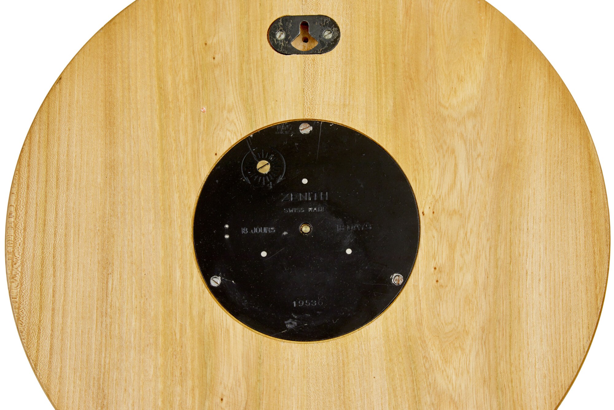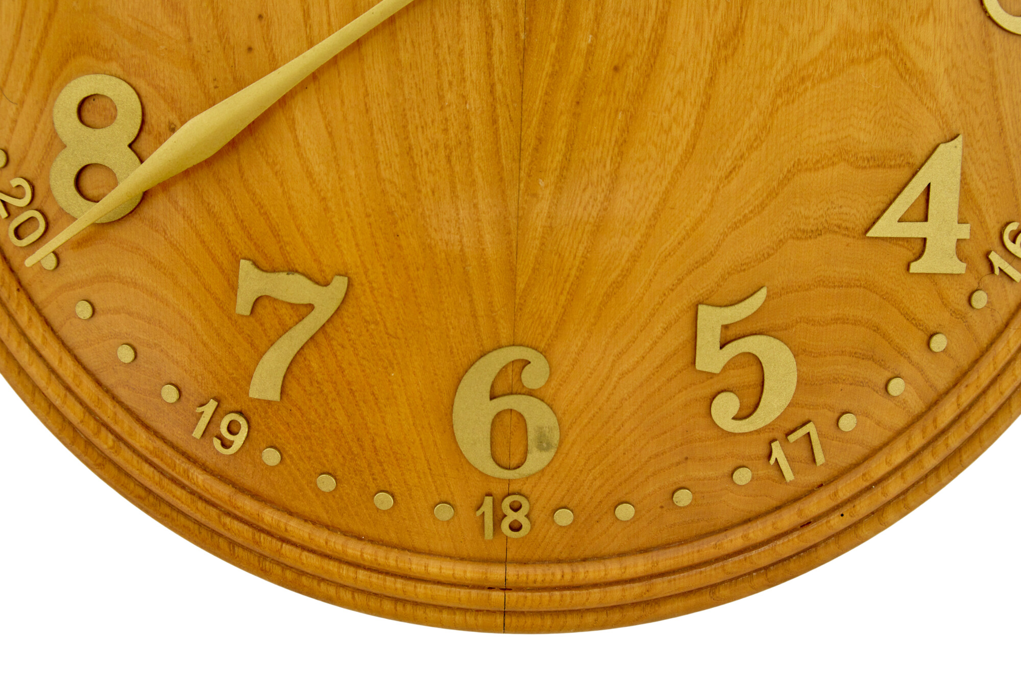 WELL KNOWN ART DECO SWISS MADE WALL CLOCK RETAILED BY HEAL’S IN THE 1930’S. CONVEX SHAPED ROUND CLOCK FACE WITH MOULDED EDGE. DECORATED WITH APPLIED BRASS NUMERALS AND HANDS, MARKING THE HOURS IN ARABIC NUMERALS AND SMALL BRASS CIRCLES FOR THE MINUTES. MADE IN ELM WITH A RICH GOLDEN COLOUR