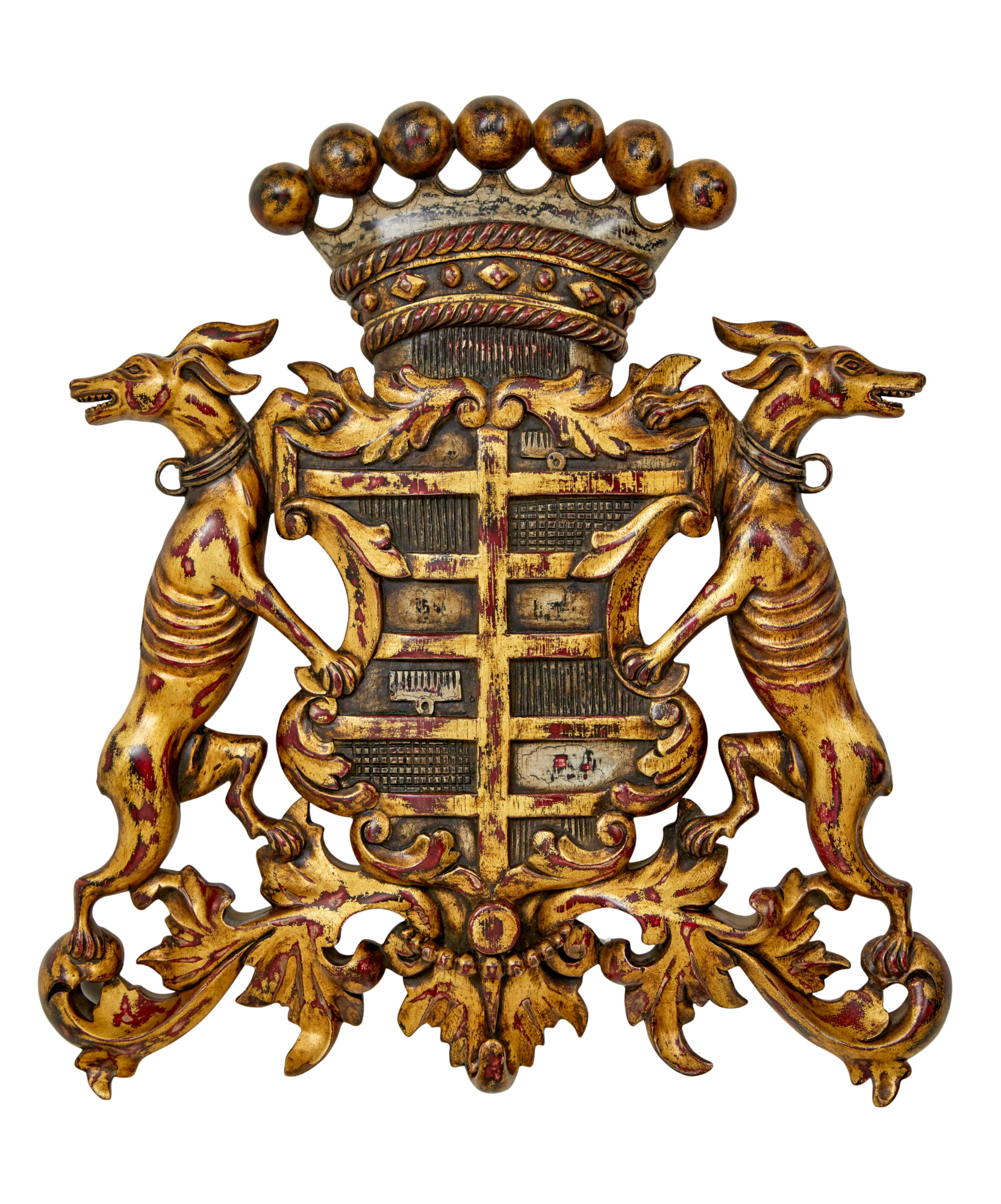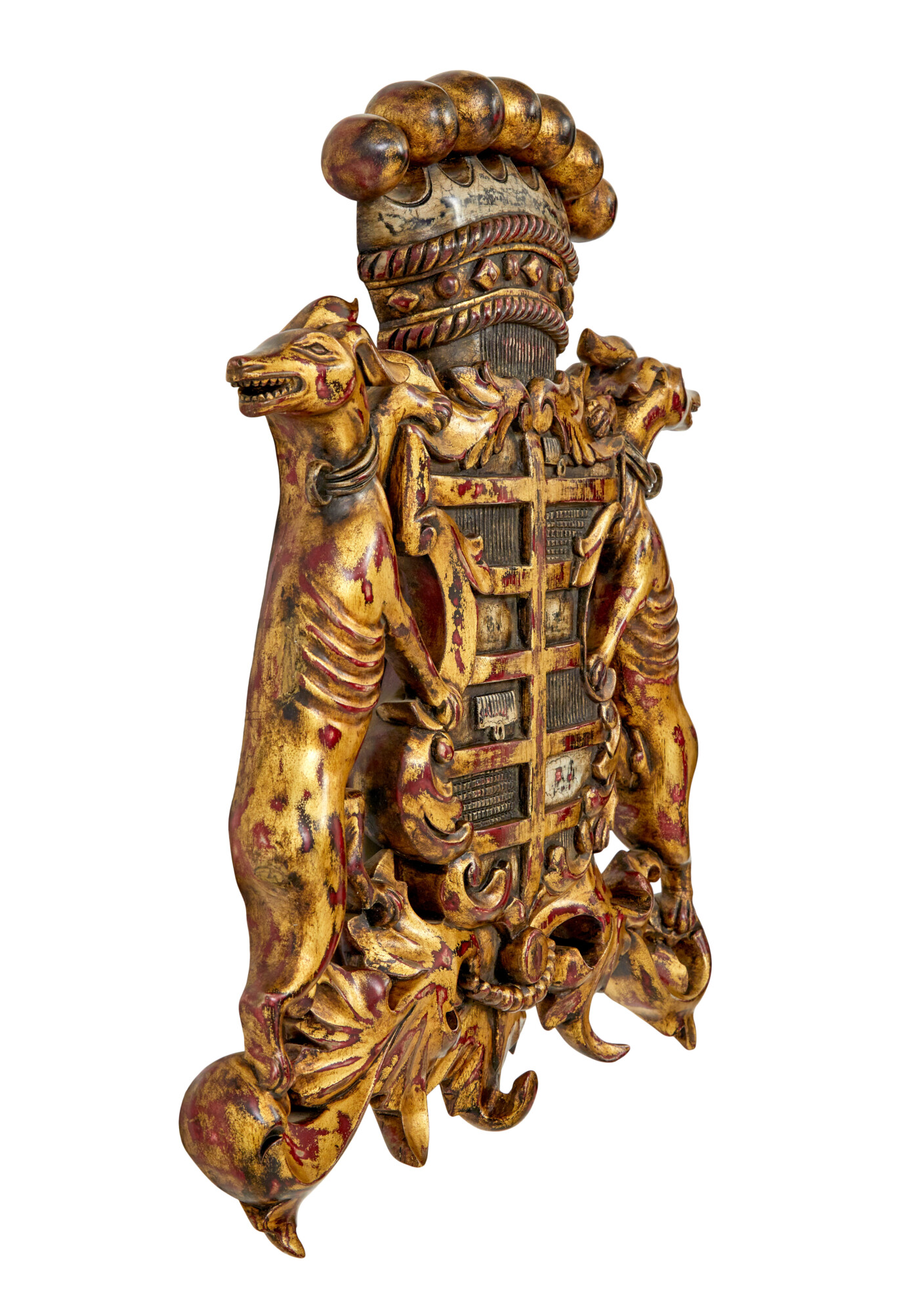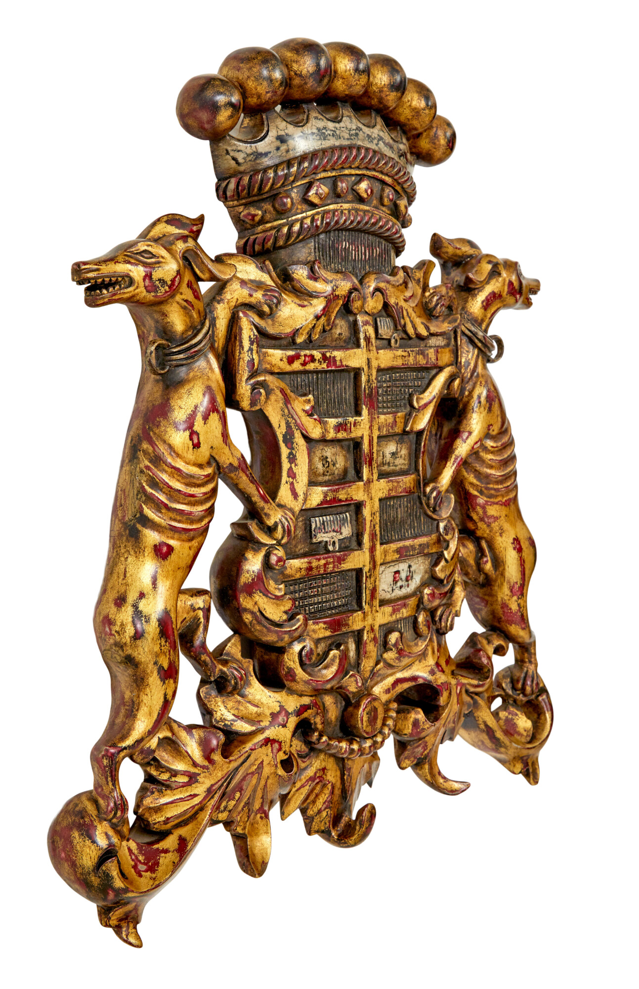 GOOD QUALITY GILT COLOURED COAT OF ARMS. CENTRAL SHIELD WITH ACANTHUS DECORATION, FLANKED EITHER SIDE BY OUTWARD FACING STANDING GREYHOUNDS.