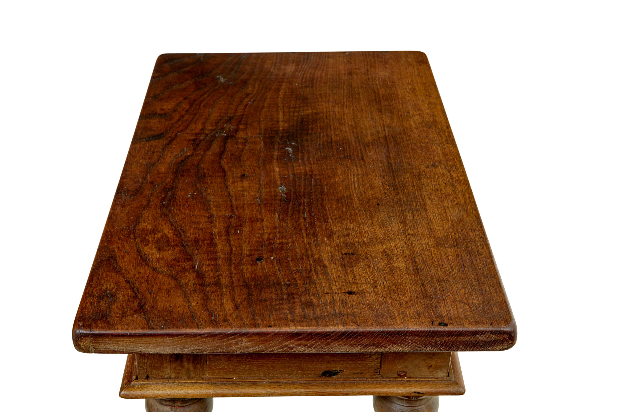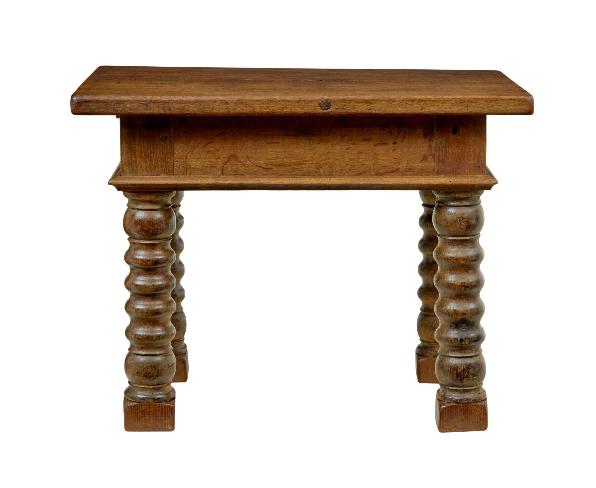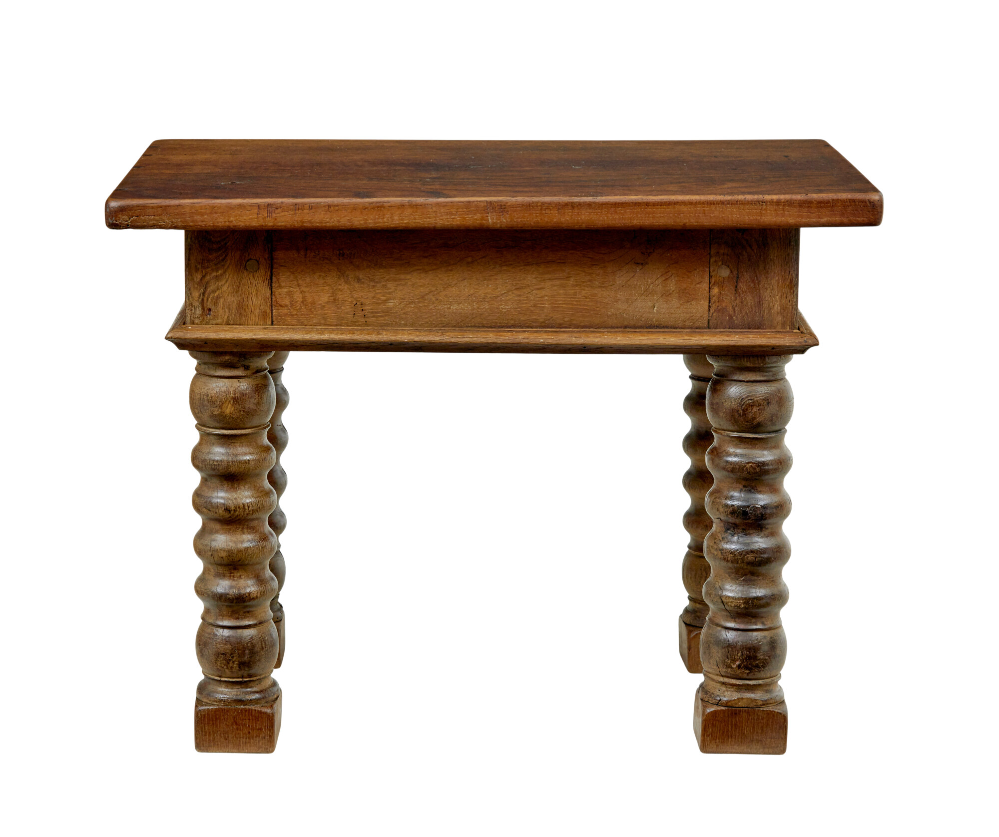 RECTANGULAR THICK TOP SURFACE, SITS ON A DEEP APRON FINISHED WITH A MOULDED EDGE. RAISED ON 4 BOBBIN TURNED LEGS, WHICH HAVE HAD BLOCKS LATER ADDED TO THE BOTTOM. IDEAL USE FOR TODAY AS A SIDE/LAMP TABLE.