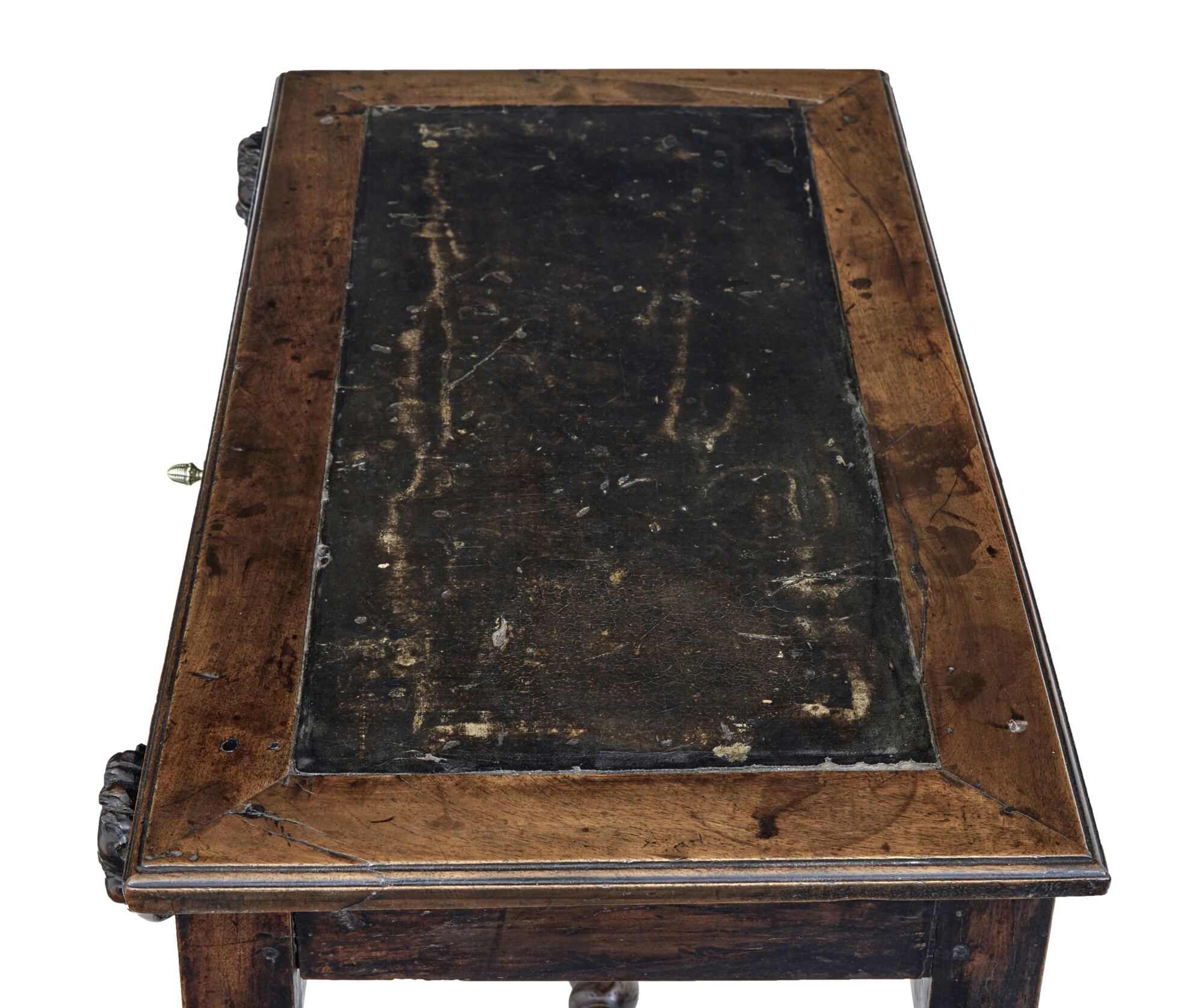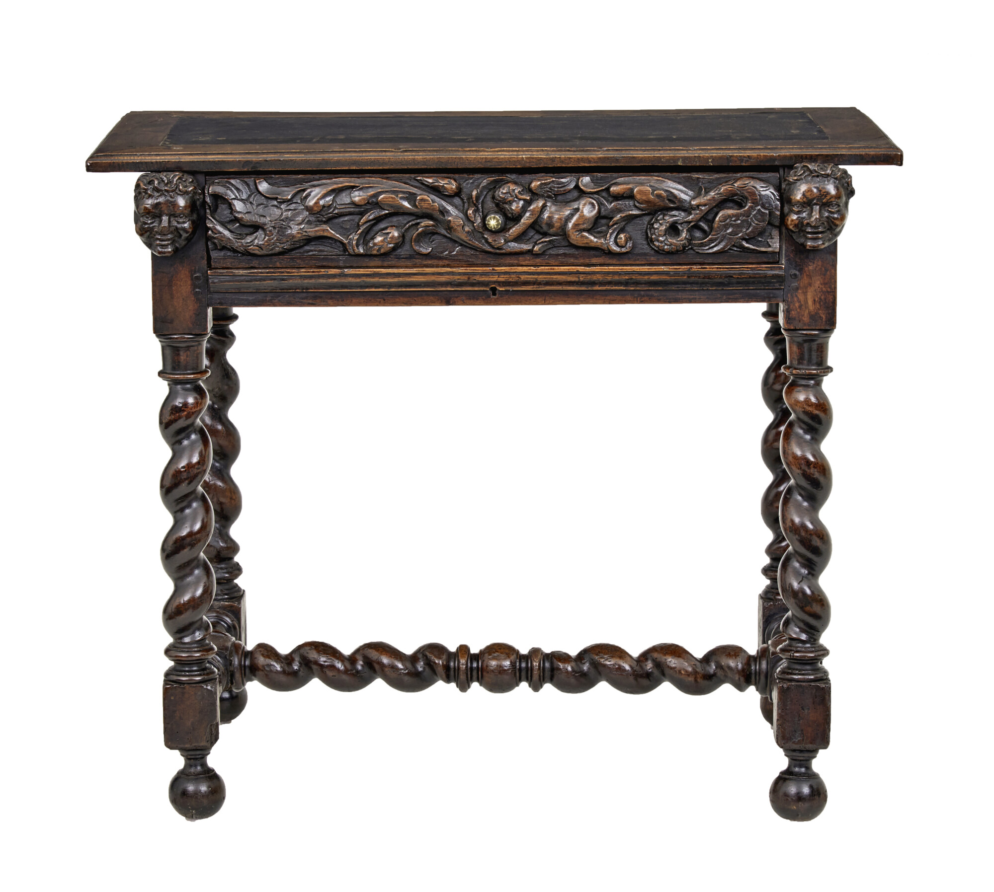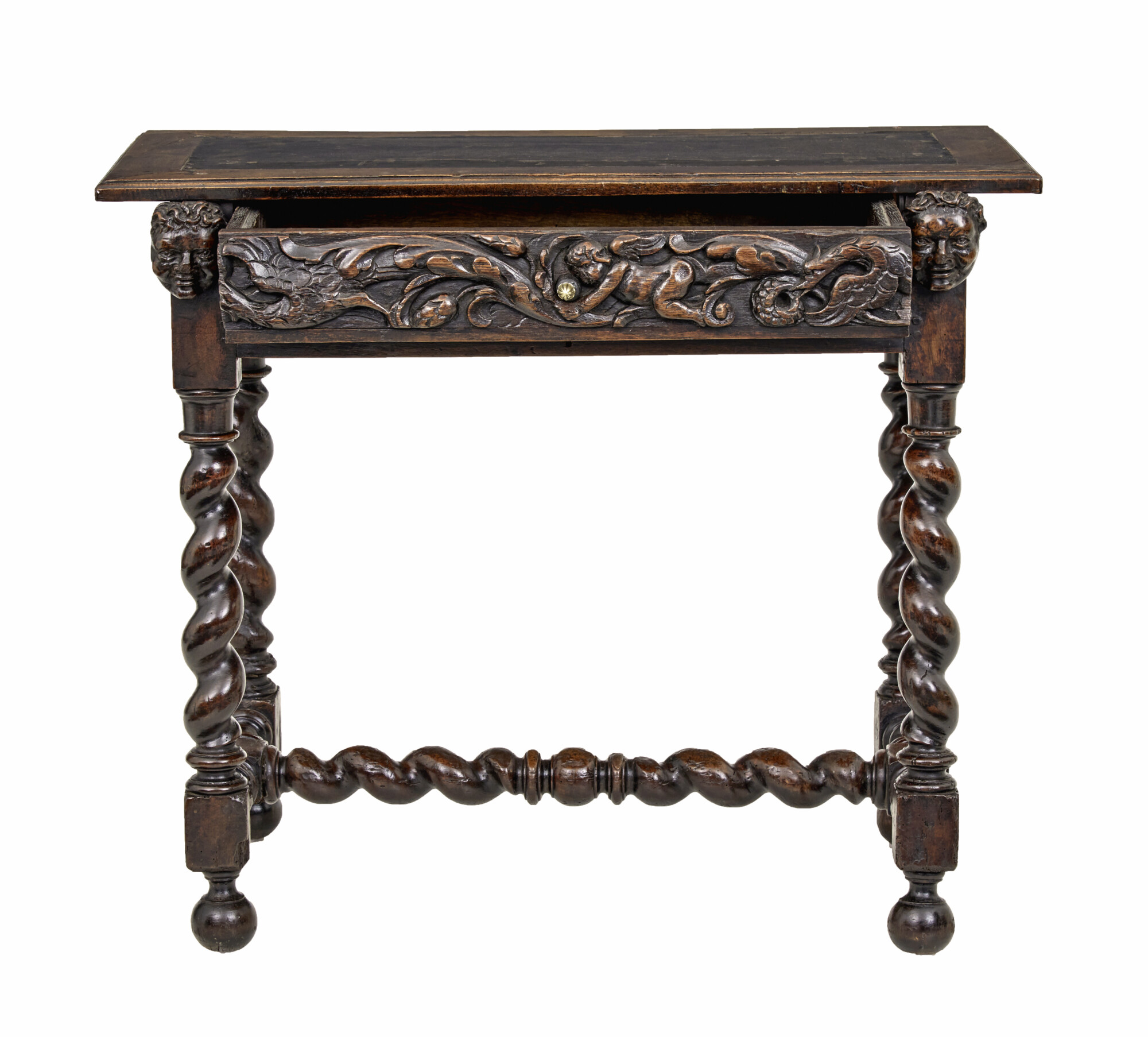 CHARACTER WALNUT SINGLE DRAWER SIDE TABLE. TOP WITH INSET LEATHER PANEL AND WALNUT BORDER. BELOW A PROFUSELY CARVED DRAWER WITH LATER BRASS HANDLE, FLANKED EITHER SIDE BY GROTESQUES.