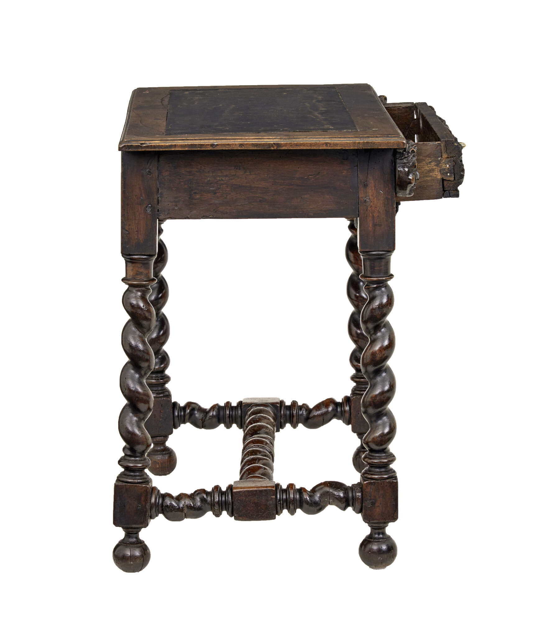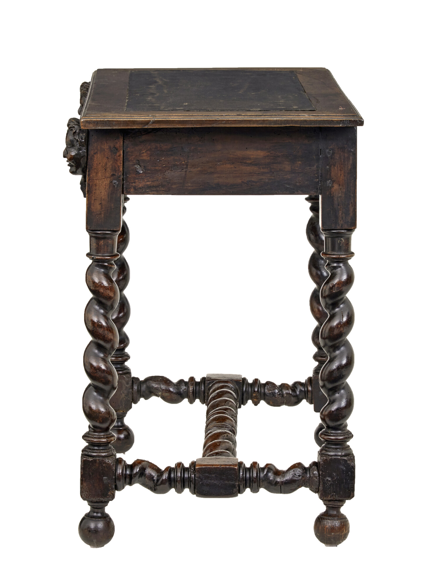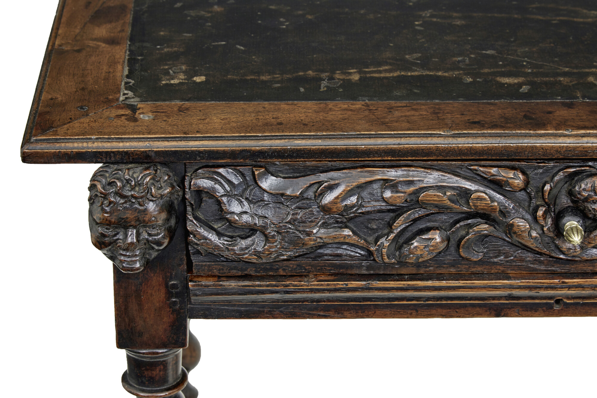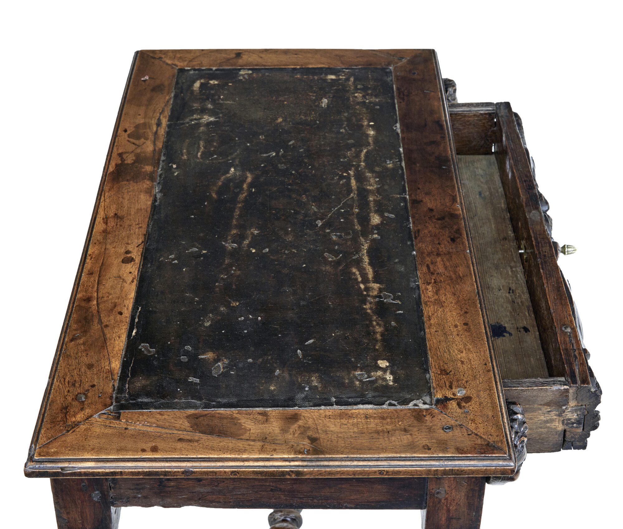 CHARACTER WALNUT SINGLE DRAWER SIDE TABLE. TOP WITH INSET LEATHER PANEL AND WALNUT BORDER. BELOW A PROFUSELY CARVED DRAWER WITH LATER BRASS HANDLE, FLANKED EITHER SIDE BY GROTESQUES.