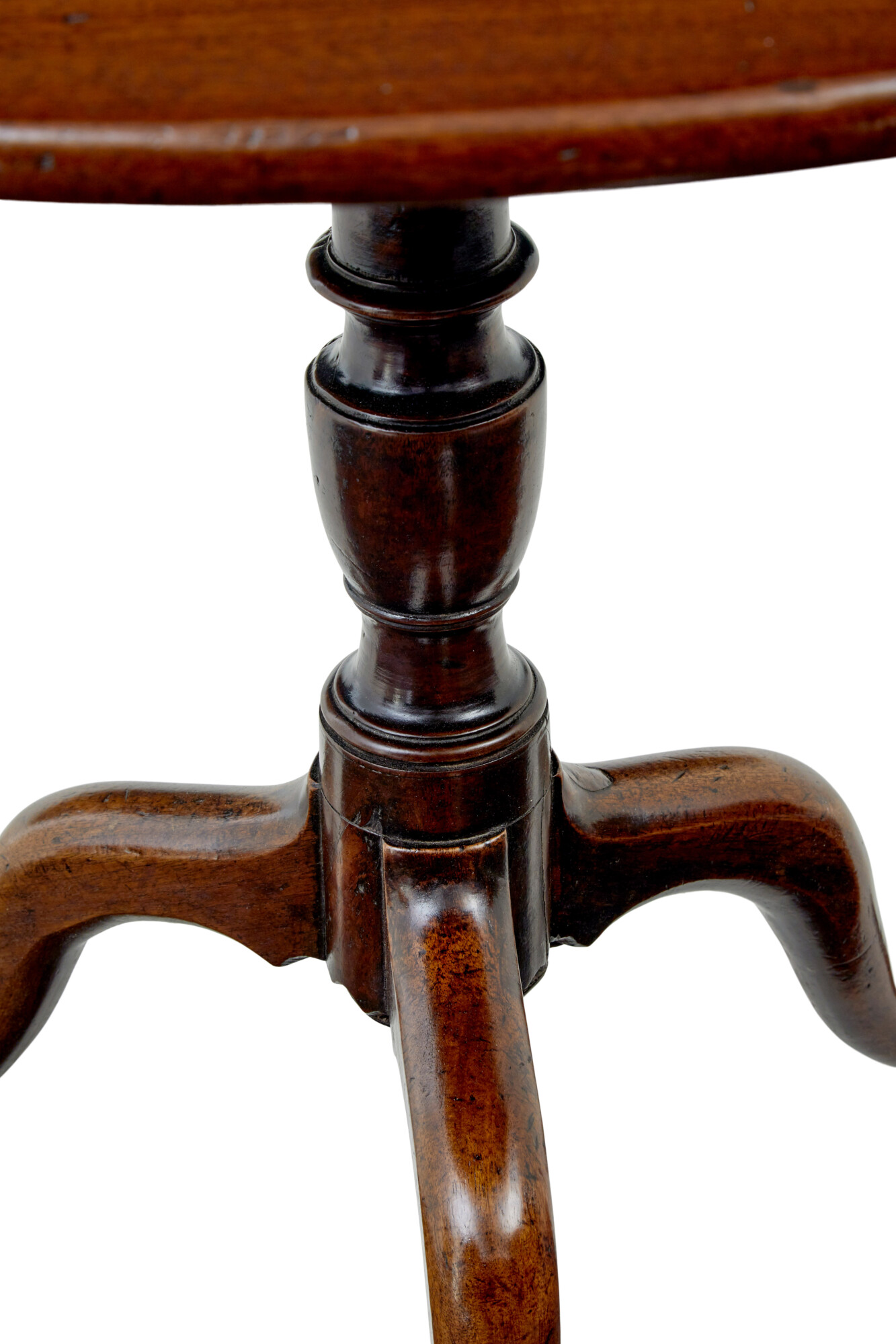 CIRCULAR TOP WITH BULL NOSED EDGE. FUNCTIONING TILT MECHANISM. RAISED ON A TURNED STEM AND 3 SCROLLING LEGS WITH HAND CARVED PAD FOOT. ORIGINAL COLOUR AND PATINA.