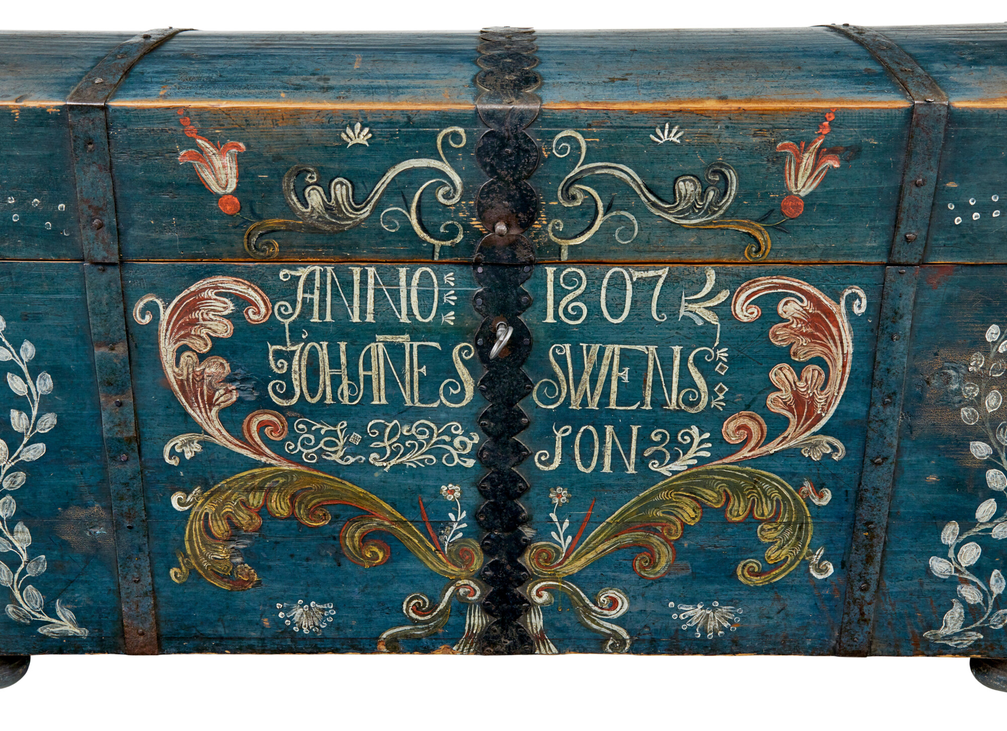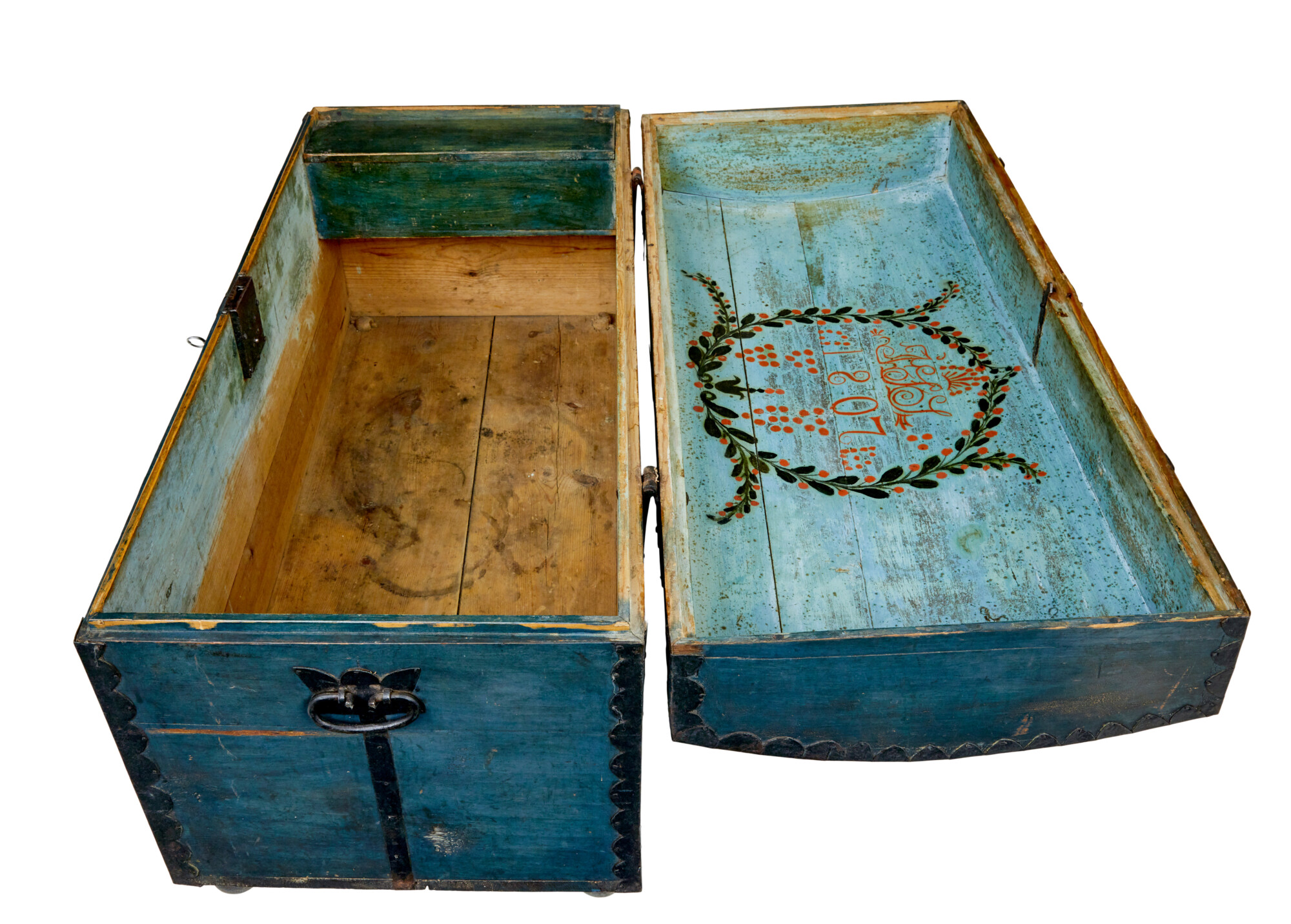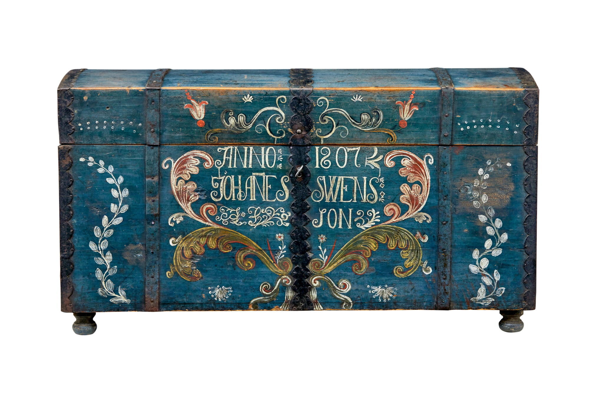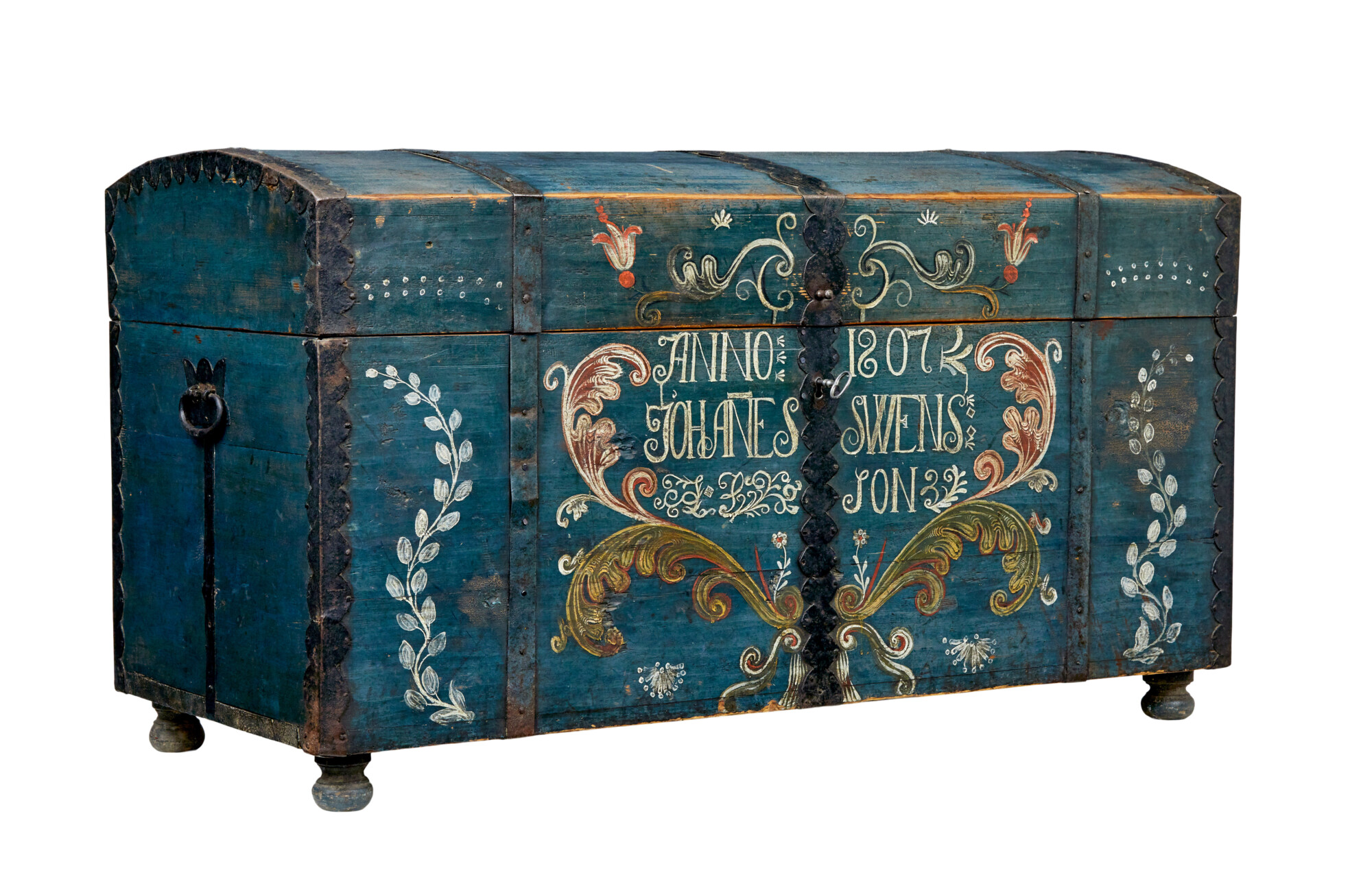 DOME TOPPED WITH AN OVERALL BASE BLUE/GREY COLOUR SCHEME, BLACK METAL STRAP WORK AND CARRYING HANDLES. BEAUTIFULLY HAND PAINTED TO THE FRONT WITH FLORALS AND SWAGS, DATE AND FIRST OWNERS NAMES. SUBSTANTIAL LID OPENS TO REVEAL AND FURTHER PAINTED INTERIOR WITH DATE AND INITIALS INSIDE A HAND PAINTED WREATH AND THE STANDARD FITTED CANDLE BOX. ALL UNUSUALLY RAISED ON THE ORIGINAL SMALL BUN FEET. REMARKABLY SUPPLIED WITH 2 WORKING KEYS FOR THE ORIGINAL WORKING LOCK.