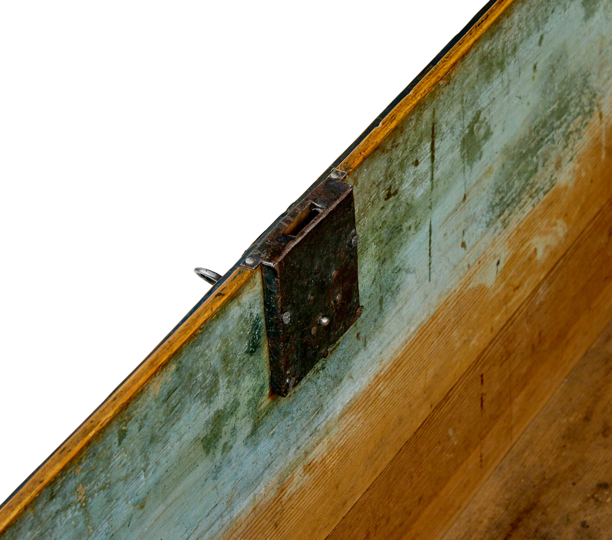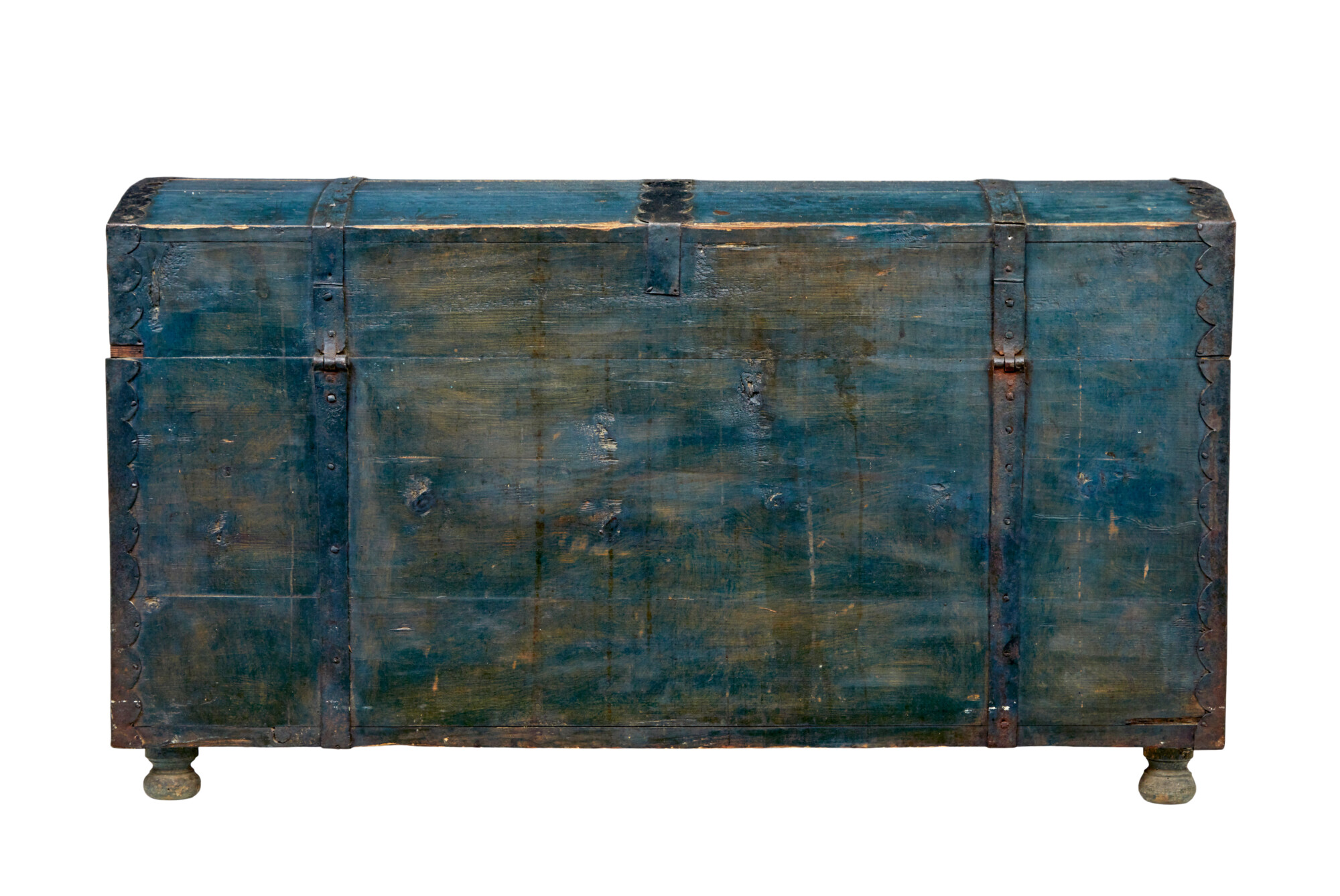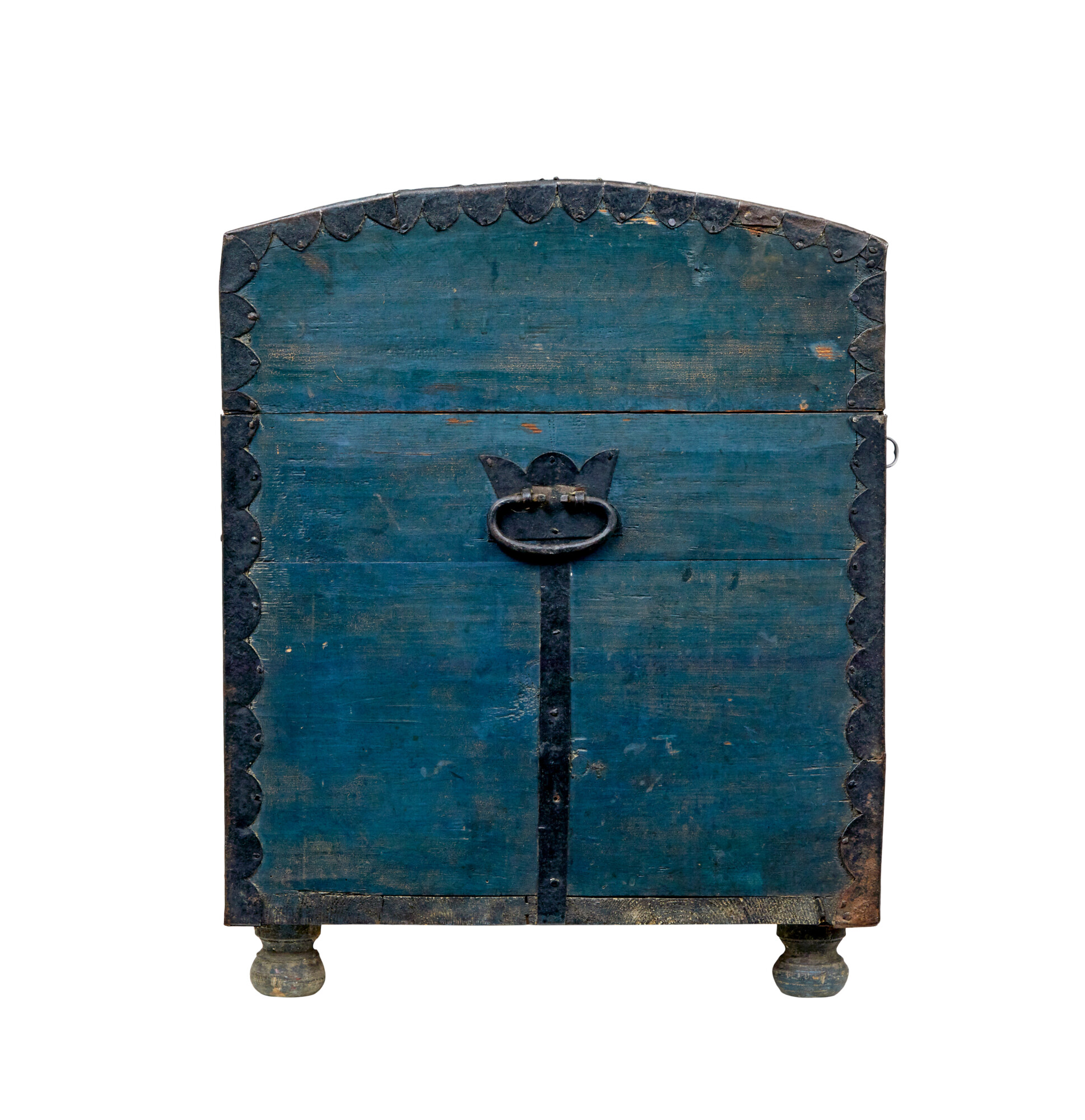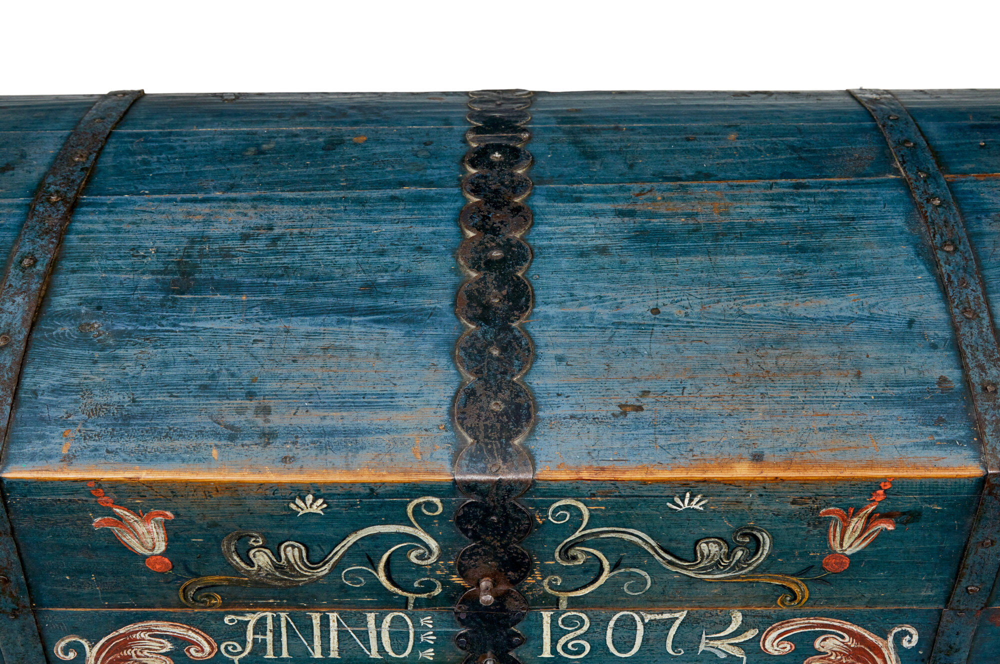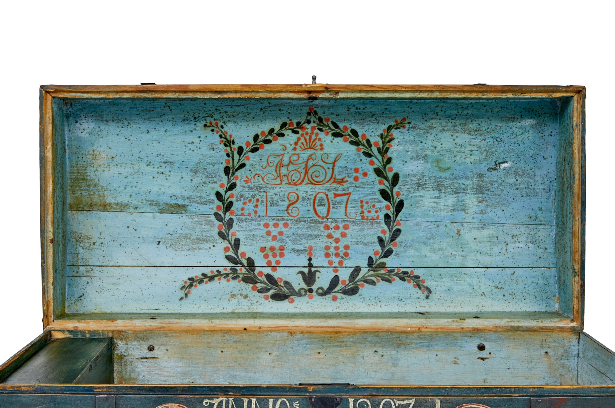 DOME TOPPED WITH AN OVERALL BASE BLUE/GREY COLOUR SCHEME, BLACK METAL STRAP WORK AND CARRYING HANDLES. BEAUTIFULLY HAND PAINTED TO THE FRONT WITH FLORALS AND SWAGS, DATE AND FIRST OWNERS NAMES. SUBSTANTIAL LID OPENS TO REVEAL AND FURTHER PAINTED INTERIOR WITH DATE AND INITIALS INSIDE A HAND PAINTED WREATH AND THE STANDARD FITTED CANDLE BOX. ALL UNUSUALLY RAISED ON THE ORIGINAL SMALL BUN FEET. REMARKABLY SUPPLIED WITH 2 WORKING KEYS FOR THE ORIGINAL WORKING LOCK.