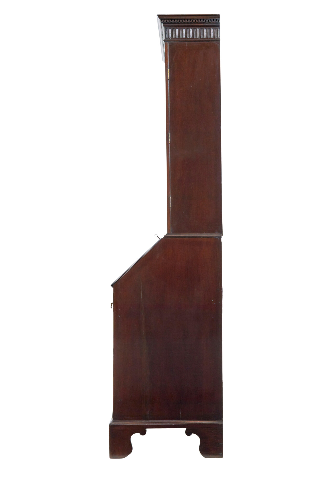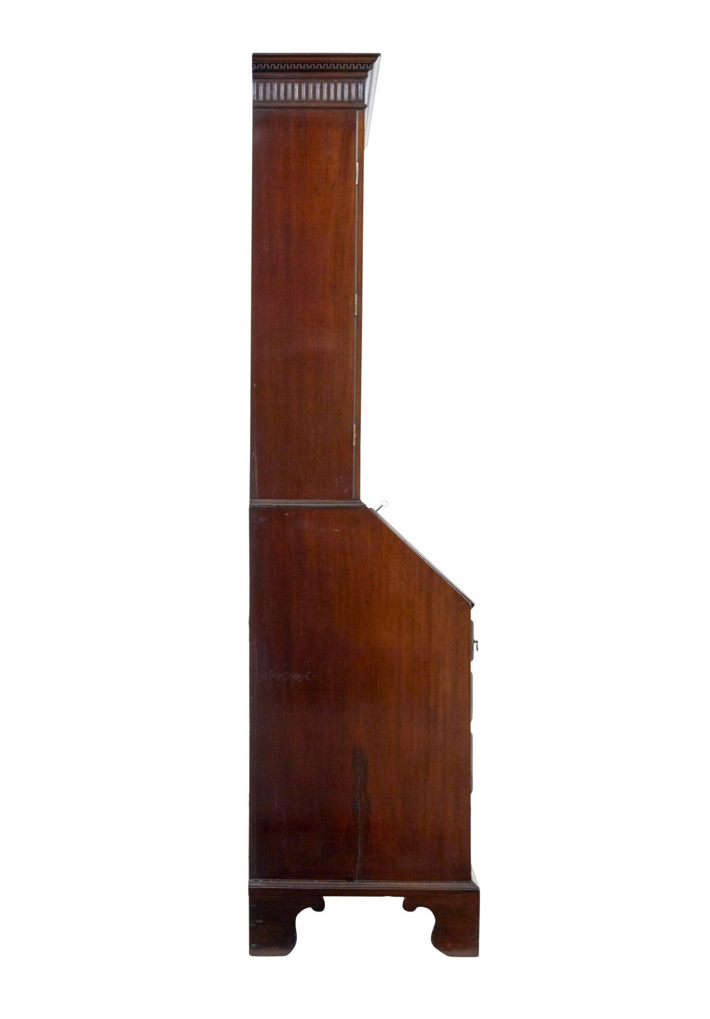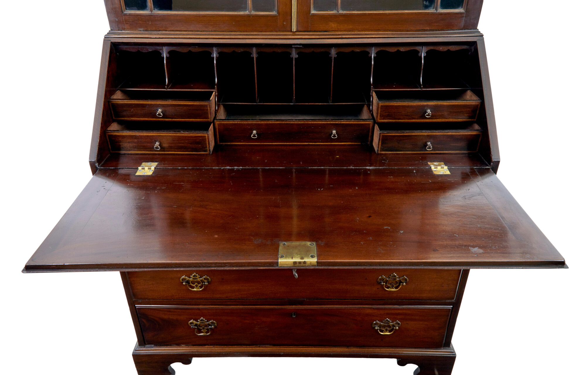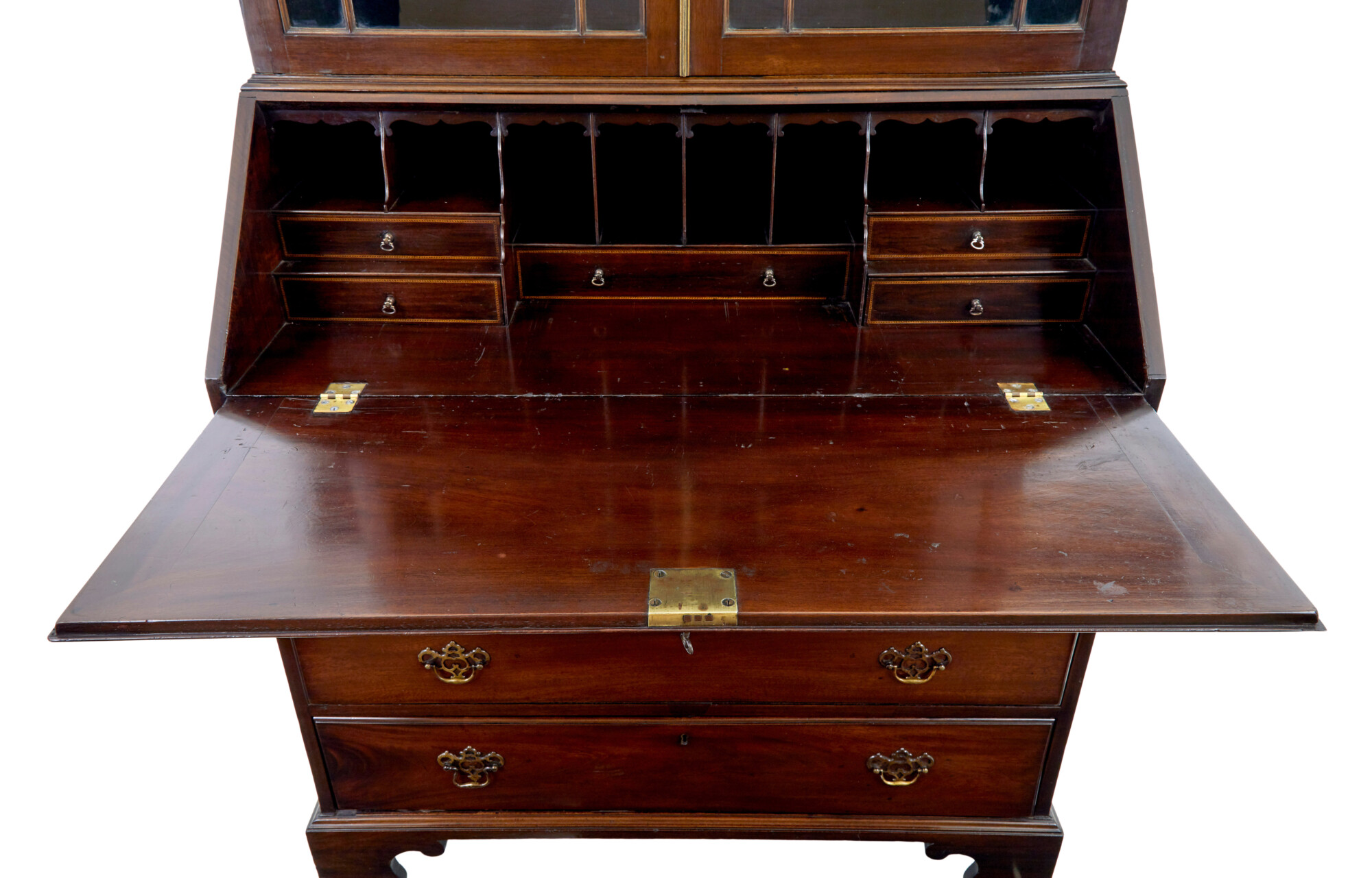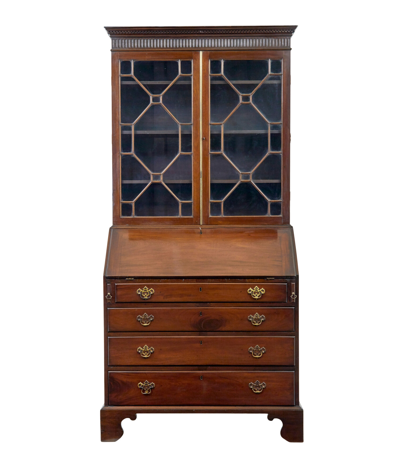 TOP BOOKCASE SECTION WITH A CARVED DENTIL FREIZE CORNICE, BELOW WHICH THE ASTRAL GLAZED DOUBLE DOORS OPEN TO REVEAL 3 ADJUSTABLE SHELVES. BOTTOM SECTION, WITH FALL THAT DROPS DOWN ONTO BEARERS TO FORM THE WRITING SURFACE AND ACCESS TO THE FITTED INTERIOR OF PIGEON HOLES AND INLAID DRAWERS. BELOW THE FALL ARE 4 GRADUATING DRAWERS FITTED WITH ORNATE BRASS HANDLES.