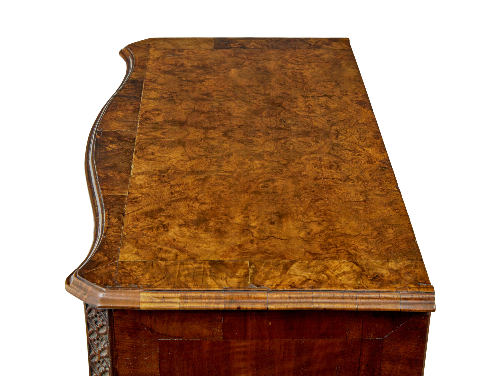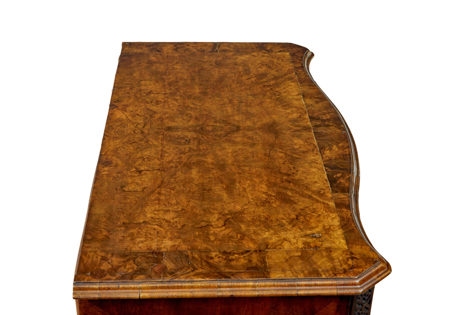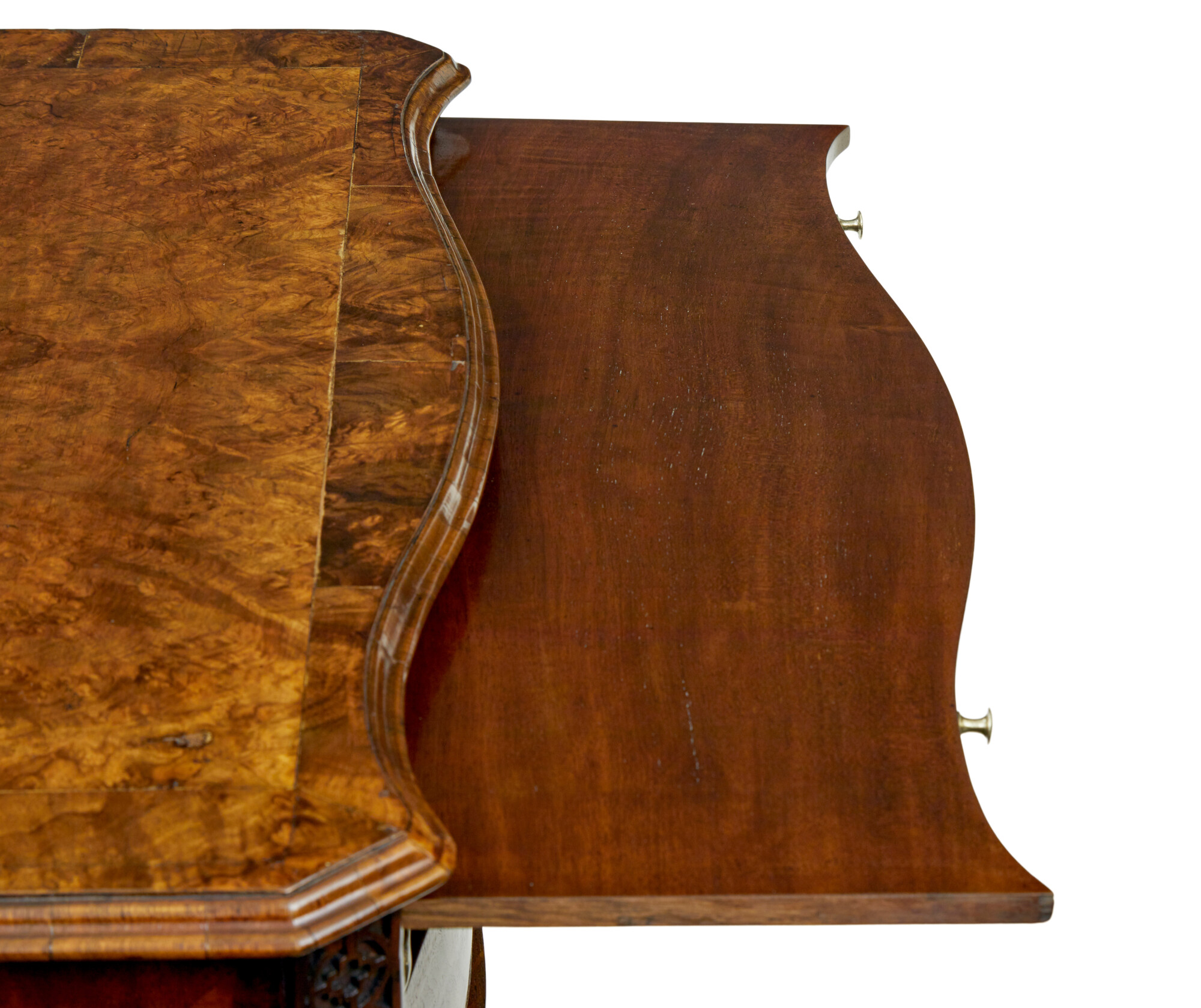 SHAPED TOP WHICH ECHOES THE REST OF THE SERPENTINE SHAPED DRAWER FRONTS.  BURR WALNUT WITH BURR WALNUT CROSS BANDING.  BRUSHING SLIDE DIRECTLY BELOW THE TOP SURFACE AND A FURTHER 4 GRADUATING DRAWERS WITH CROSS BANDED DRAWER FRONTS, FITTED WITH BRASS SWAN NECK HANDLES.  CANTED CORNERS WITH GOOD QUALITY BLIND FRETWORK.  RAISED ON 4 SLIGHTLY SPLAYED BRACKET FEET.