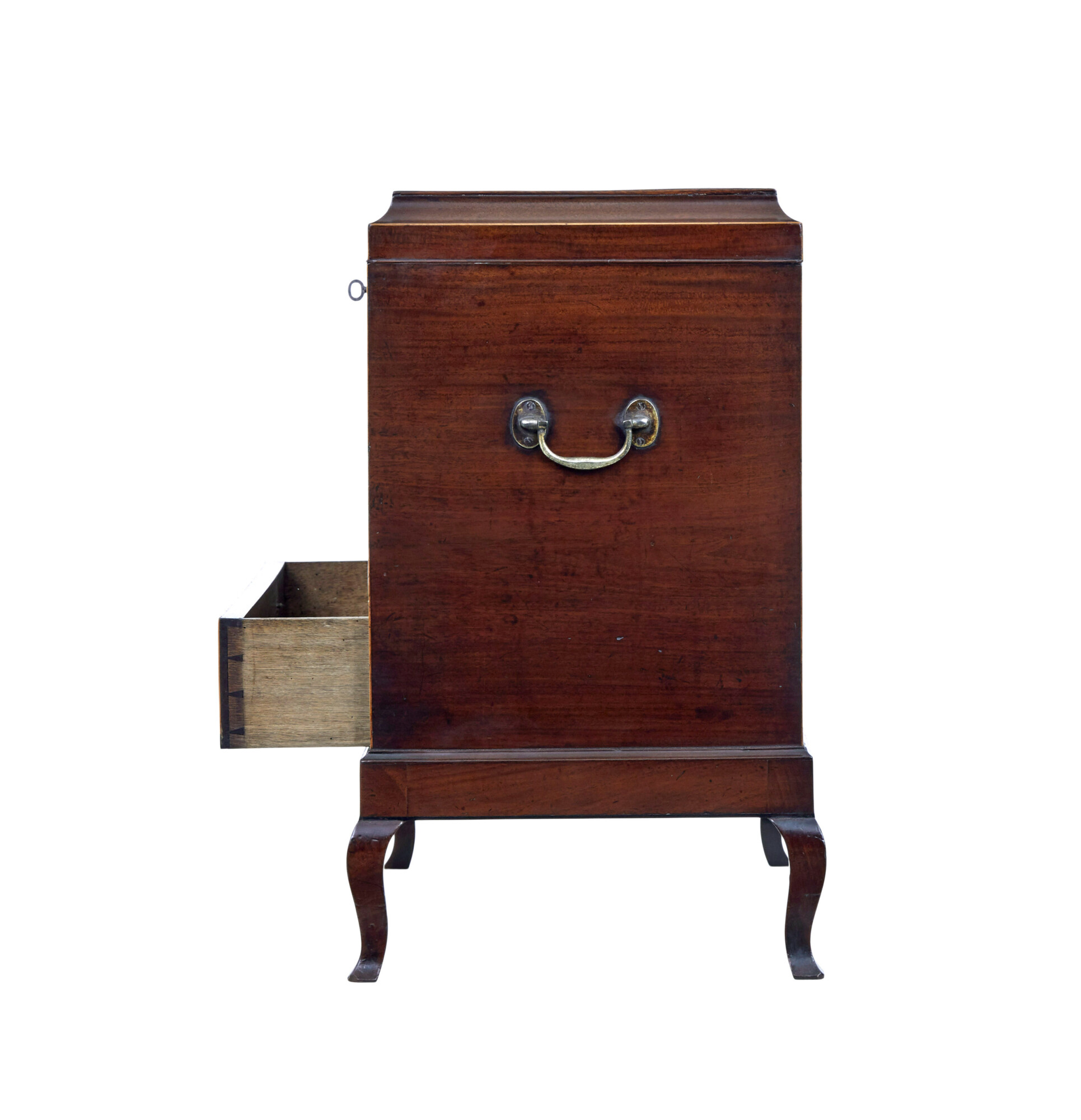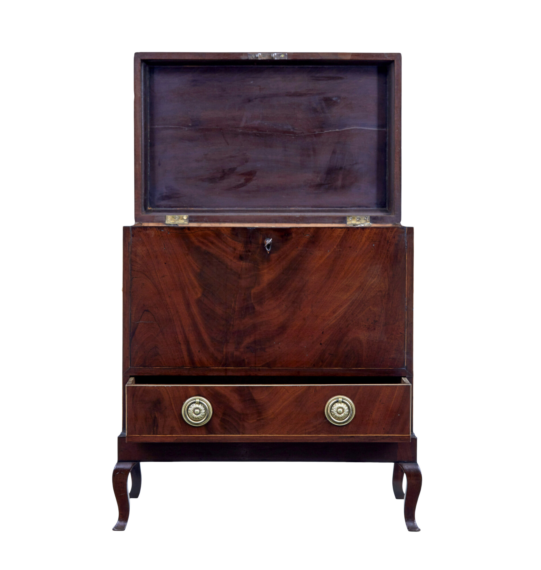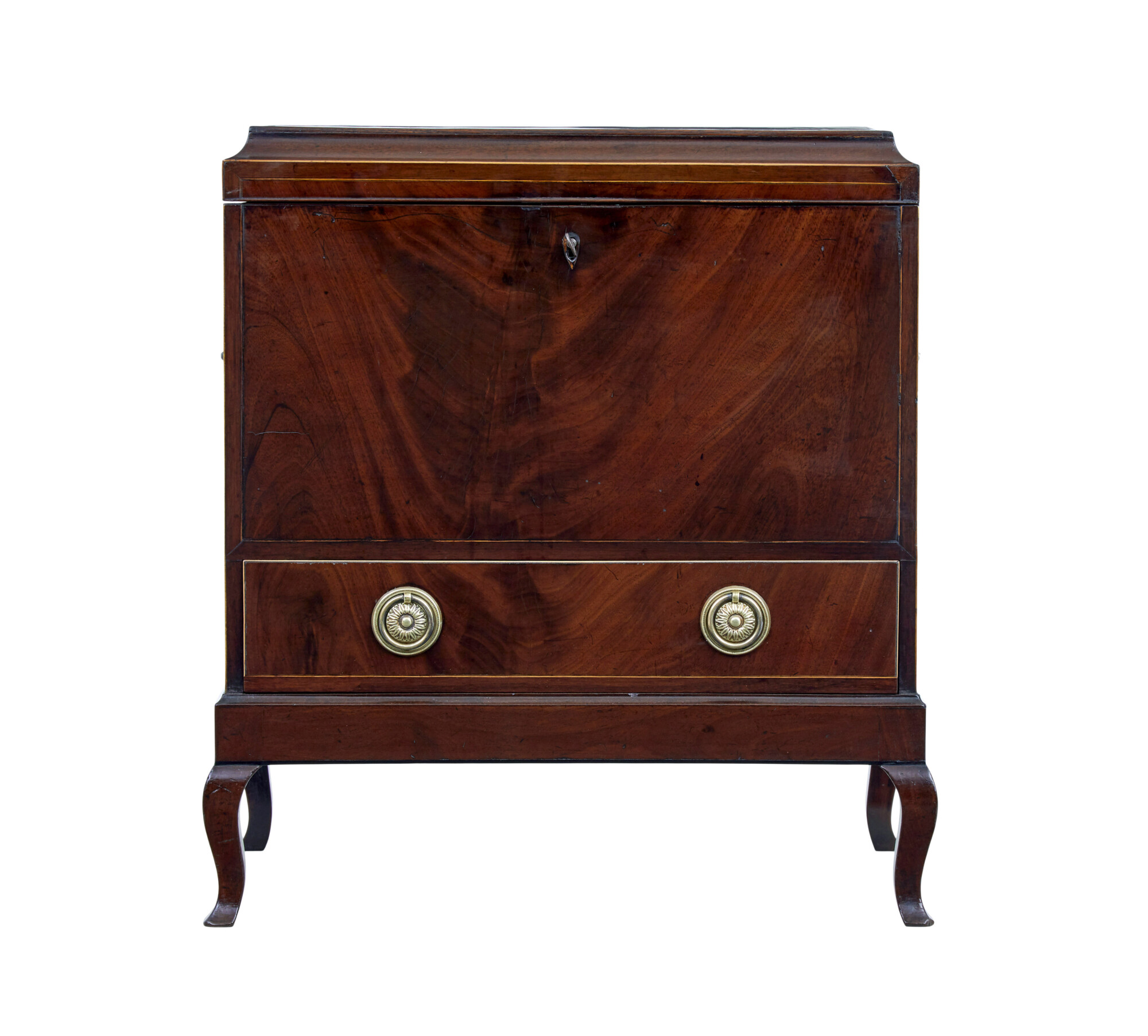 SHERATON REVIVAL WINE COOLER CELLARETTE. TOP WITH OVAL STRINGING AND INLAID EBONY. LID OPENS TO REVEAL COMPARTMENTS FOR BOTTLE STORAGE, DRAWER BELOW. STANDING ON 4 CABRIOLE LEGS.