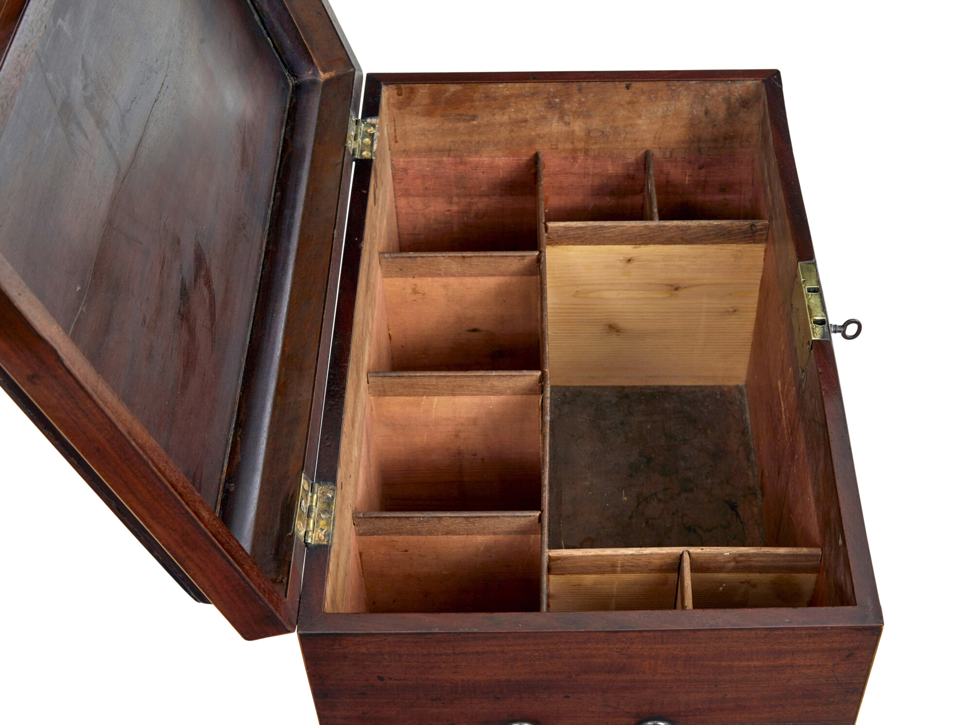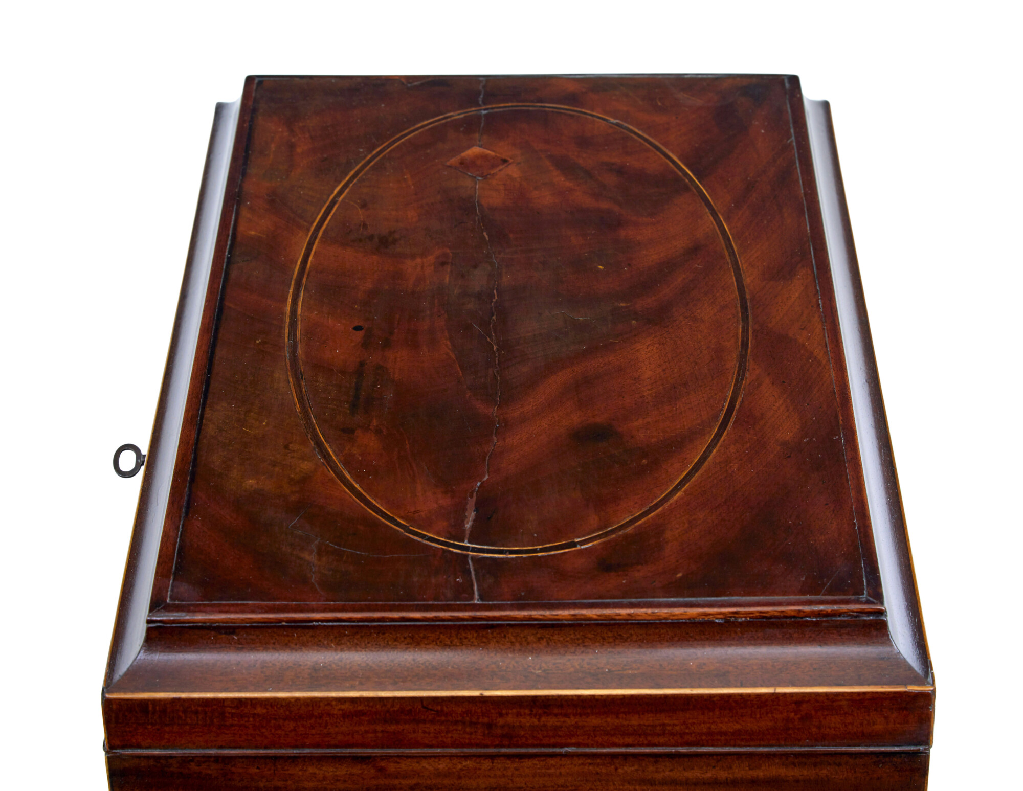 VENEER REPAIR TO TOP SURFACE. RESTORATION TO AGE SPLIT ON LID. MINOR EXPECTED SURFACE MARKS FROM USE.