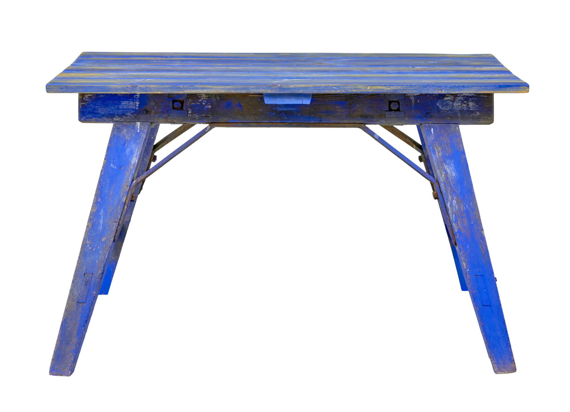 PAINTED INDUSTRIAL TABLE BASE WITH ORIGINAL STRIKING BLUE PAINT, PRESENTED WITH AN ASSOCIATED PINE TOP, WHICH WOULD HAVE BEEN DONE IN THE MID 20TH CENTURY.