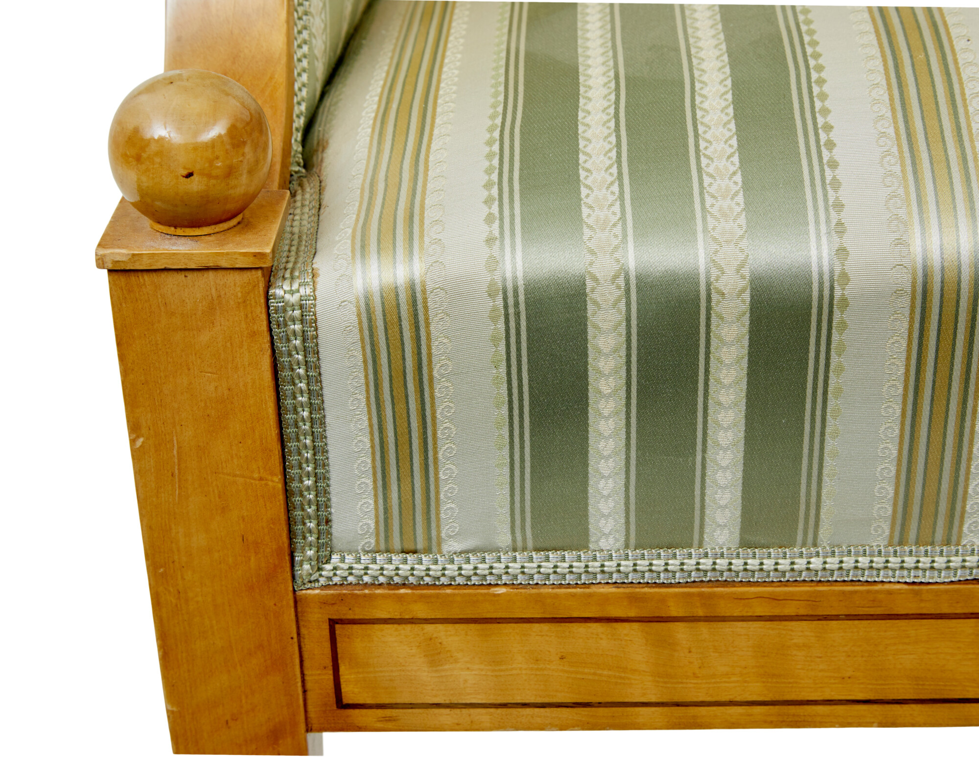 HIGH SHAPED BACKS, SHOWFRAME SIDES AND SCROLLING ARMS, TURNED BALLS IN LINE WITH THE SEAT, EACH STANDING ON FOUR TAPERED LEGS. STRUNG WITH WALNUT TO THE BACK REST BOTH SIDES AND TO THE FREIZE. RICHLY UPHOLSTERED IN GREEN SCHEMED FABRIC AND MATCHING BRAIDING.