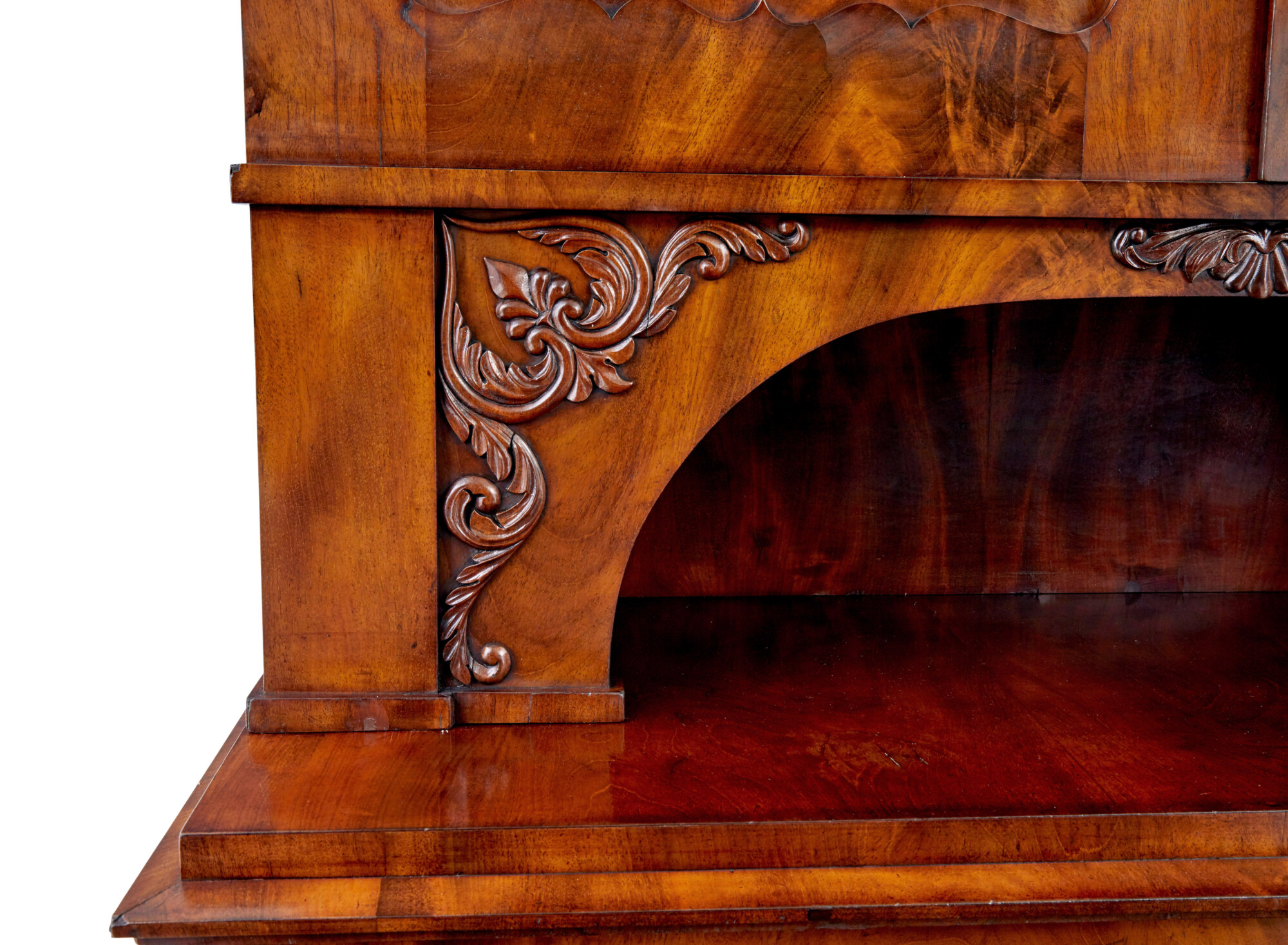 RICH GOLDEN COLOUR TO THE MATCHED FLAME MAHOGANY VENEERS, MINOR SURFACE MARKS AND RESTORATIONS TO VENEER.