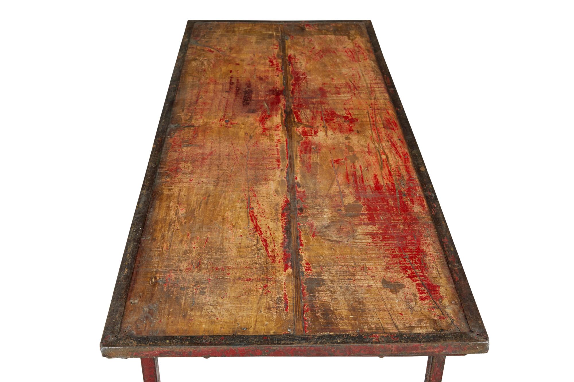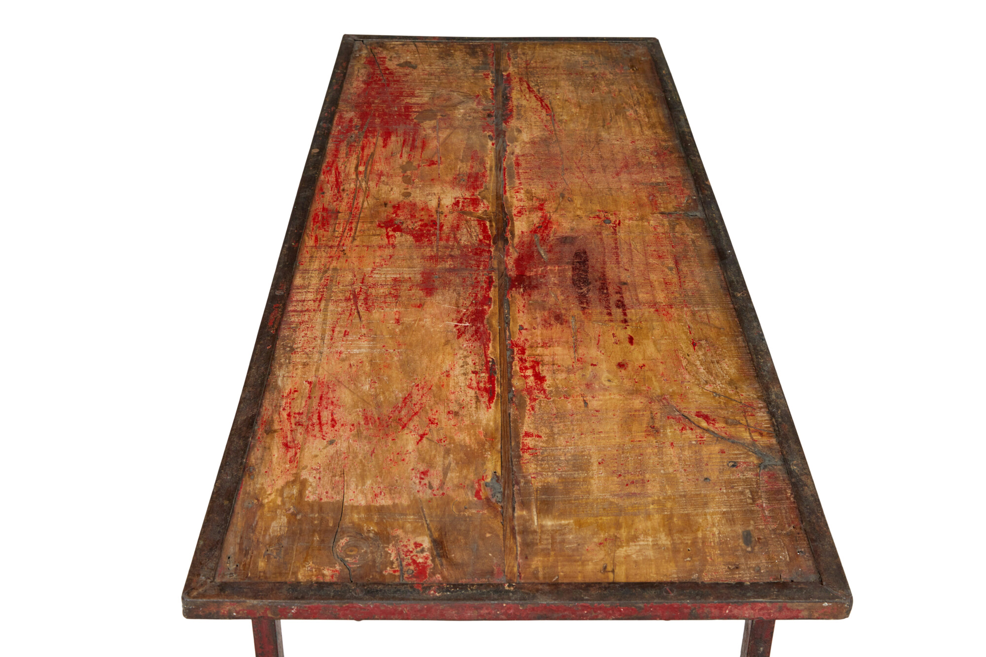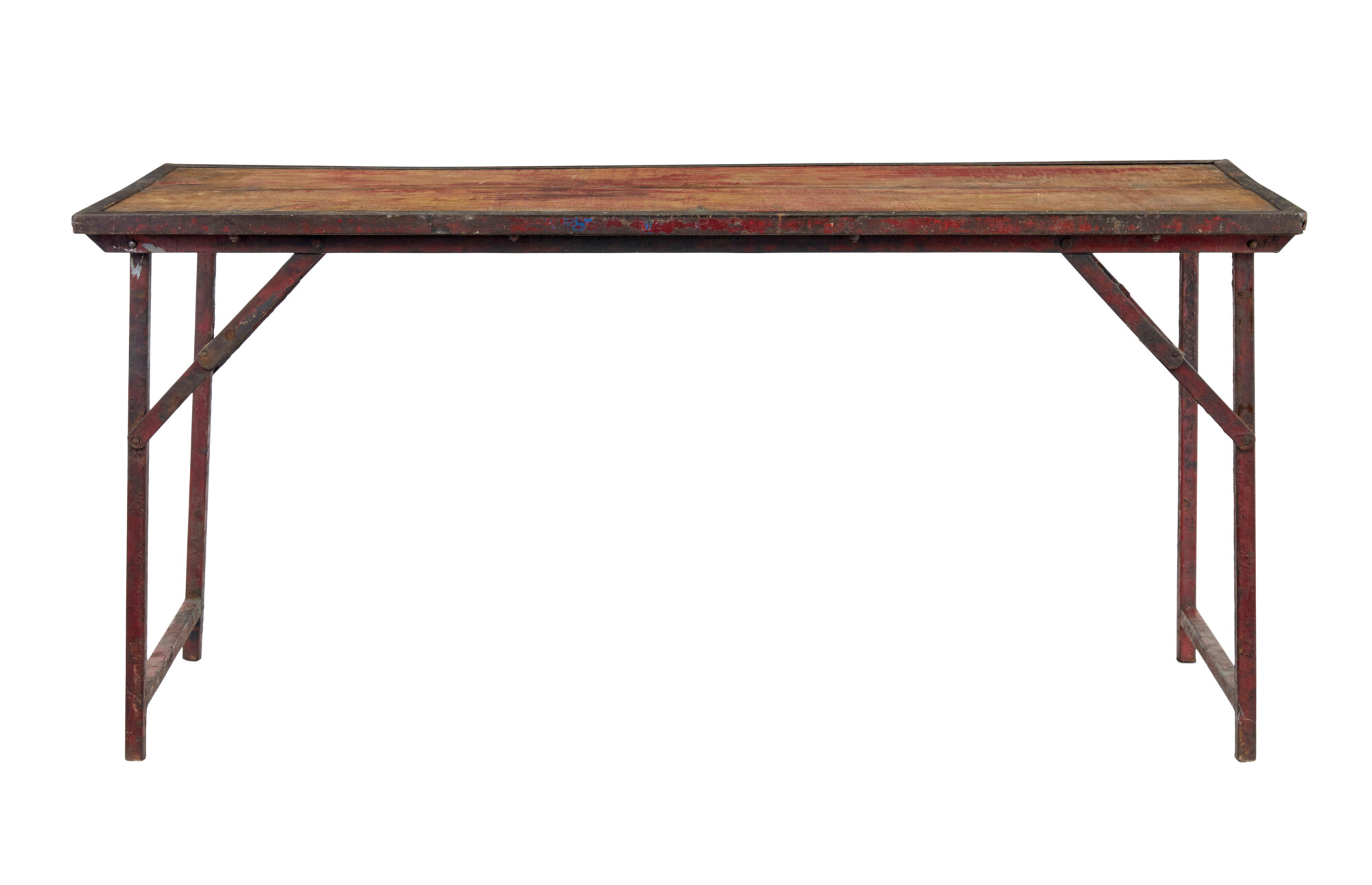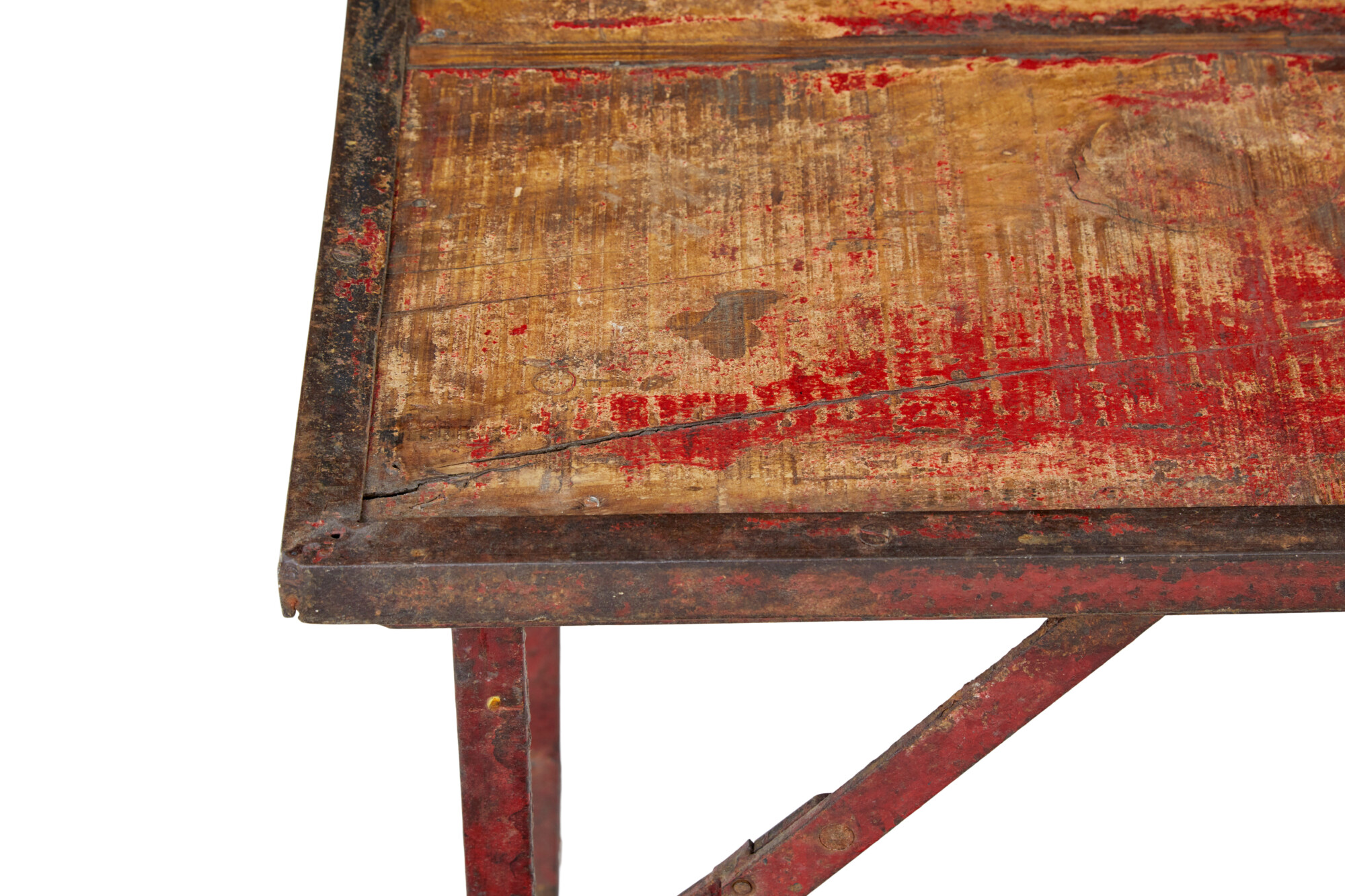 2 PLANK TOP WITH TRACES OF ORIGINAL PAINT, ENCASED IN A IRON FRAME, RAISED ON 2 TUBULAR TRESTLE LEGS WITH FOLDING SUPPORTS.