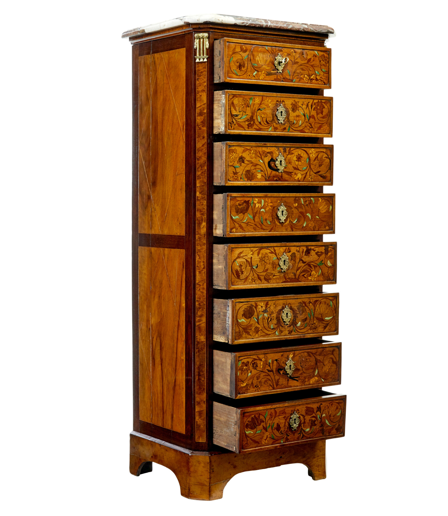 STUNNING LOOSE FITTING ORIGINAL MARBLE TOP WITH BULL NOSED EDGE.  FITTED WITH 8 EQUAL SIZED DRAWERS EACH WITH A DIFFERENT INLAID DESIGN OF FLORALS AND BIRDS SET IN VARIOUS EXOTIC WOODS.  CANTED CORNERS WITH ORMOLU MOUNTS AT THE TOP, WITH STRUNG AND BURR WALNUT BORDER.  EACH SIDE WITH A DARK WALNUT BORDER AND DIAMOND SHAPED STRINGING.  ALL RAISED ON A BRACKET FOOT BASE.