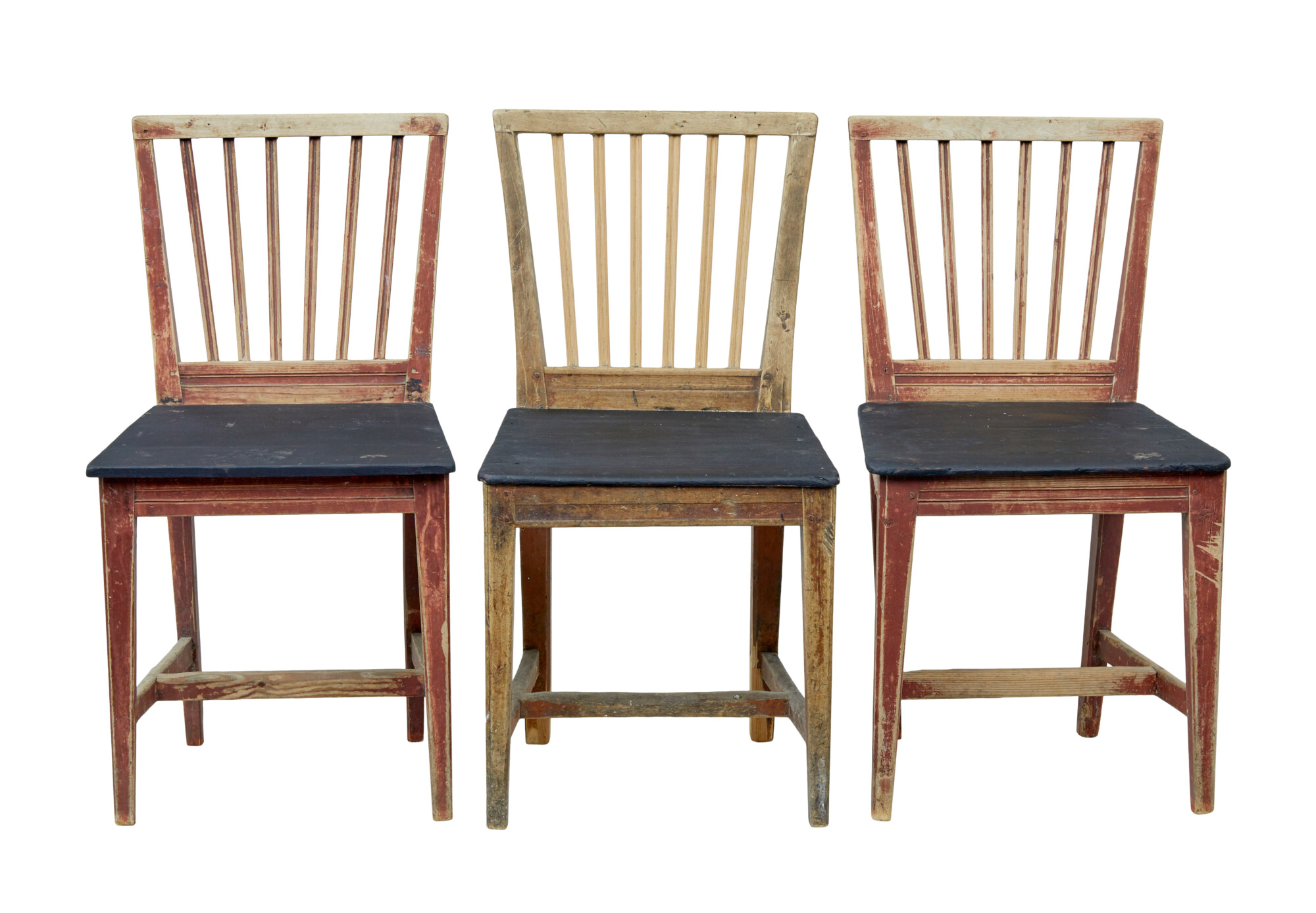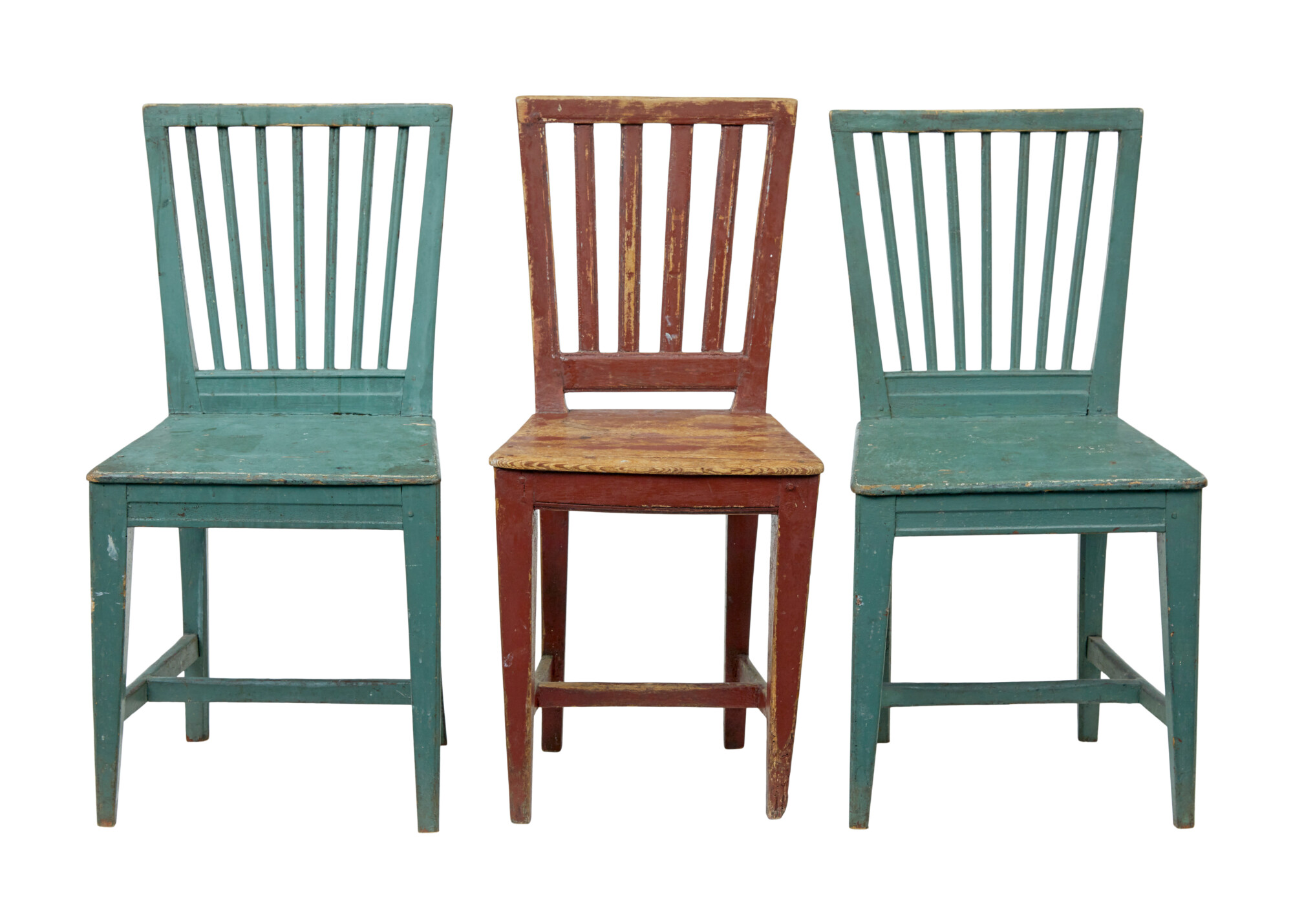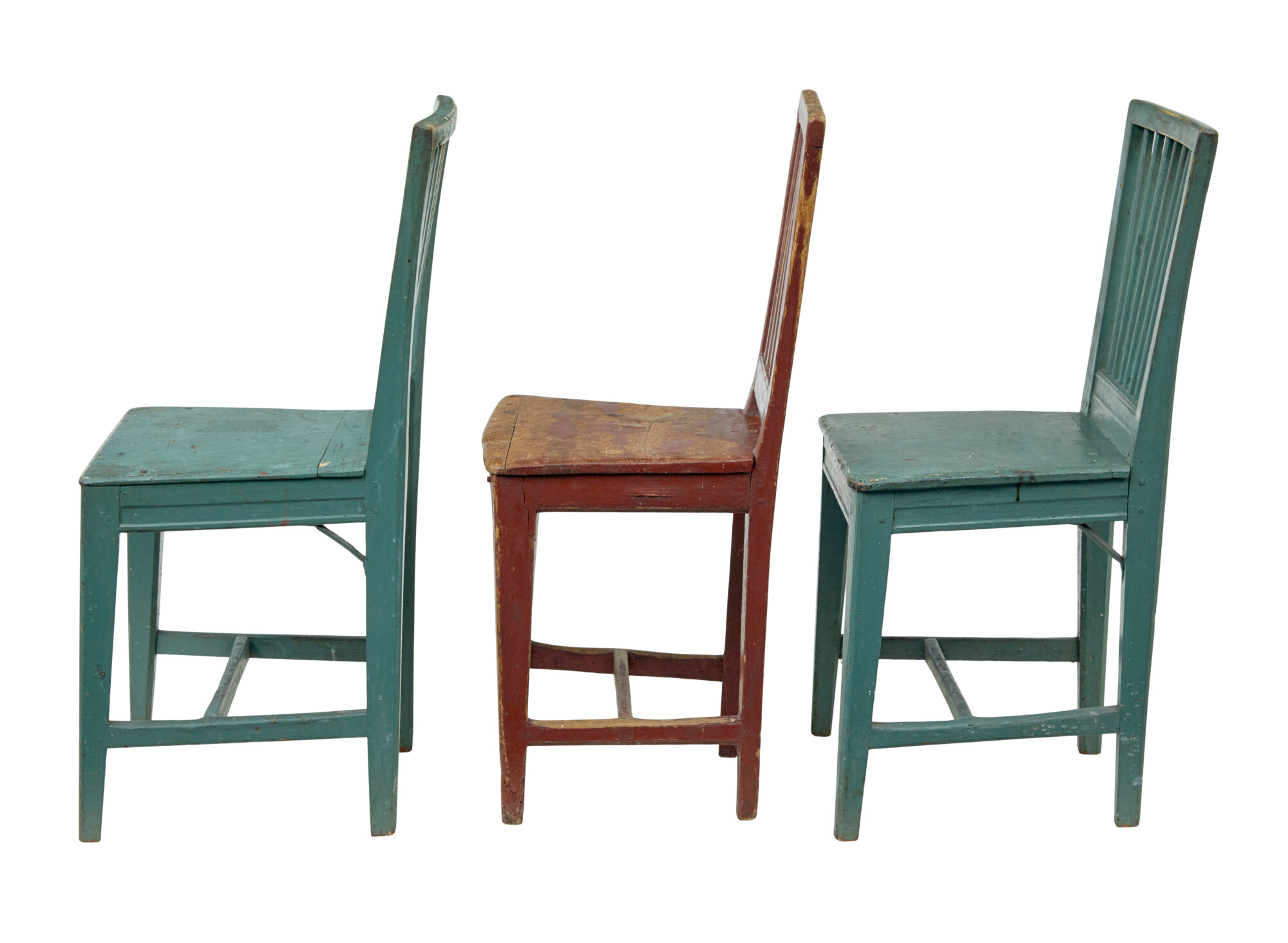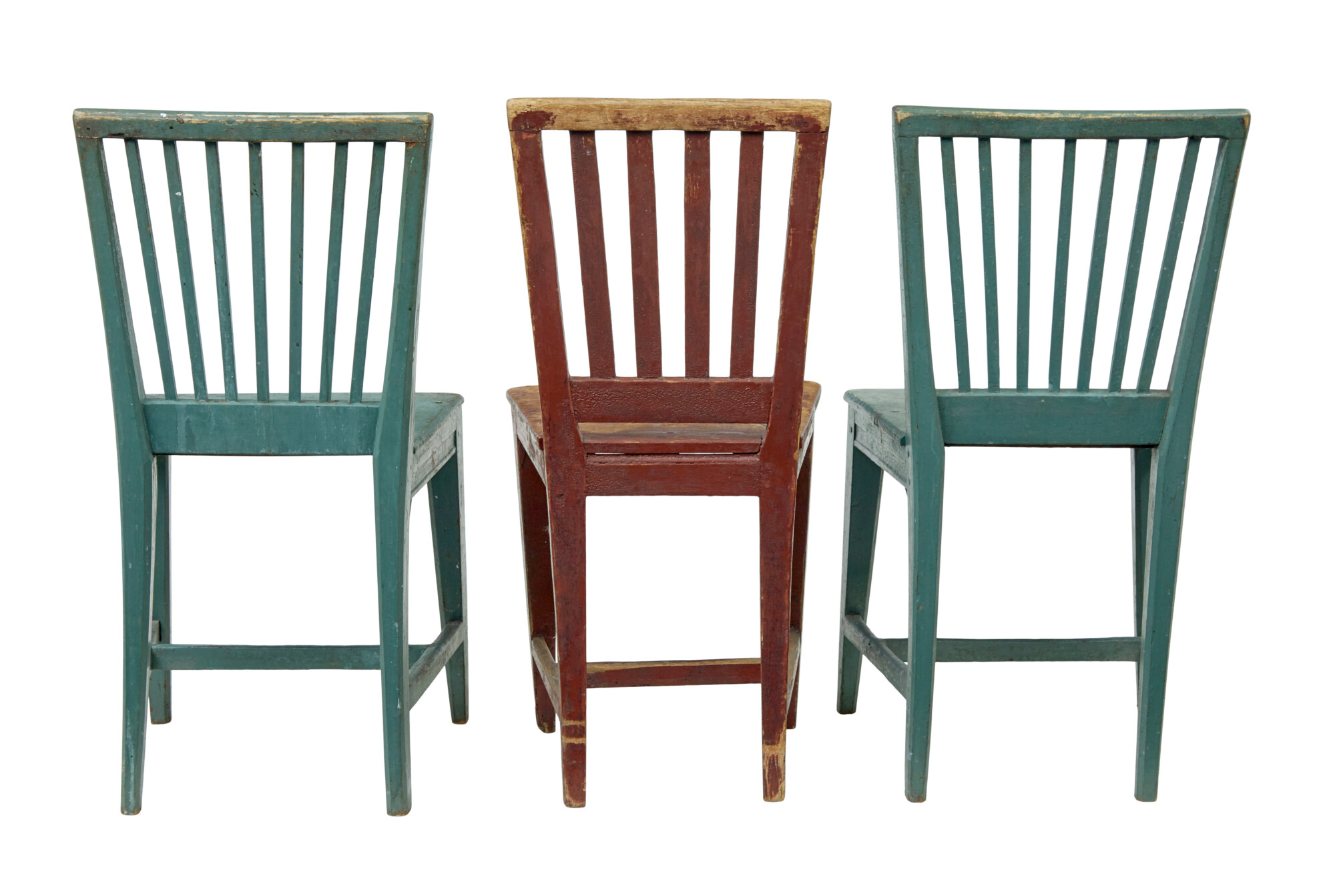 WE ARE CALLING THESE ARE HARLEQUIN SET AS THEY SLIGHTLY VARY IN PROPORTIONS AND OBVIOUSLY COLOUR, BUT HAVE BEEN TOGETHER AS A SET FOR A LONG TIME. 3 OF THE SAME COLOUR WITH LATER BLACK SEATS, A PAIR IN A LOVELY MUTED GREEN AND A SINGLE CHAIR IN A BROWN/RED.