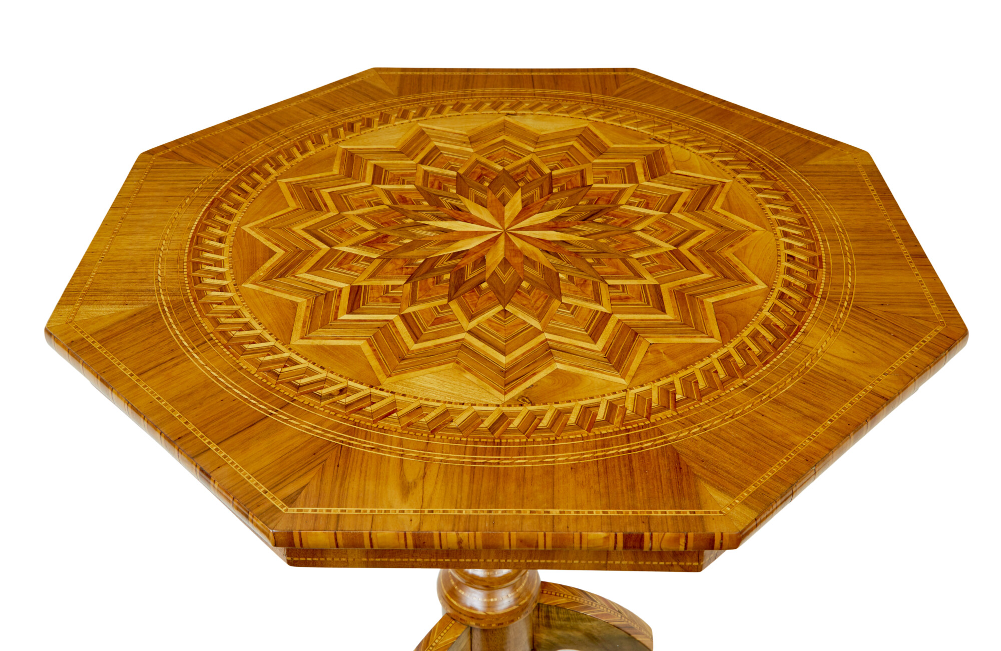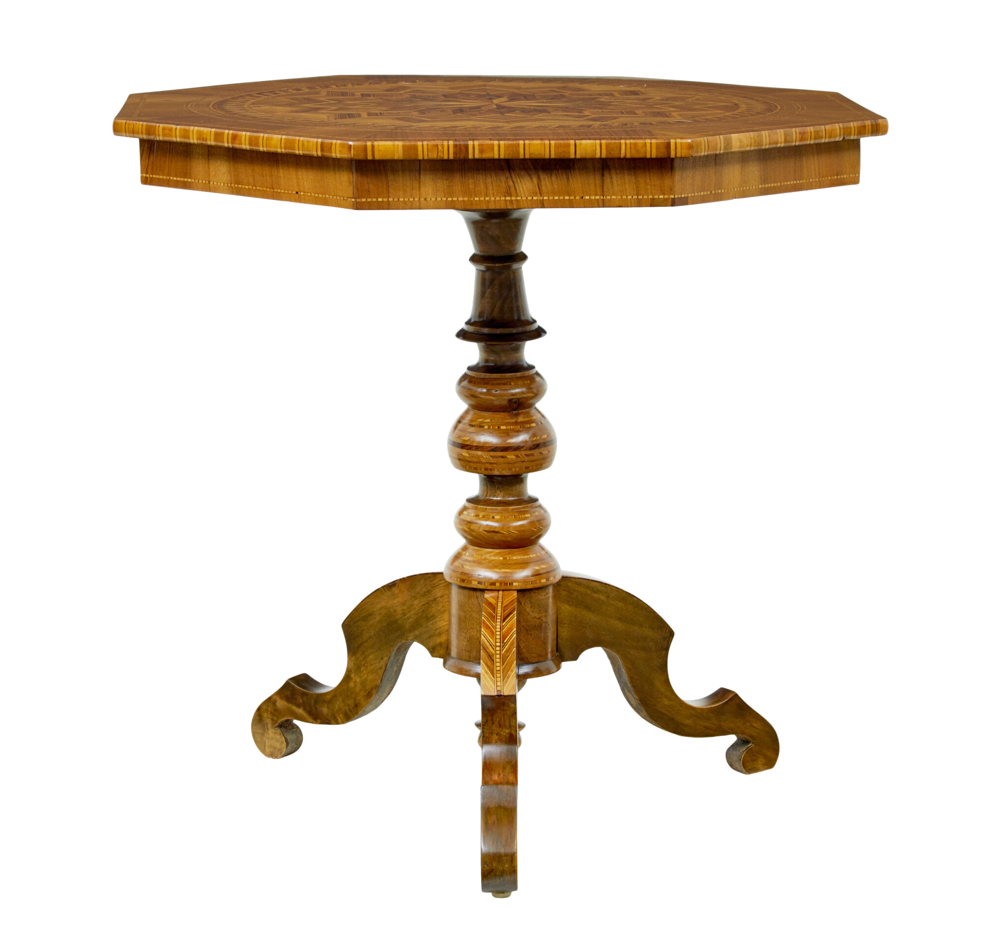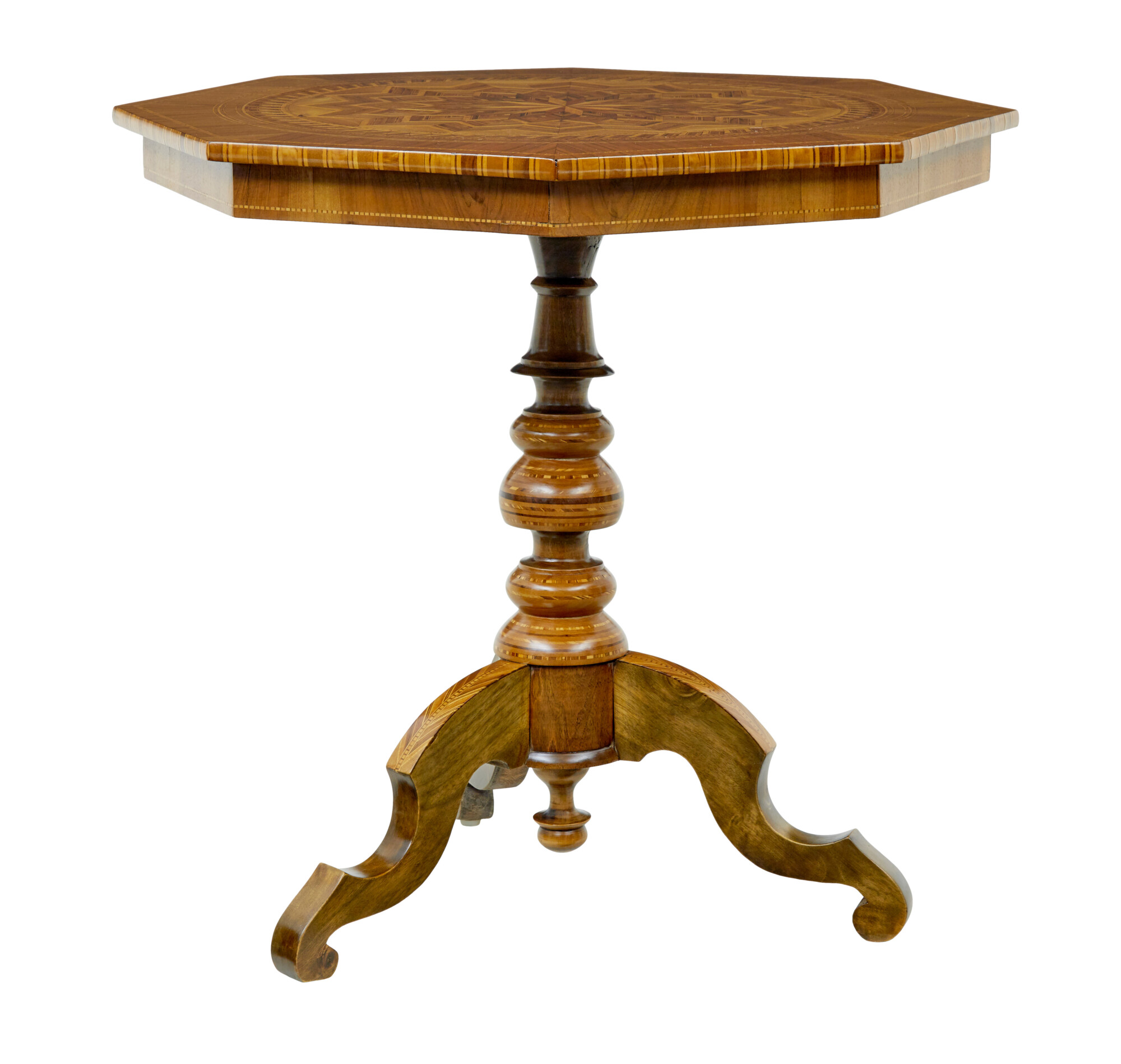 STUNNING GEOMETRIC DESIGN WITH FANS IS WAY OUT FROM THE CENTRE, INLAID WITH CONTRASTING COLOURED VENEERS TO CREATE A STUNNING PATTERN. FURTHER INLAY TO THE EDGE AND FREIZE. SUPPORTED ON A TURNED WALNUT STEM BASE, WITH FURTHER INLAY AND A TURNED FINIAL TO THE BOTTOM. RAISED ON 3 SCROLLED LEGS, COMPLETE WITH EVEN MORE INLAY.