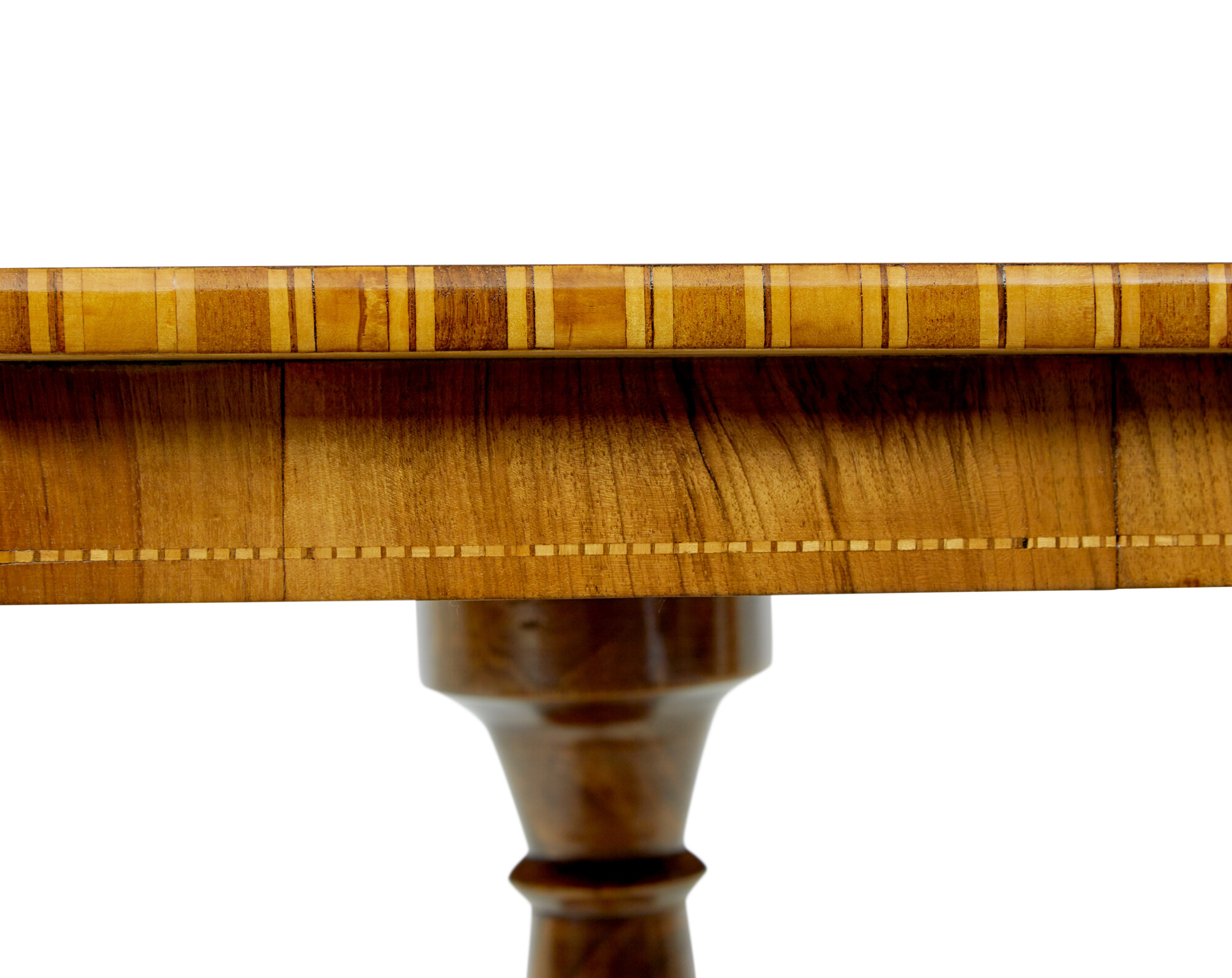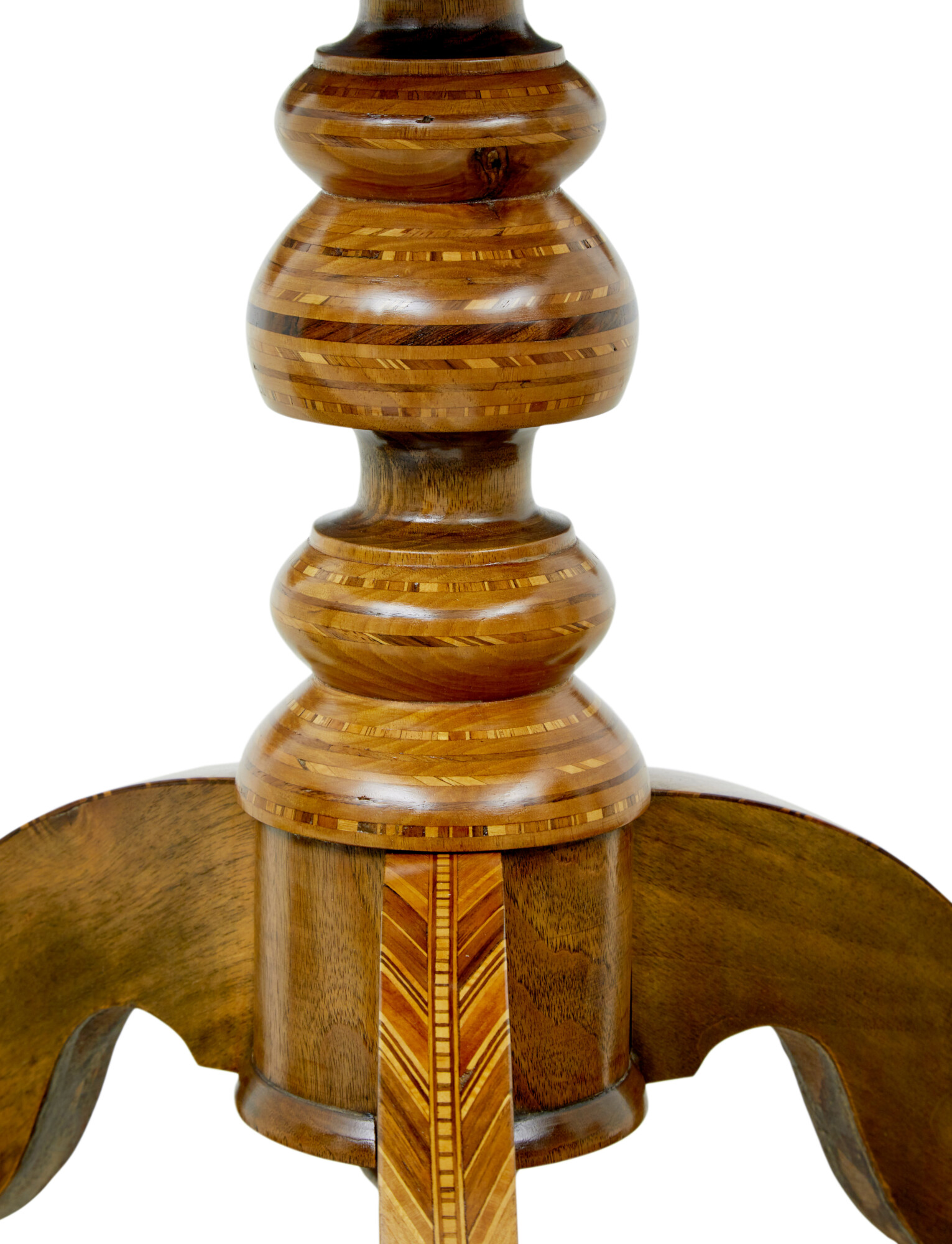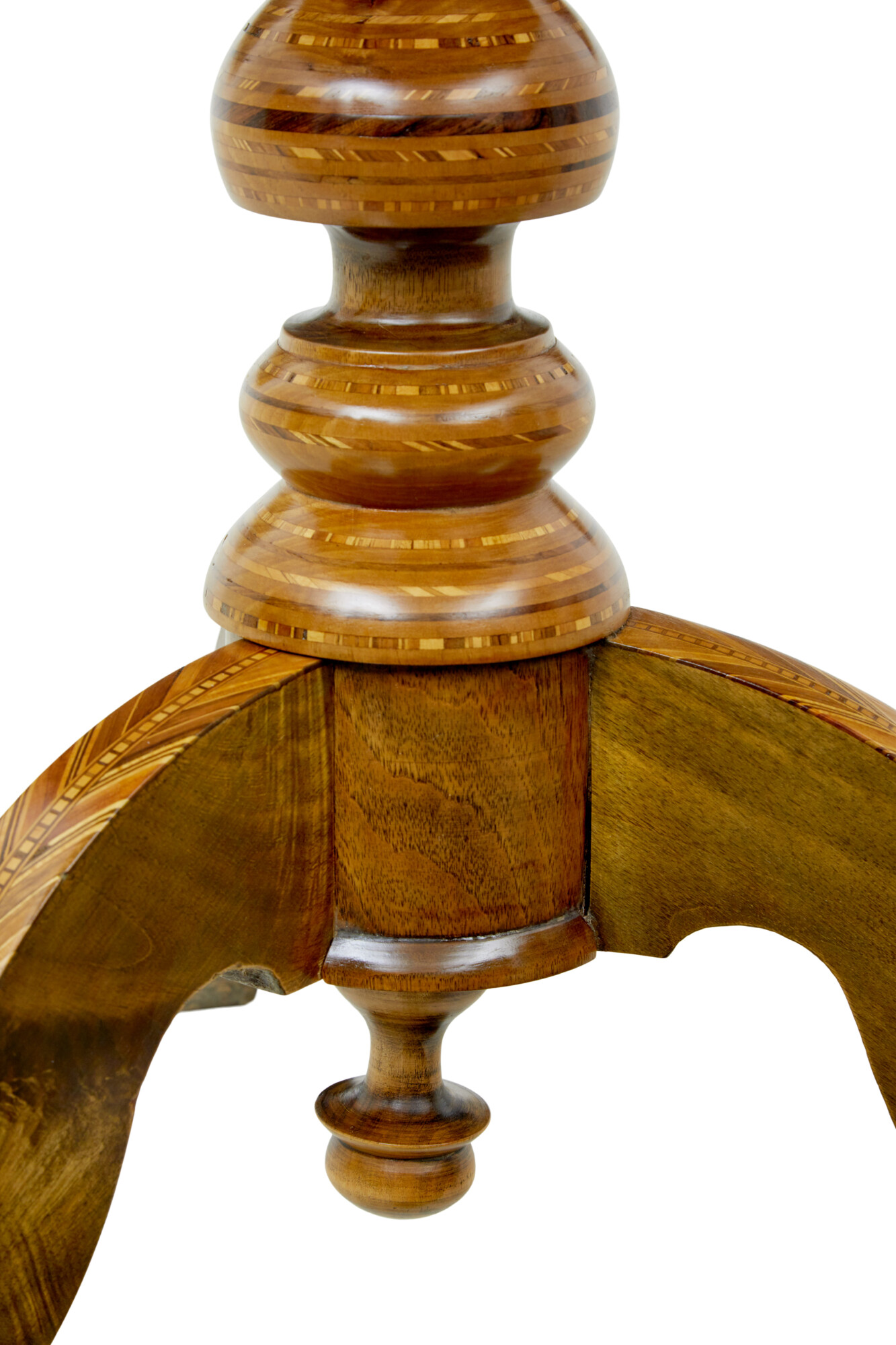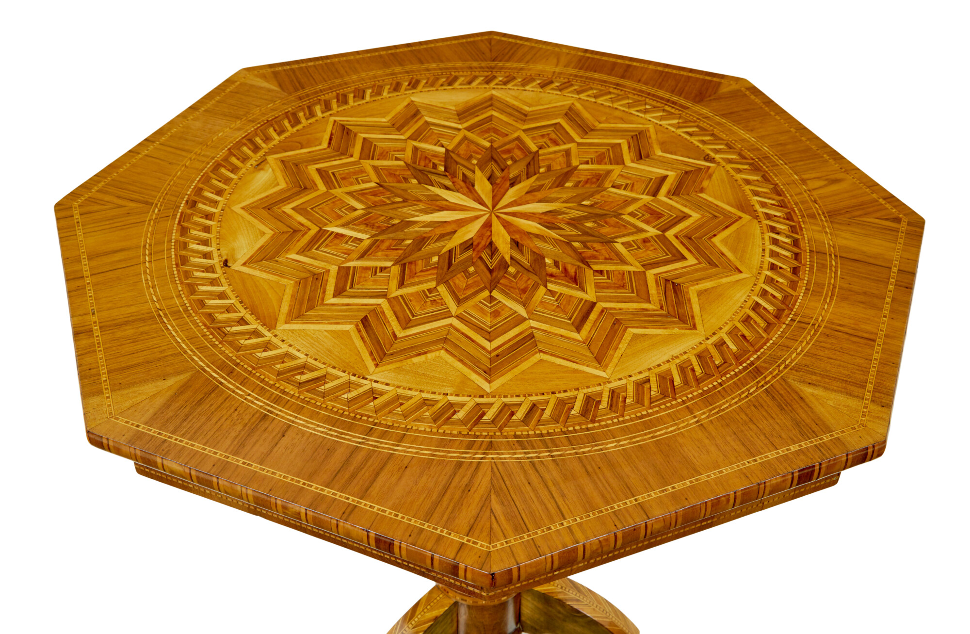 STUNNING GEOMETRIC DESIGN WITH FANS IS WAY OUT FROM THE CENTRE, INLAID WITH CONTRASTING COLOURED VENEERS TO CREATE A STUNNING PATTERN. FURTHER INLAY TO THE EDGE AND FREIZE. SUPPORTED ON A TURNED WALNUT STEM BASE, WITH FURTHER INLAY AND A TURNED FINIAL TO THE BOTTOM. RAISED ON 3 SCROLLED LEGS, COMPLETE WITH EVEN MORE INLAY.