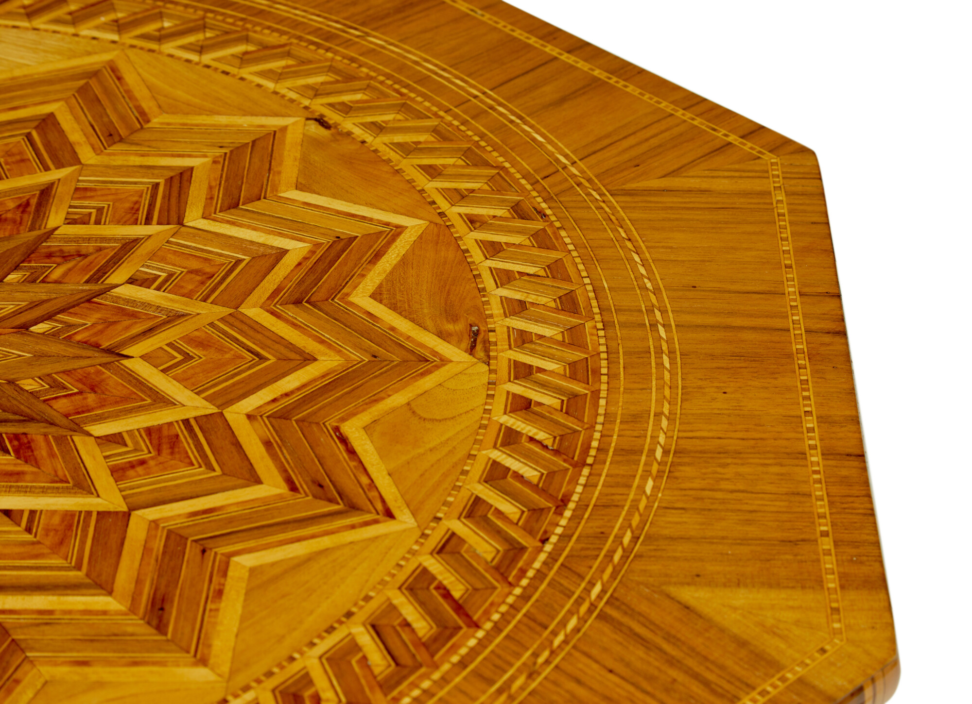 FINE QUALITY OCTAGONAL TABLE BEAUTIFUL INLAID WITH OLIVE, WALNUT AND VARIOUS SPECIMEN WOODS.