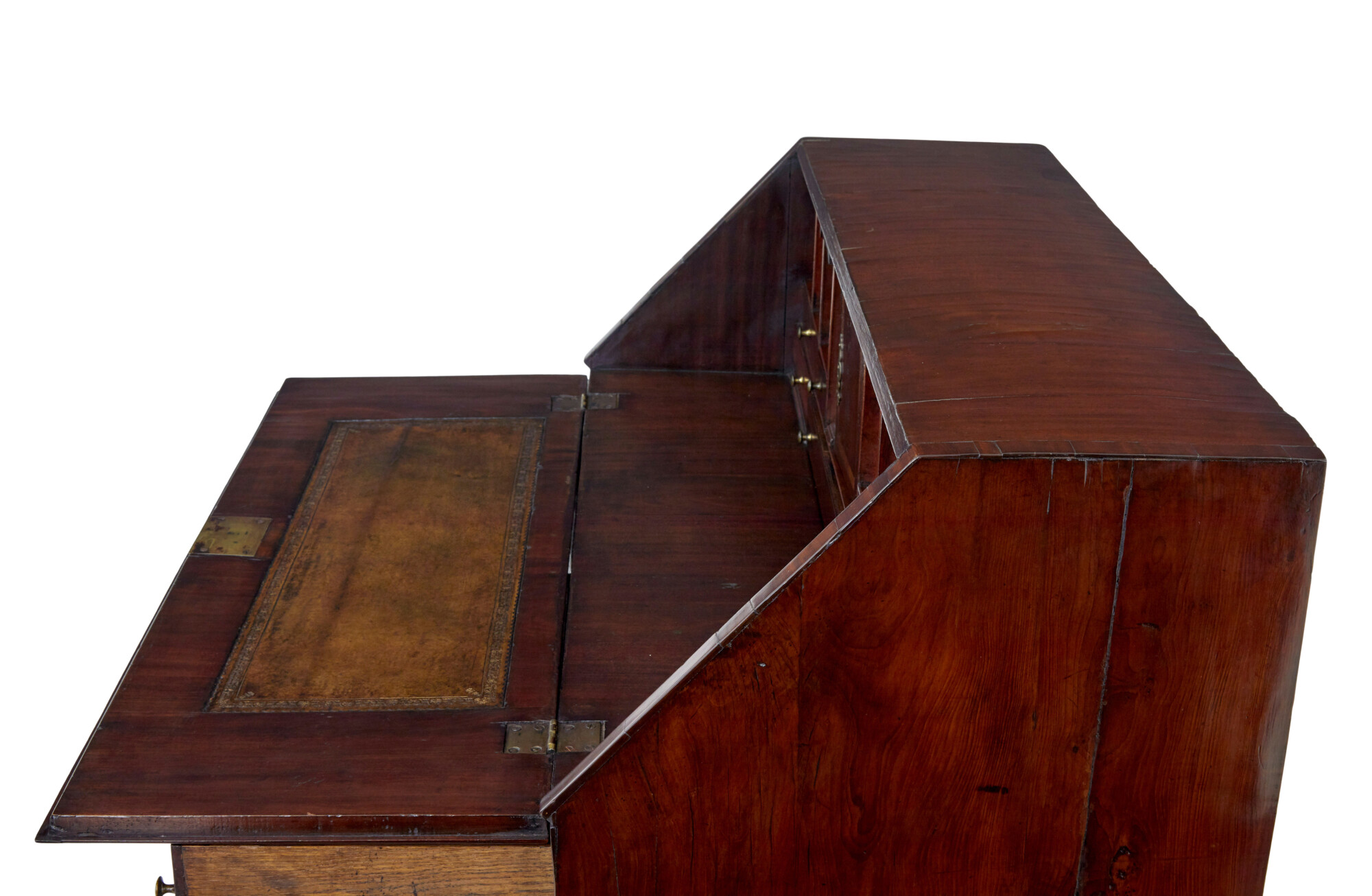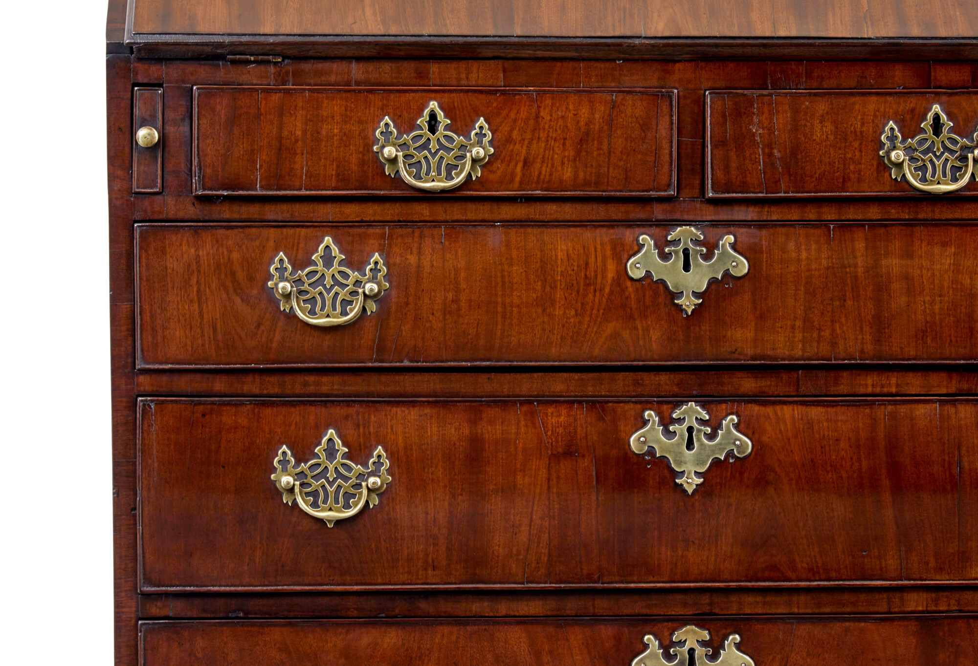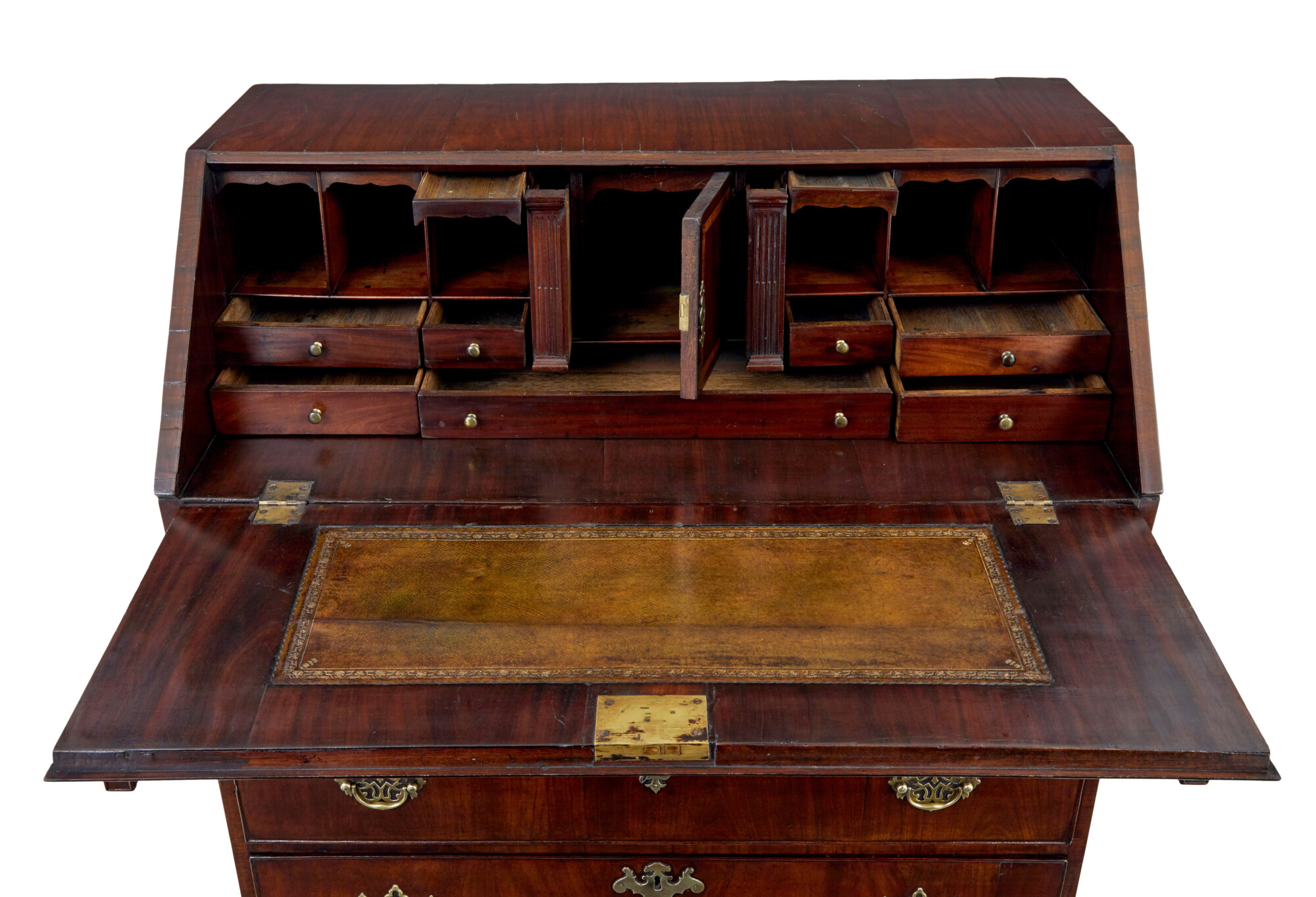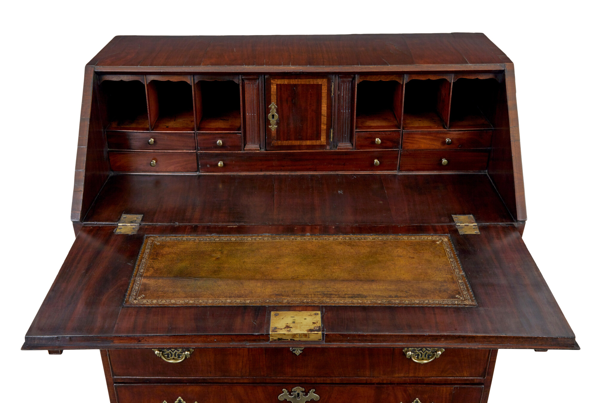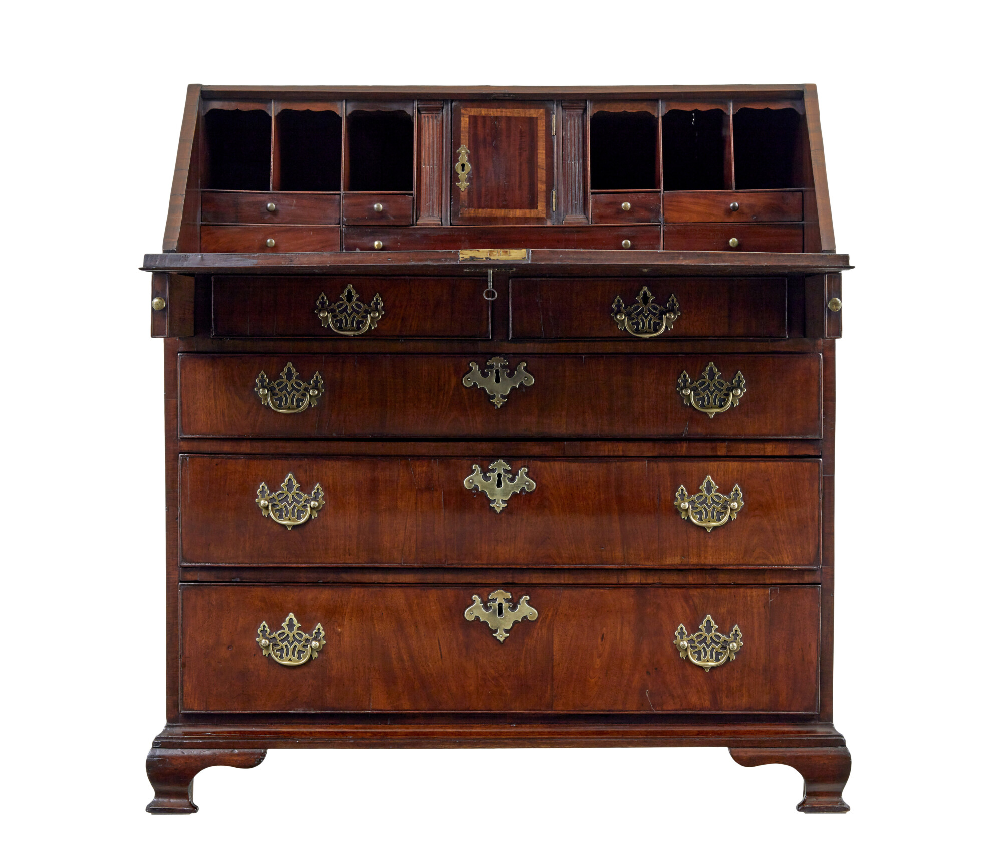 FALL DROPS DOWN ONTO PULL OUT SLIDES TO PROVIDE THE WRITING SURFACE, WITH AN INSET LEATHER PANEL WITH GOLD TOOLING. FULLY FITTED INTERIOR OF DRAWERS AND SLIDES AND PLENTY OF SECRET DRAWERS AROUND THE CENTRAL INLAID TABERNACLE. BELOW ARE 5 OAK LINED DRAWERS, WITH COCK BEADED EDGING, COMPLETE WITH ORIGINAL ORNATE BRASS HANDLES.