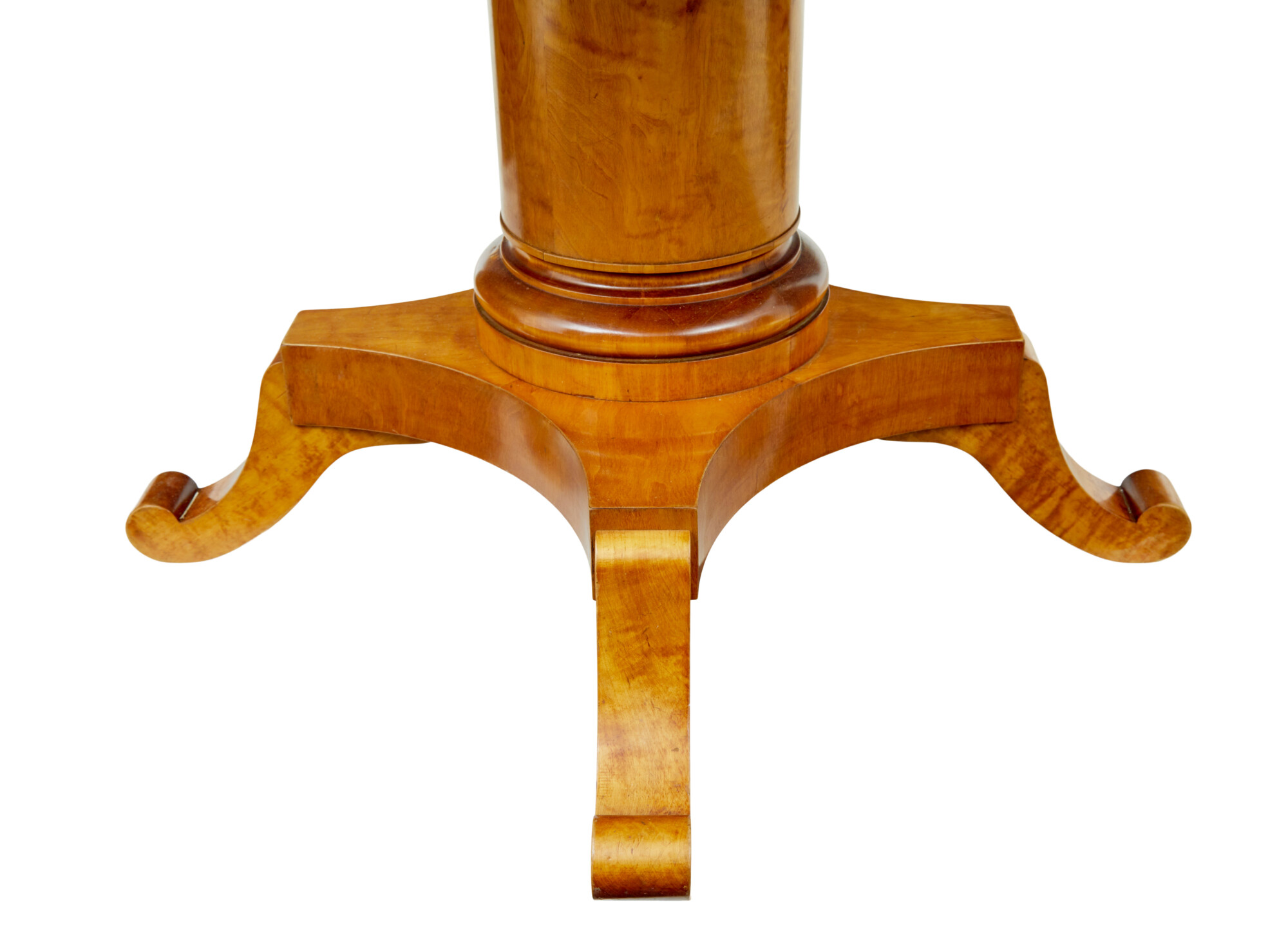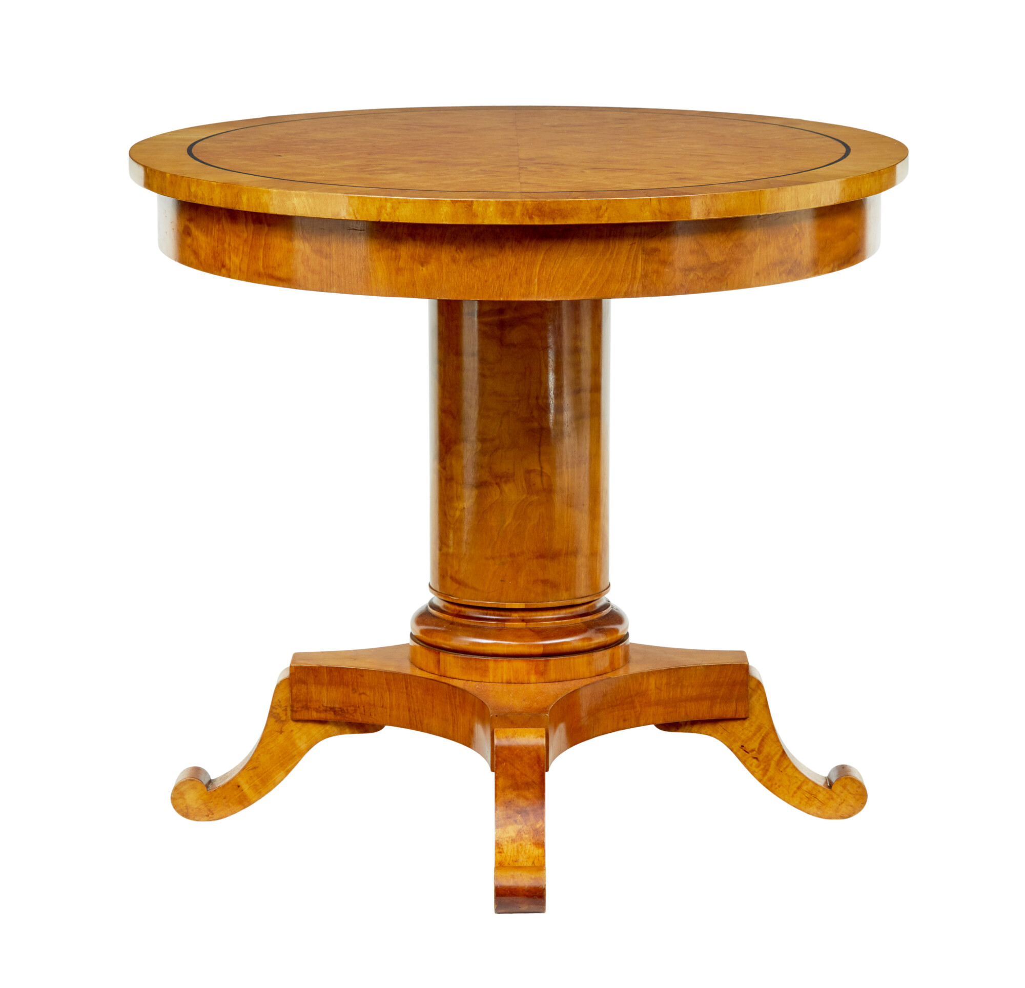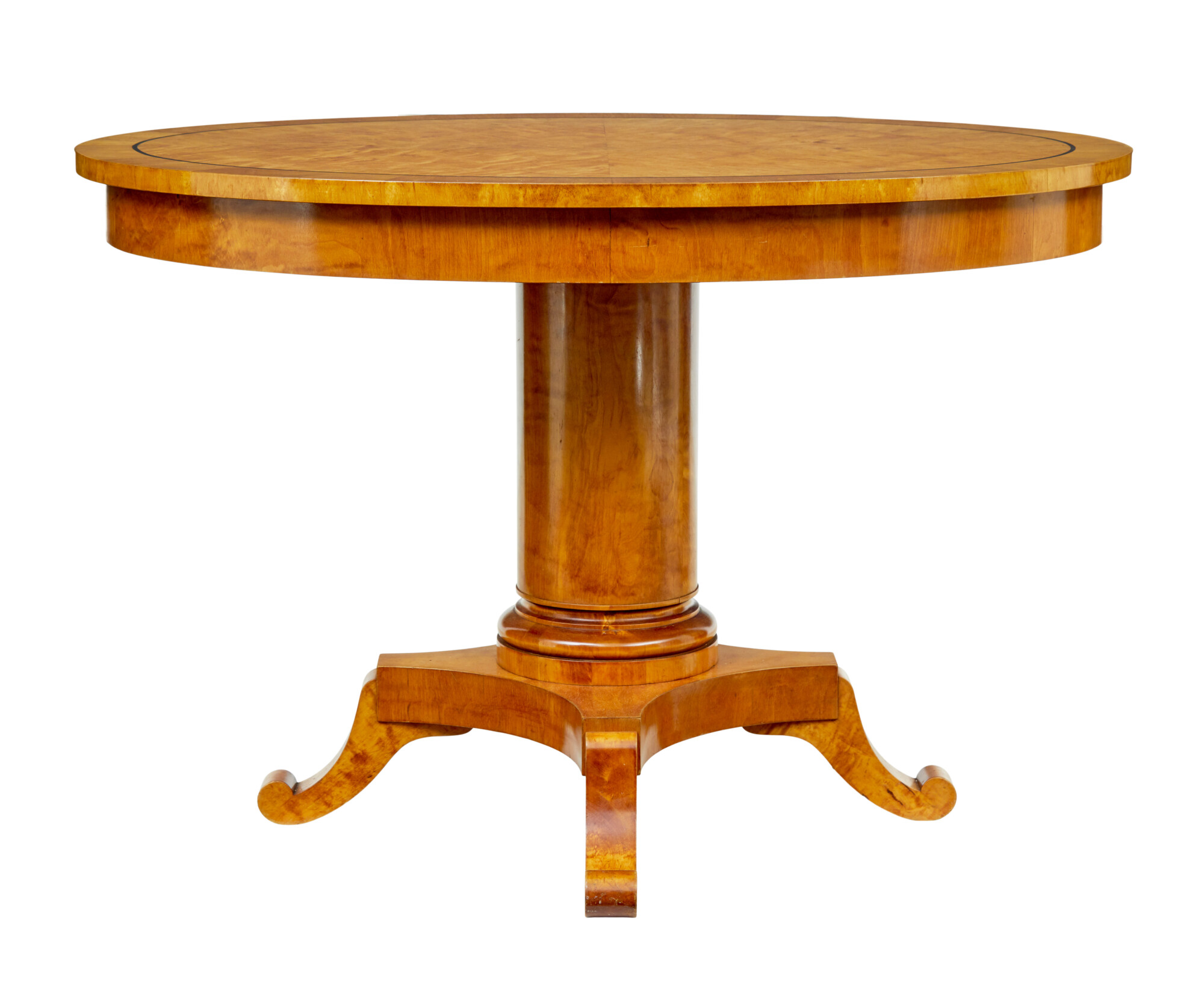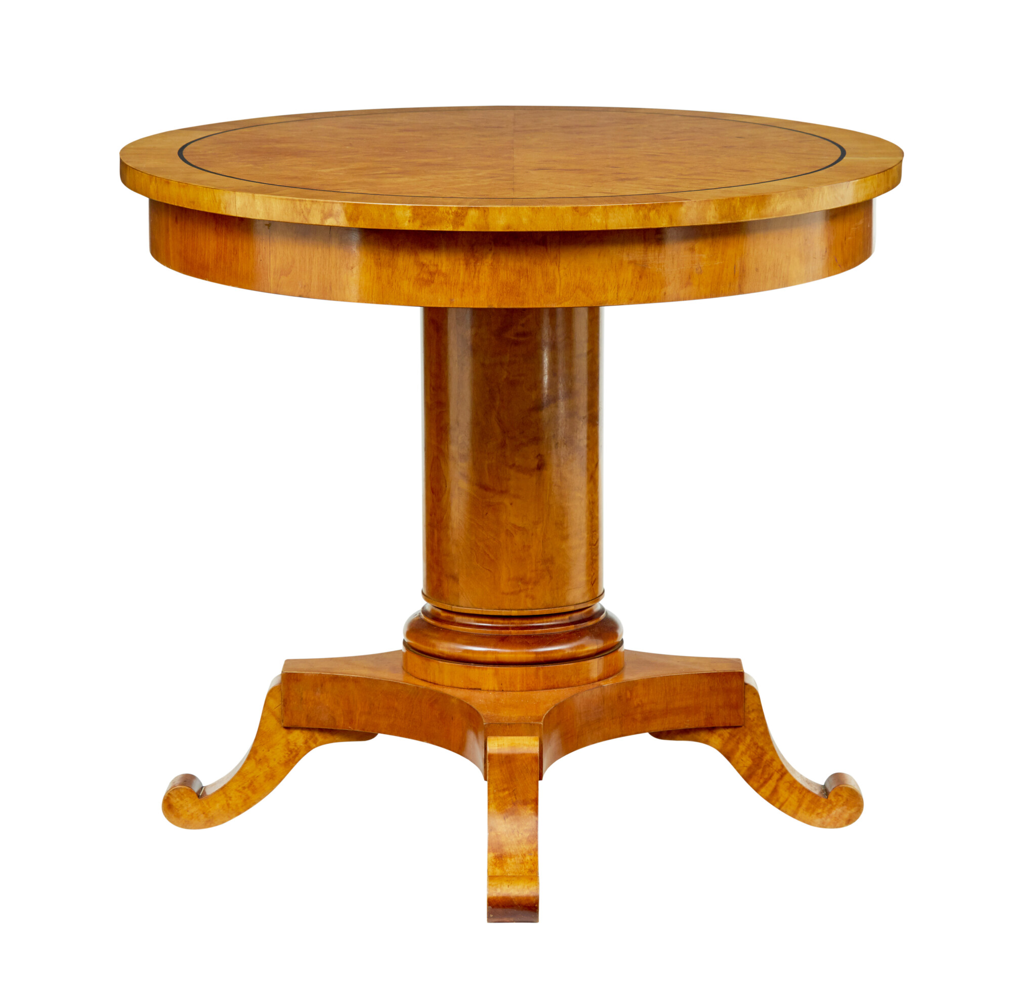 FINE QUALITY KARL JOHAN INSPIRED CENTER TABLE. QUARTER VENEERED FLAME BIRCH TOP WITH AN EBONISED INLAID BORDER AND FURTHER CROSS BANDED EDGE. TOP IS RAISED ON A COLUMN BASE, TURNED COLLAR WHICH LINKS TO THE QUADRIFORM BASE AND 4 SCROLLED LEGS.